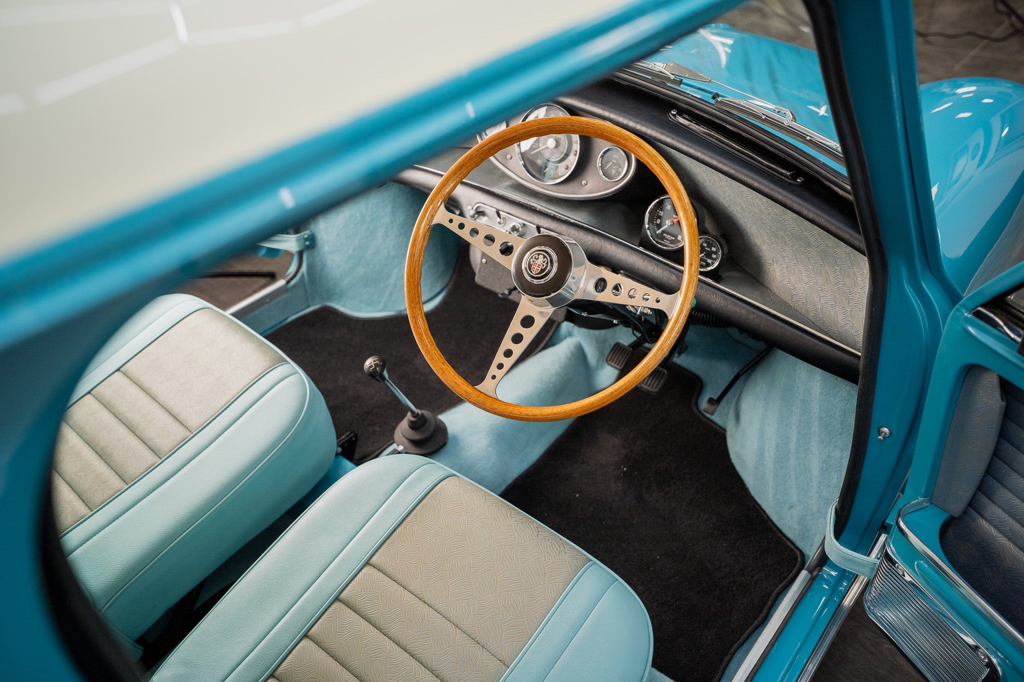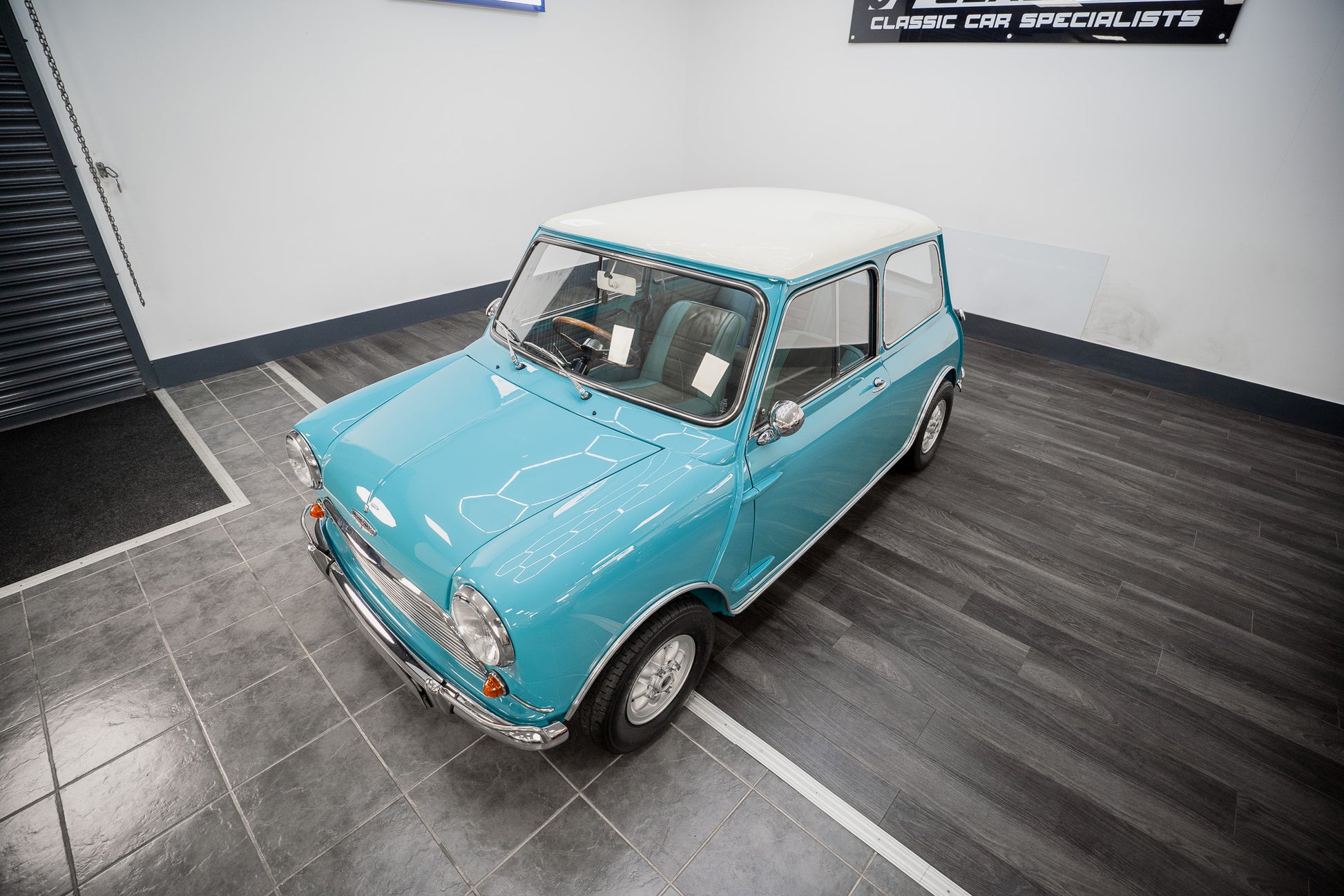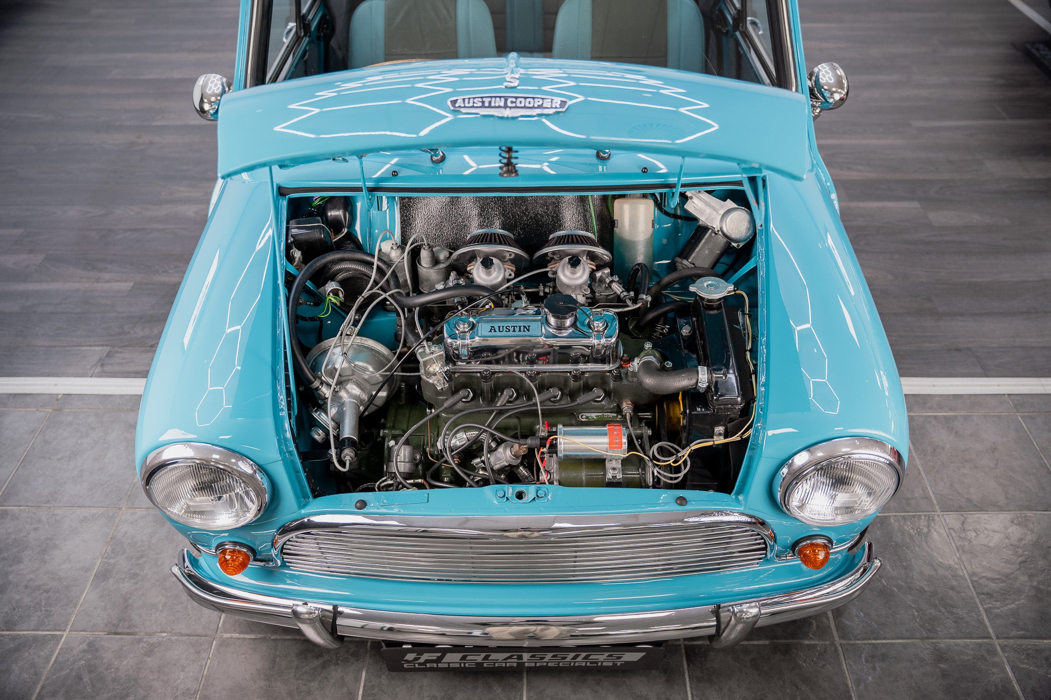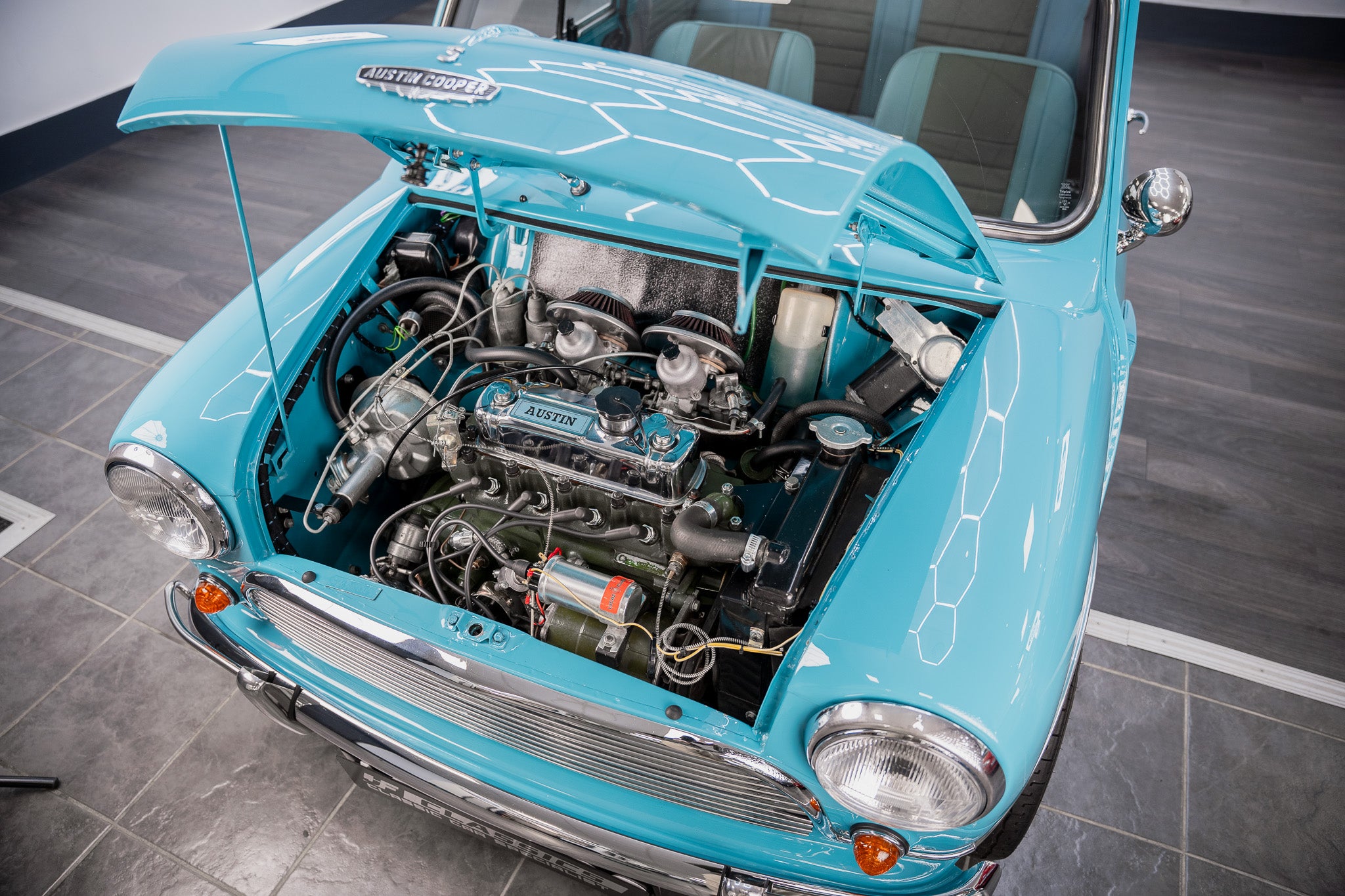 Expense was not an issue including ‘NOS’ Hydrolastic displacers fitted along with all consumables where required. Finished in Austin ‘Surf Blue’ body paint along with traditional ‘Old English’ white paintwork to the roof