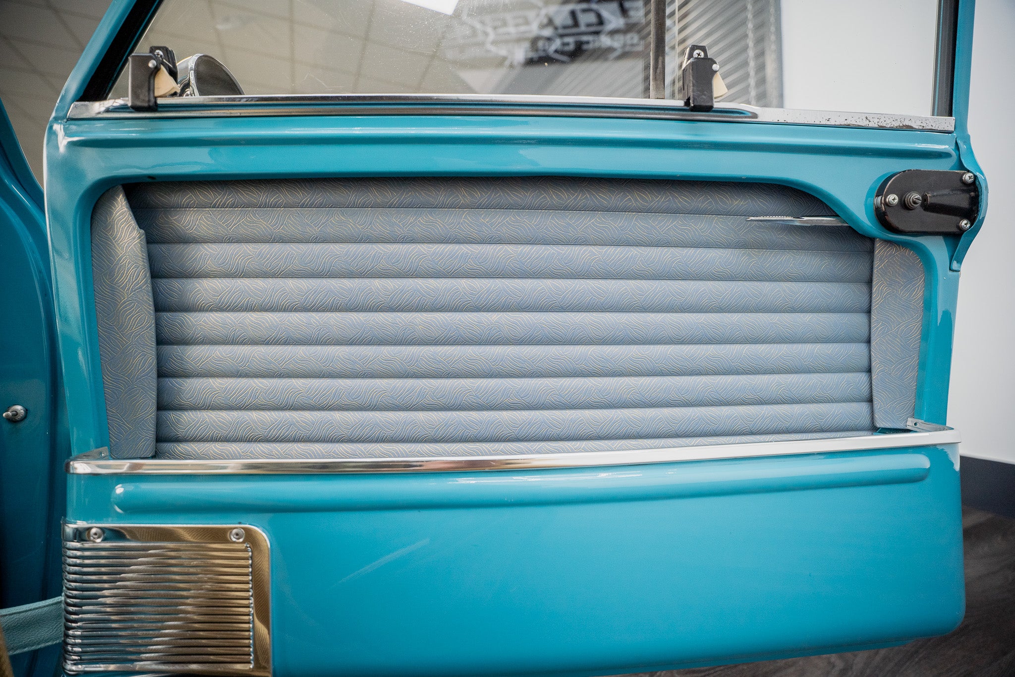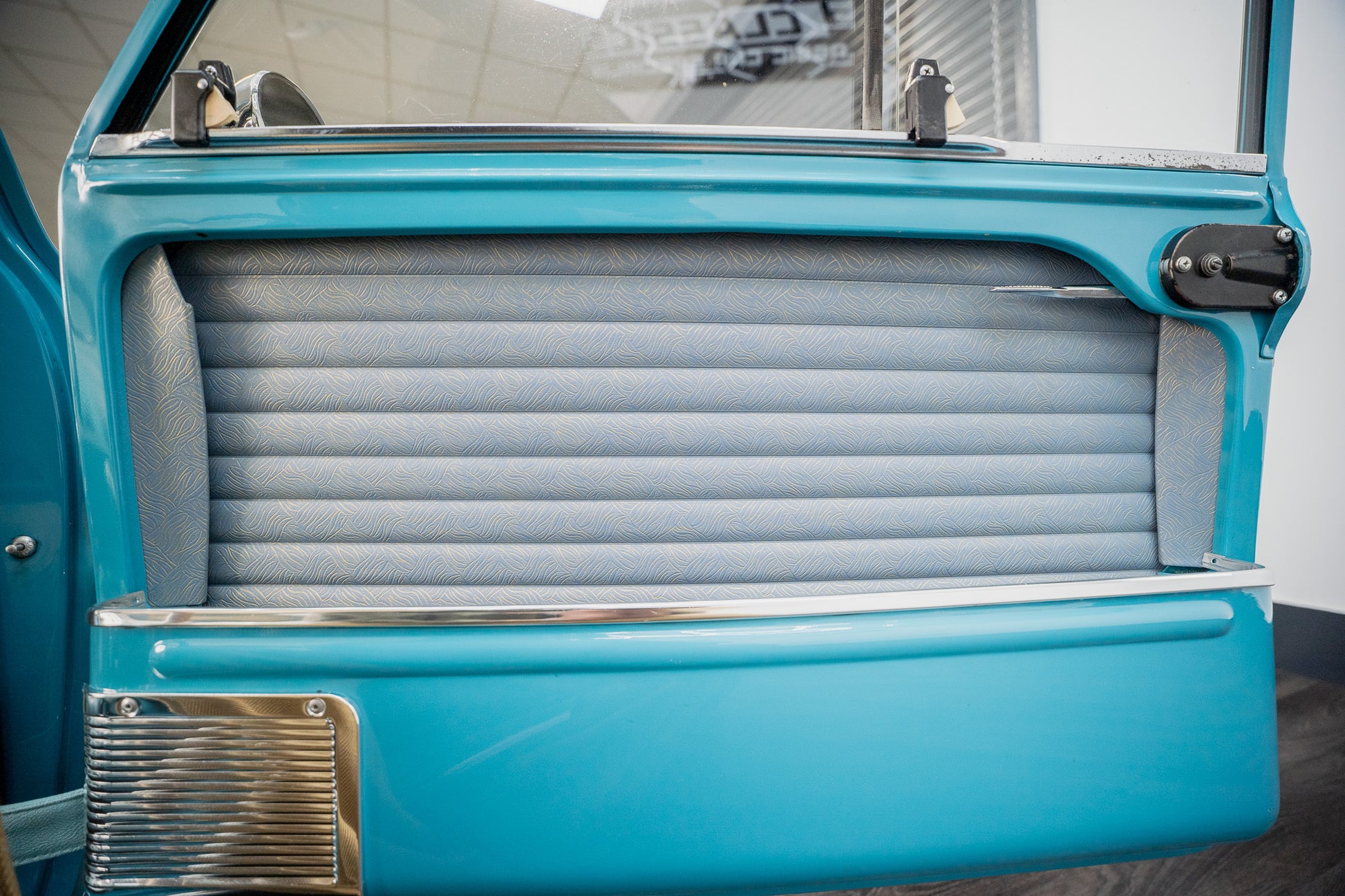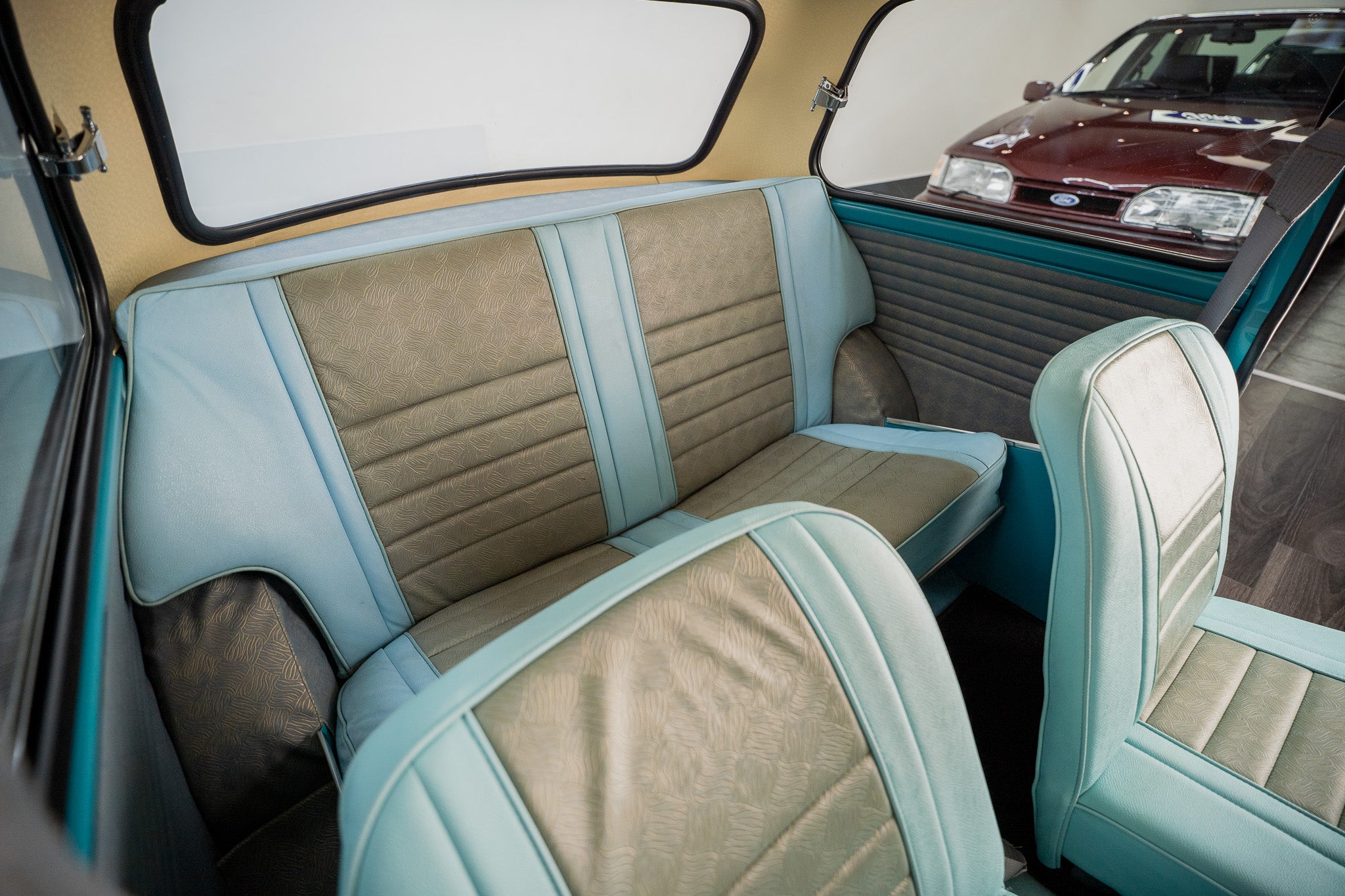 Upon opening the drivers or passenger side doors you instantly go back in time to the sixties, Spotless and unmarked blue leather bolster seating with blue piping along with the grey & gold leaf brocade centre panelling sitting in beautiful condition simply a thing of beauty, Front and rear seats present in overall good condition along with a colour coded surf blue interior carpet which sits unmarked due to overmats being fitted