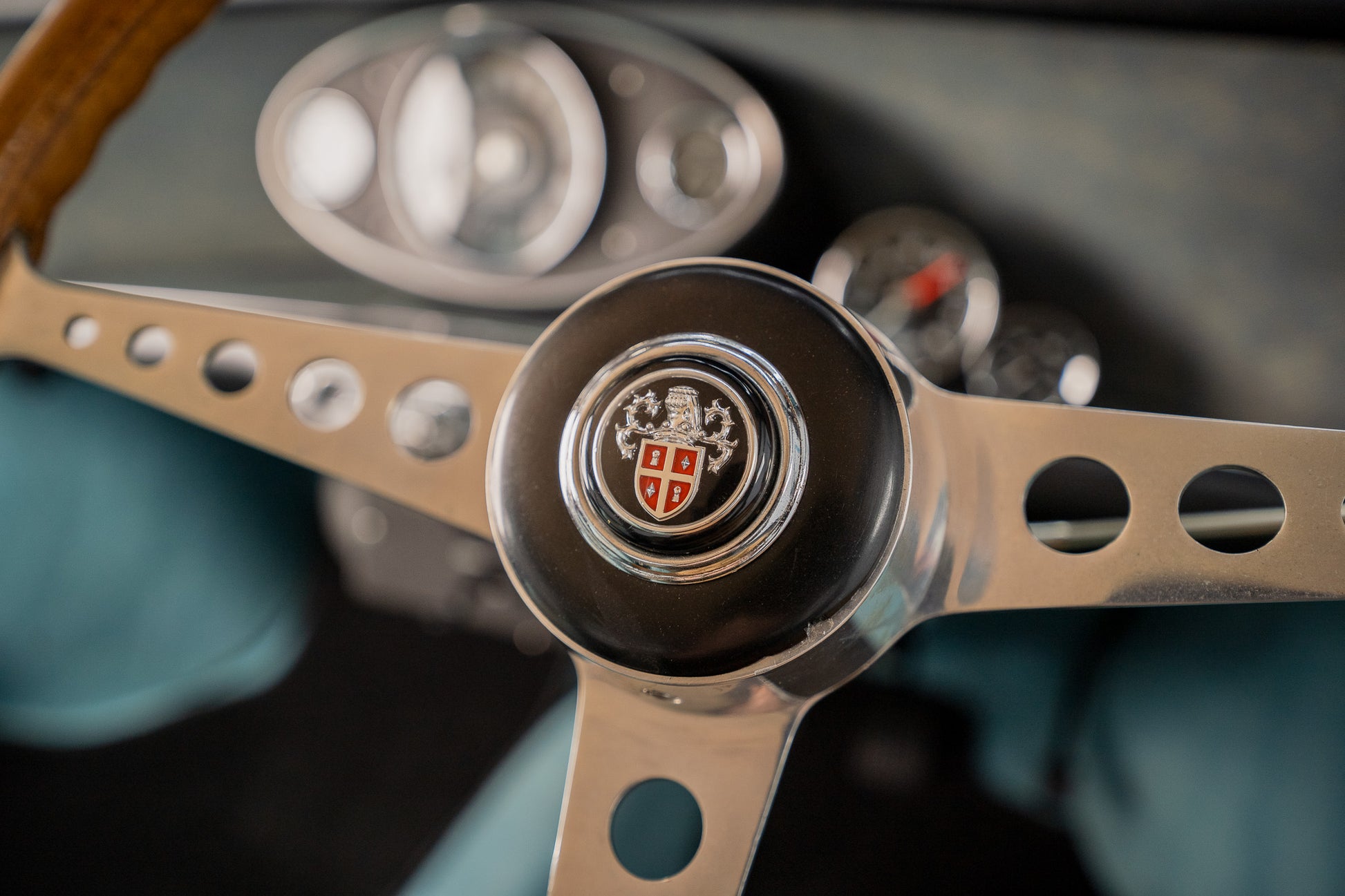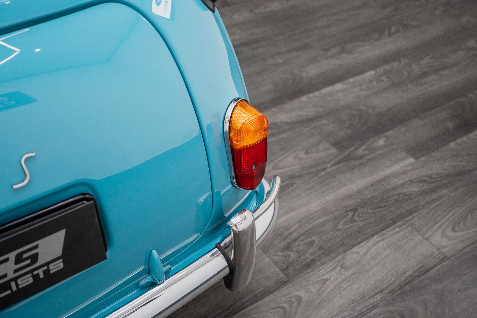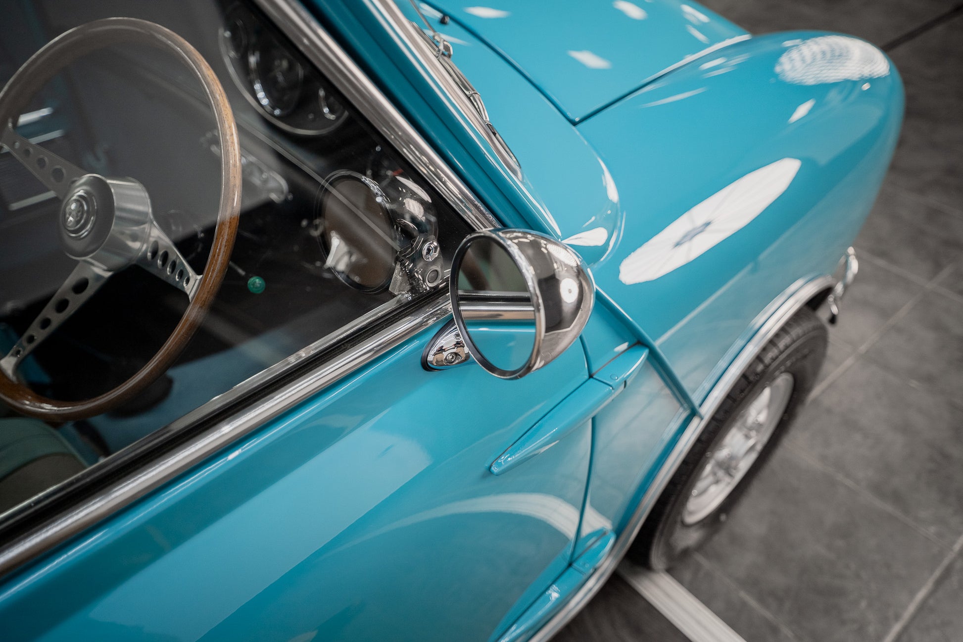 Upon opening the drivers or passenger side doors you instantly go back in time to the sixties, Spotless and unmarked blue leather bolster seating with blue piping along with the grey & gold leaf brocade centre panelling sitting in beautiful condition simply a thing of beauty, Front and rear seats present in overall good condition along with a colour coded surf blue interior carpet which sits unmarked due to overmats being fitted