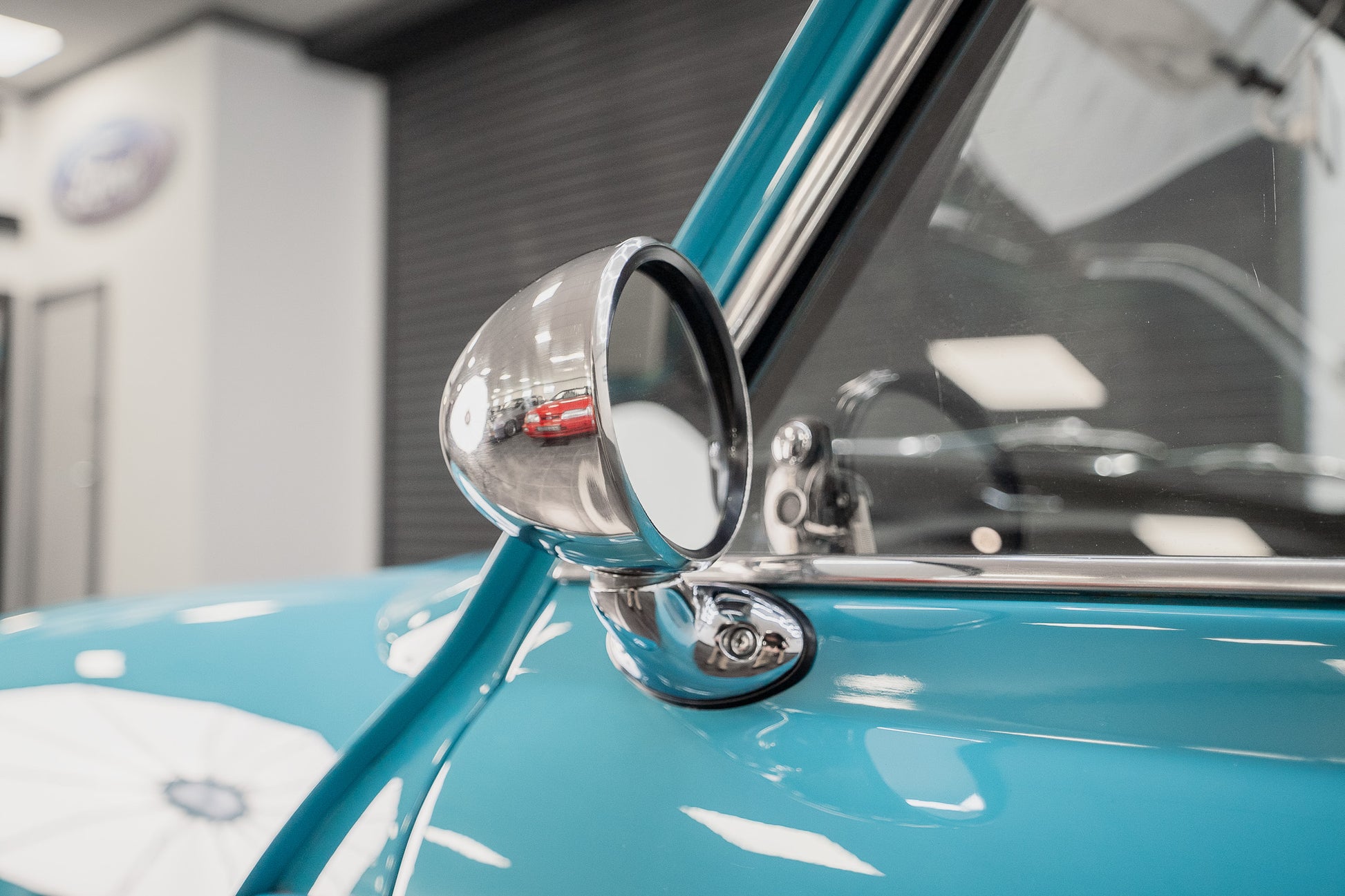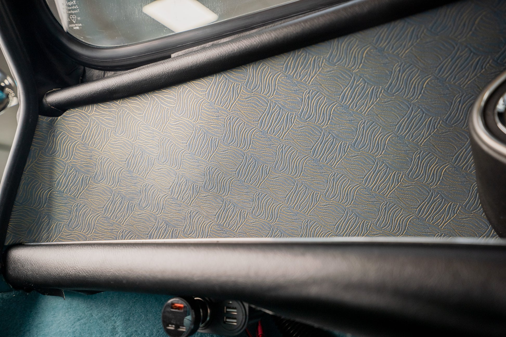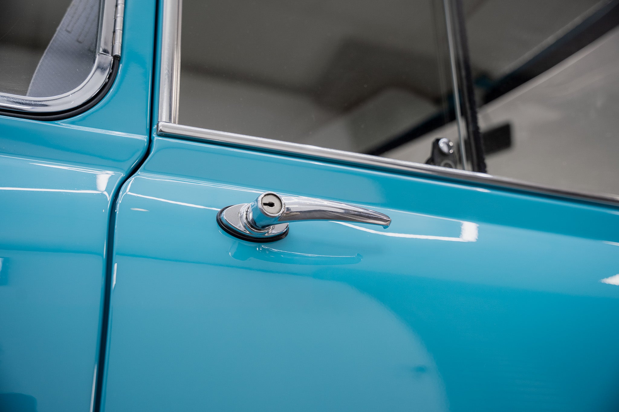 Single blue colour coded leather door ajar strap attached to the ‘A’ pillar on both front doors respectively. Grey ‘Britax’ fixed front seatbelts finish of the basic but functional safety aspects