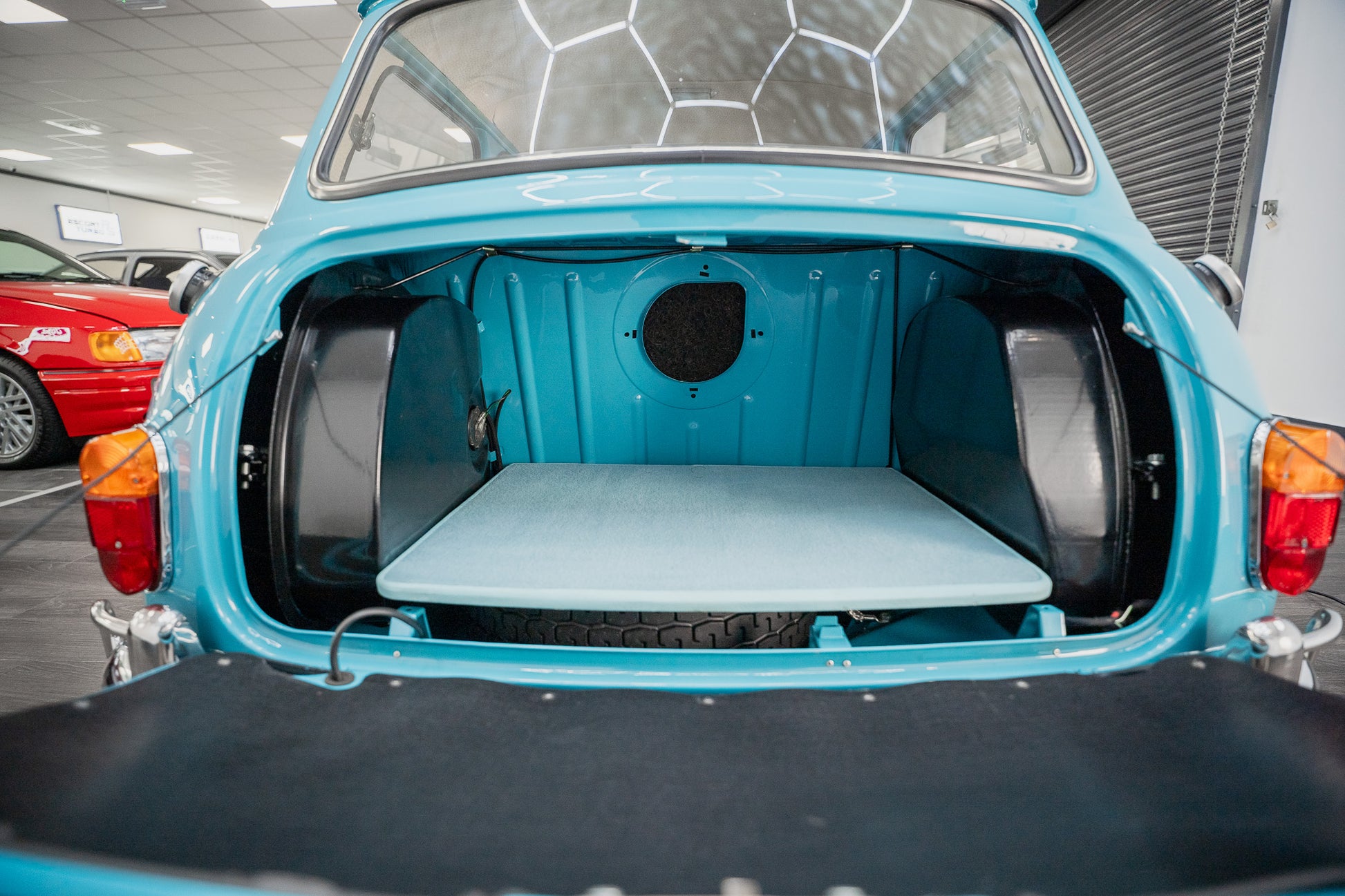 Upon opening the drop down boot you instantly see the twin tanks along with a unique colour coded fabric shelf with leather bound edging simply stunning. All lights front and rear present in the very best of condition crack and fade free and of course genuine ensuring originality has been maintained throughout