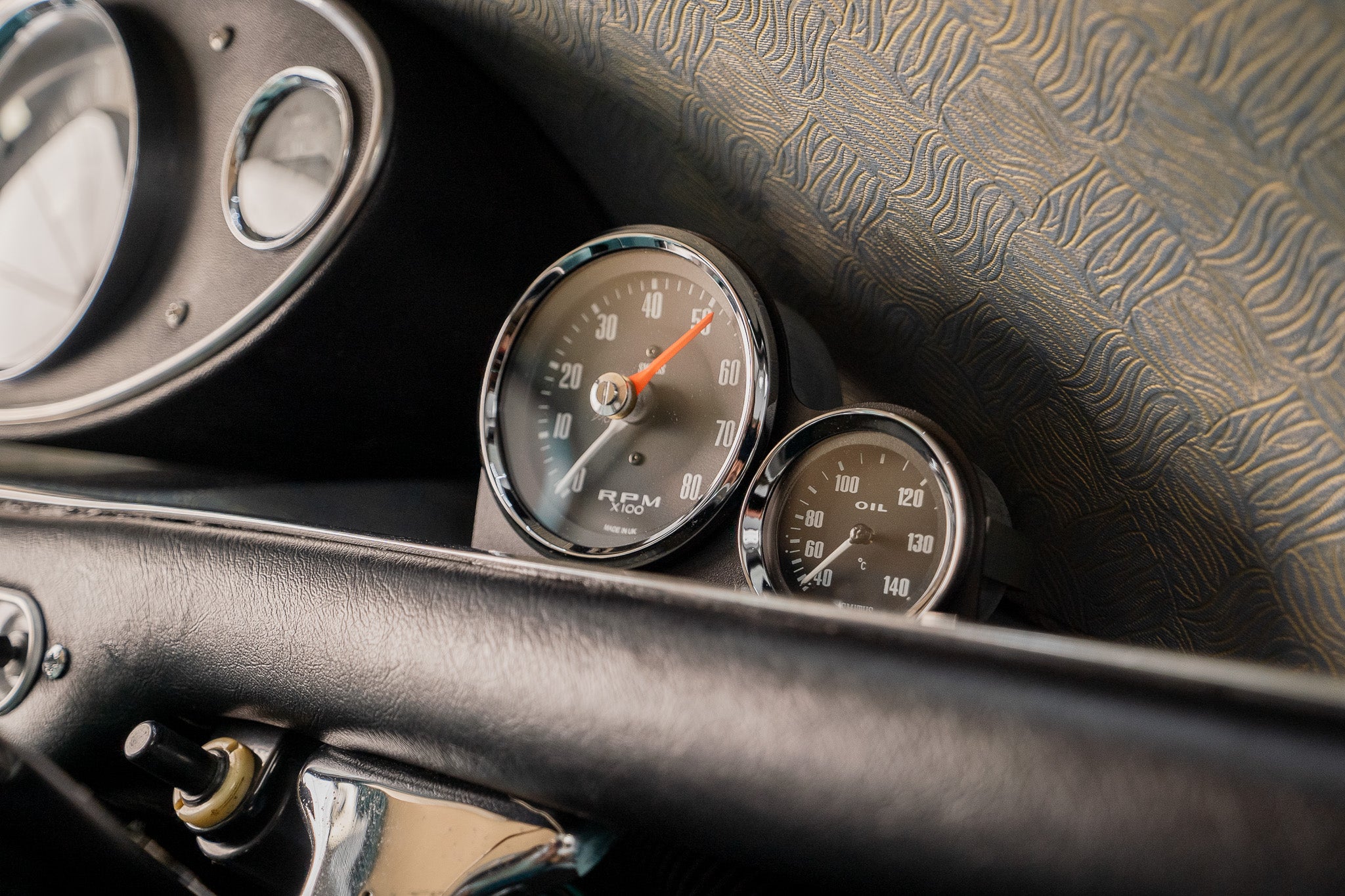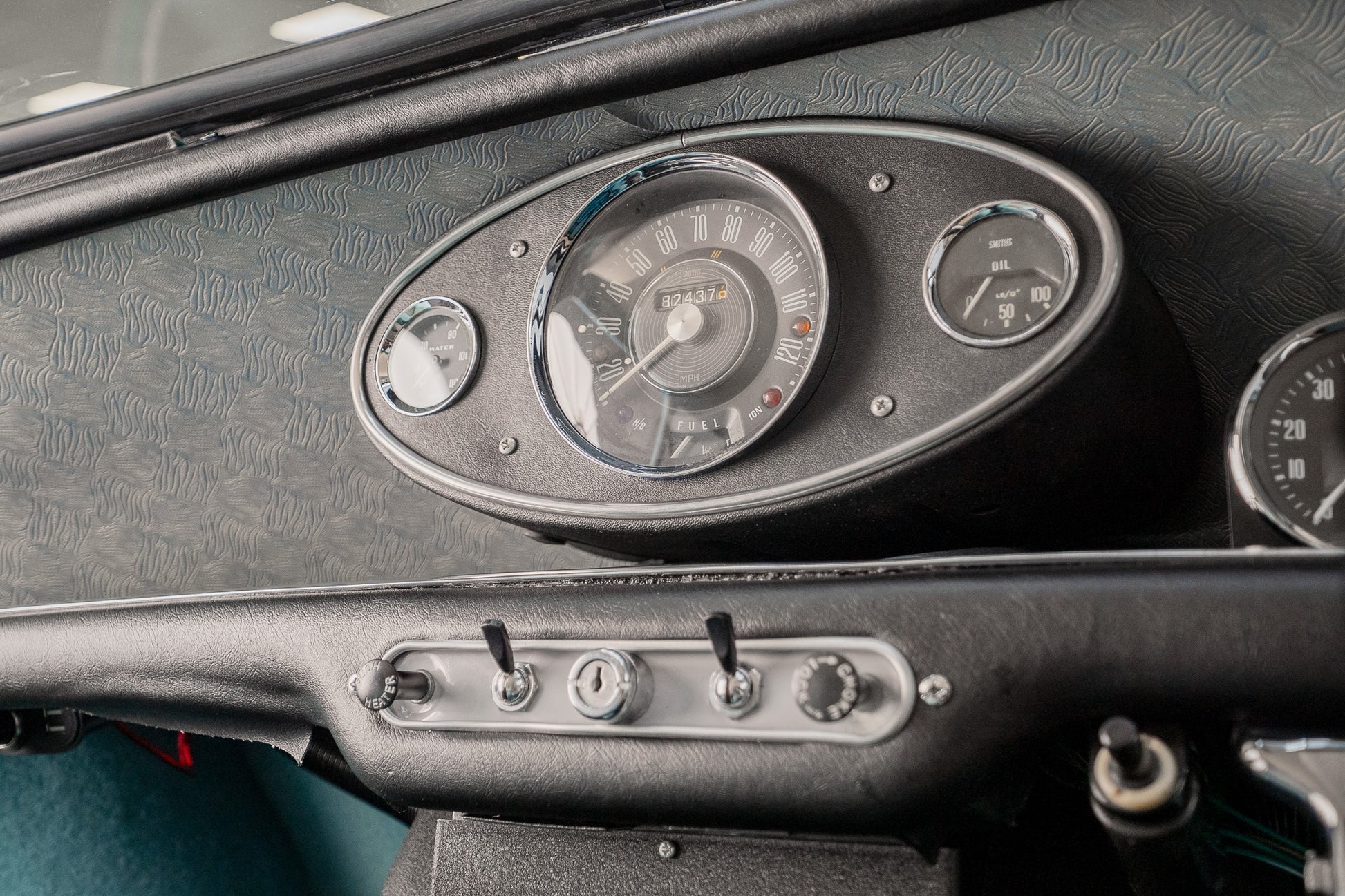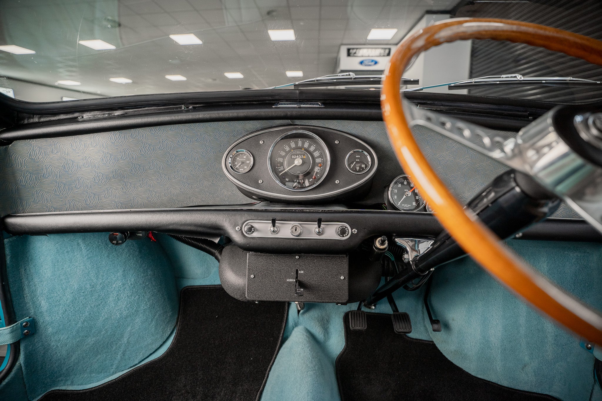 Basic can only be used to sum up the interior but adequate and clutter free three dial centre dash displaying Water Temperature to the left, Speedometer sitting larger to the centre and Oil Pressure to the right, Additional 'smiths' tachometer and oil pressure temperature dials have been tastefully added(can be removed if required)