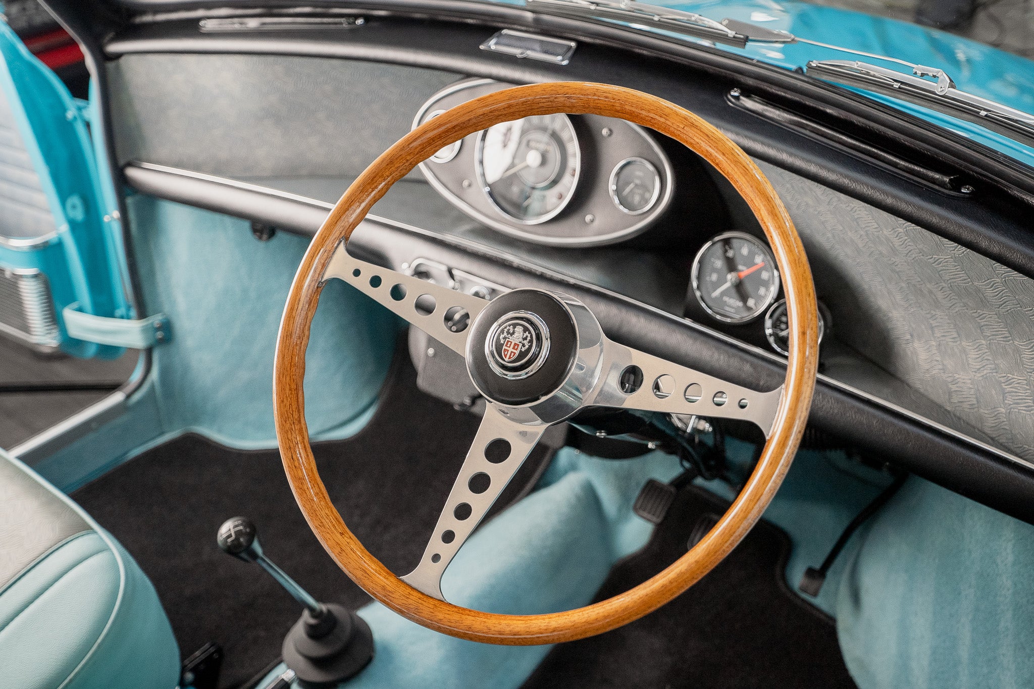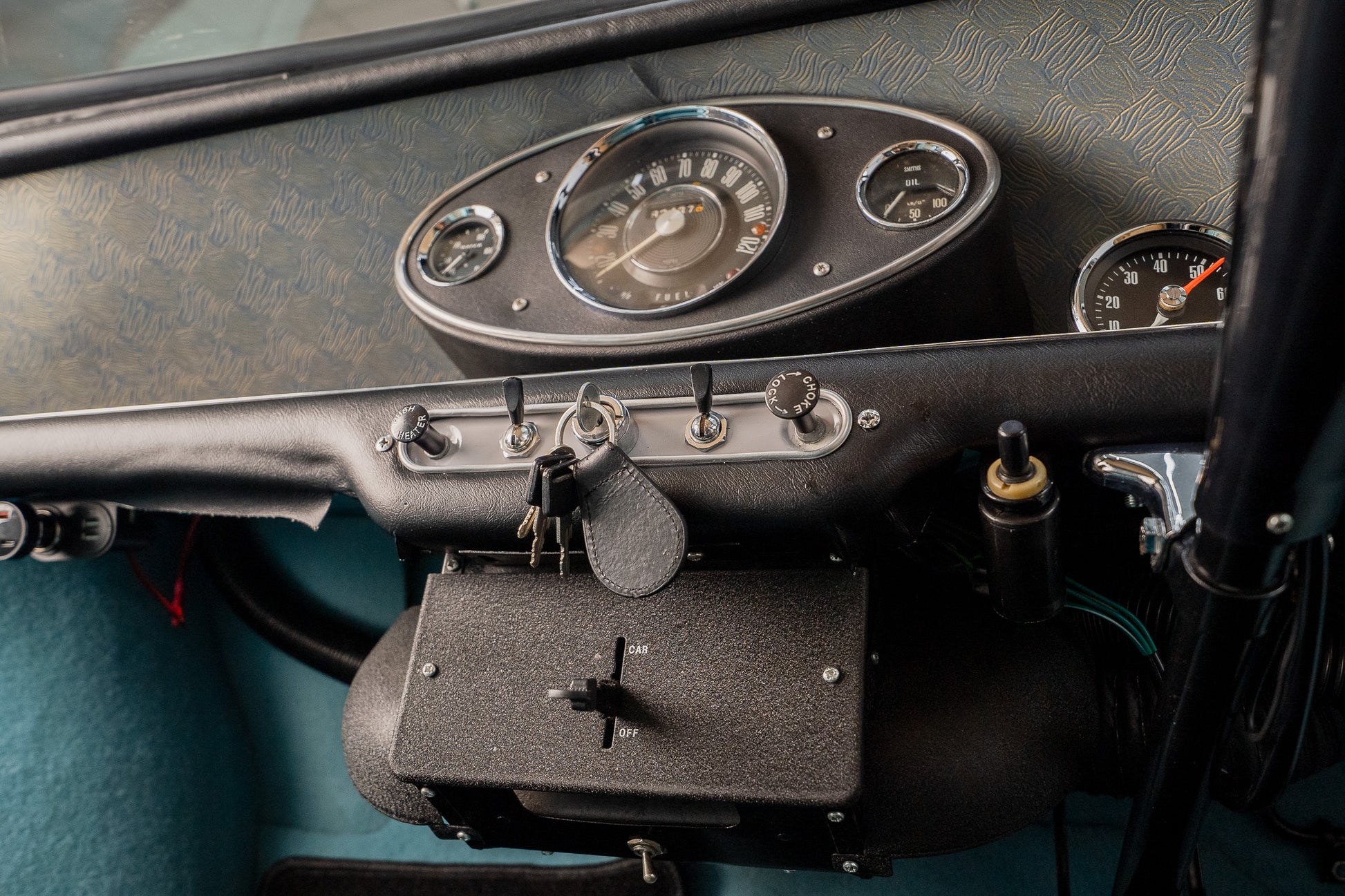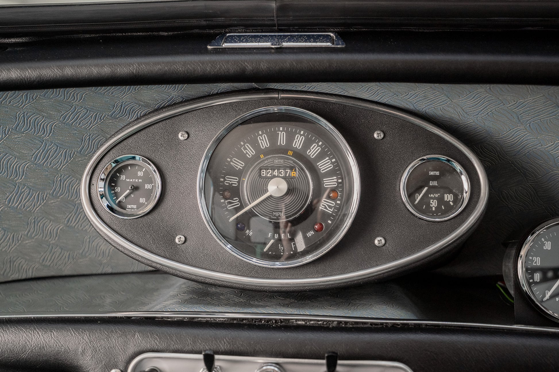 Basic can only be used to sum up the interior but adequate and clutter free three dial centre dash displaying Water Temperature to the left, Speedometer sitting larger to the centre and Oil Pressure to the right, Additional 'smiths' tachometer and oil pressure temperature dials have been tastefully added(can be removed if required)