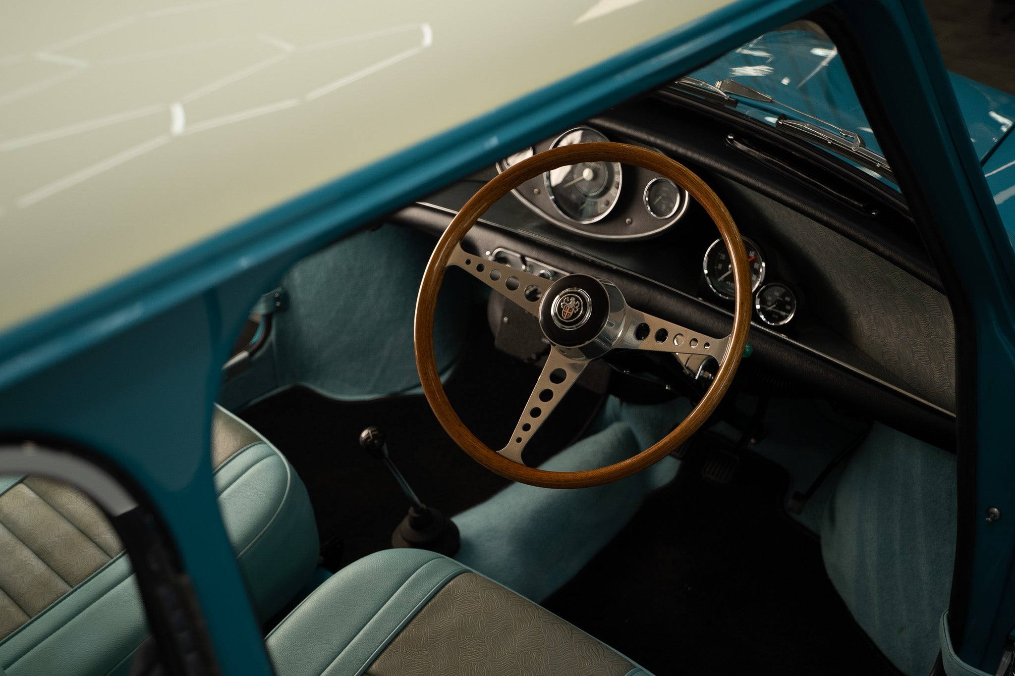 A three spoke chrome over wooden steering wheel which were original fit to the ‘Cooper S’ sits in wonderful condition highlighting little use. A very sixties theme interior minimalistic but practical.