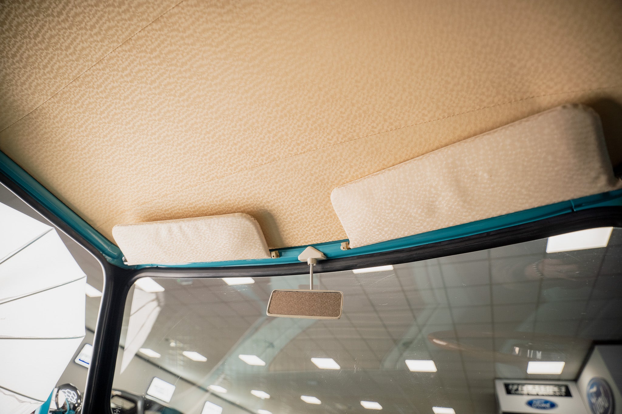 Original white ripple honeycomb affect headlining sits beautiful with original interior light centre bound. With drivers and passengers sun visors still retaining the original grey clips it left the factory with