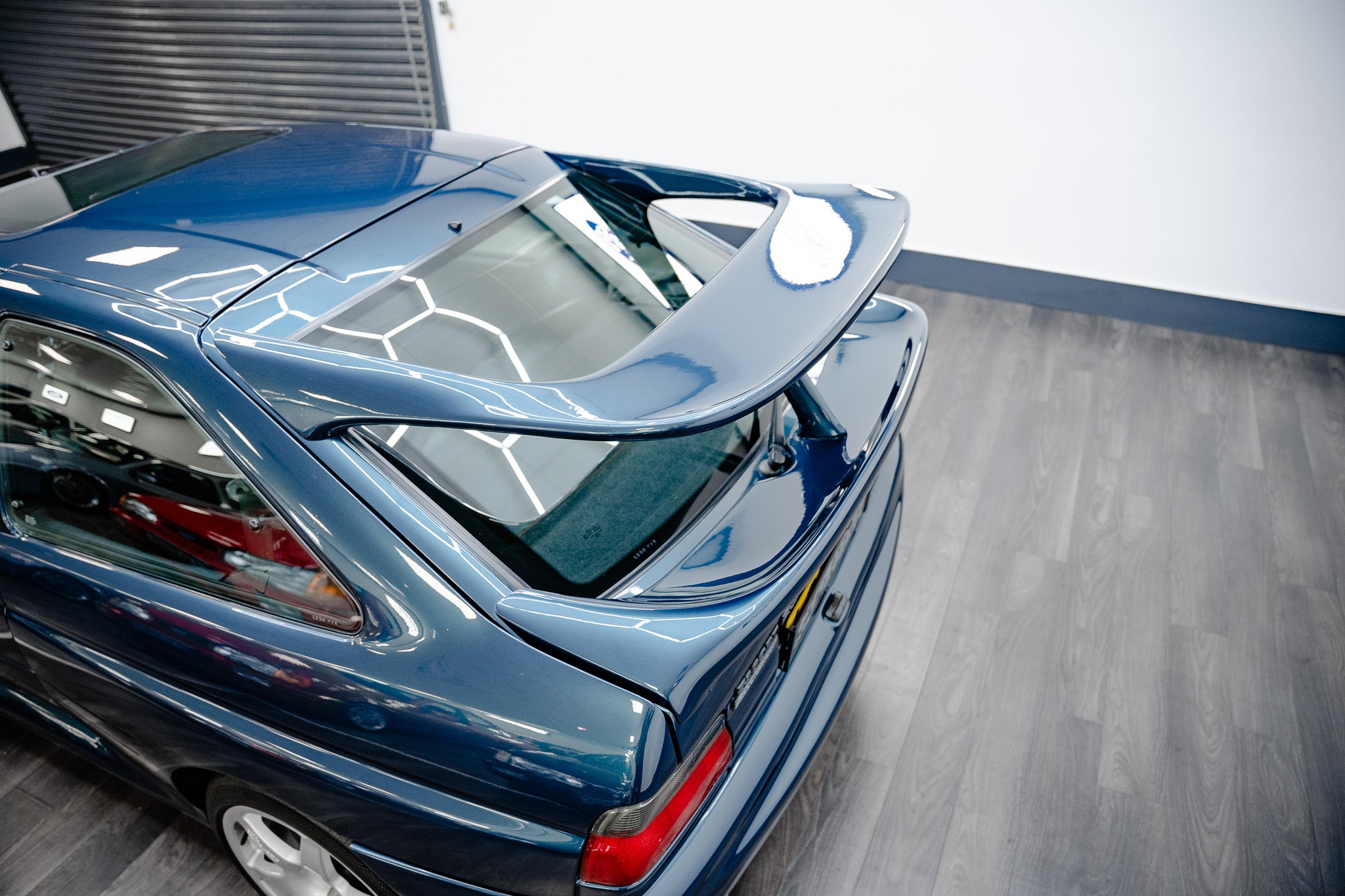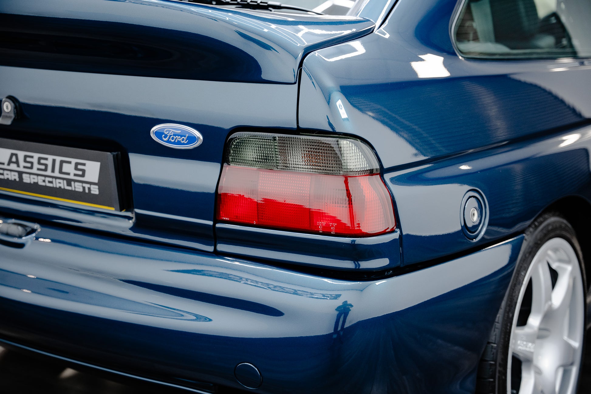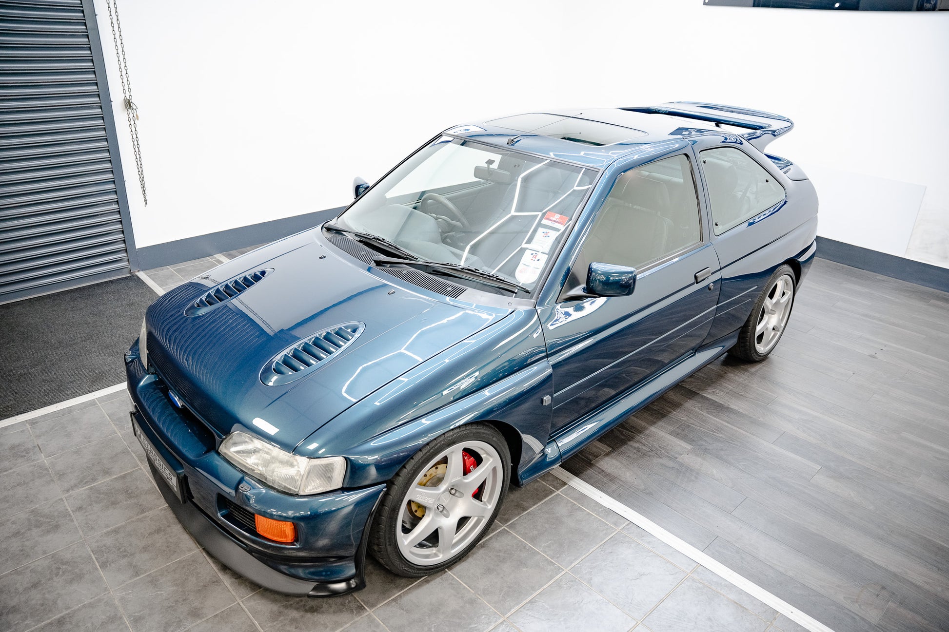 Every body panel presents with a vibrant, glossy shine, displaying pin-sharp fit and finish, with no scuffing or damage to the wrap-around bumpers front or rear. In place of the traditional front fog lamps black mesh grilles are fitted a subtle period-correct weight-saving feature that further emphasises the Escort Rs Cosworth motorsport-inspired engineering