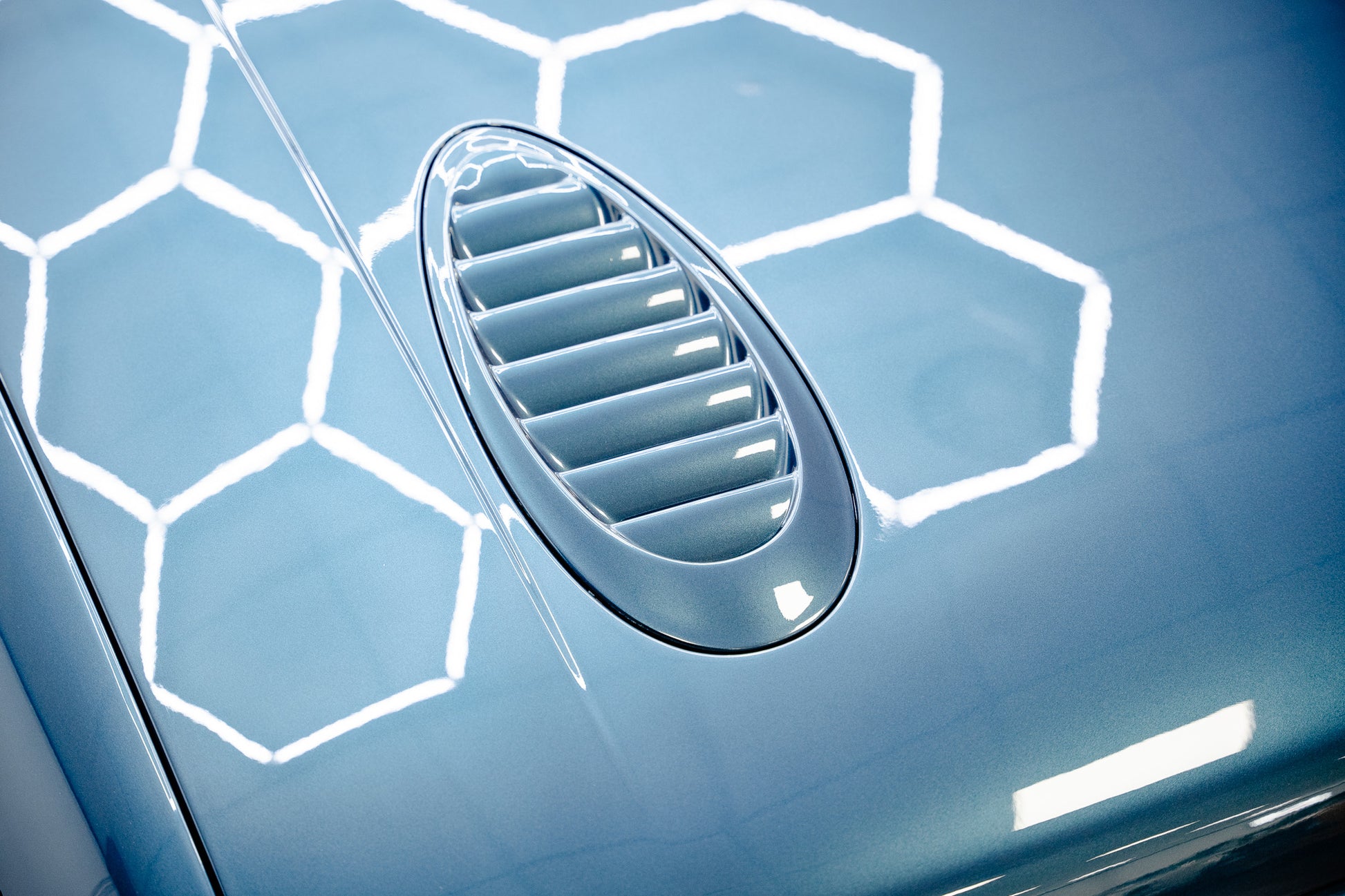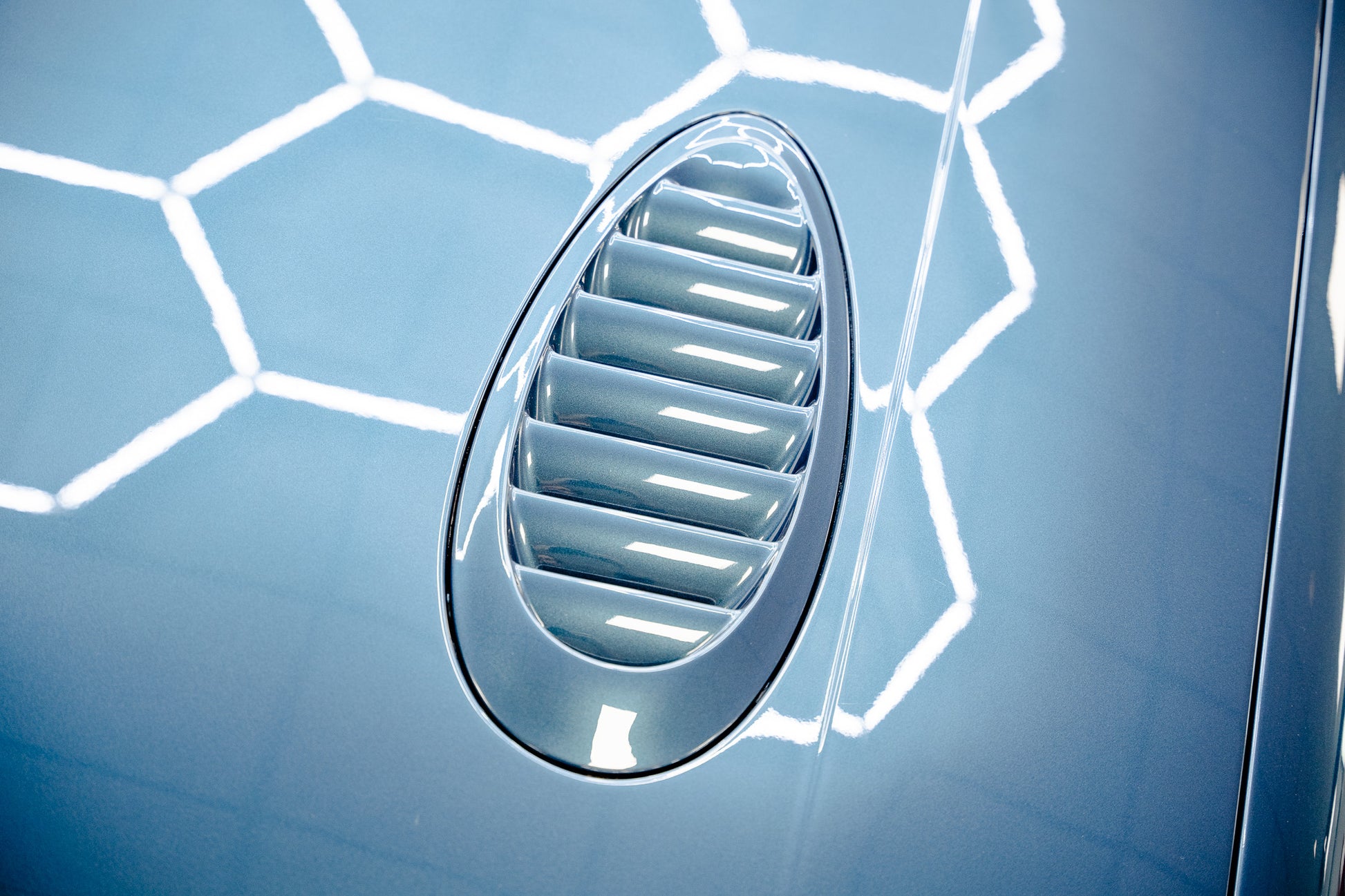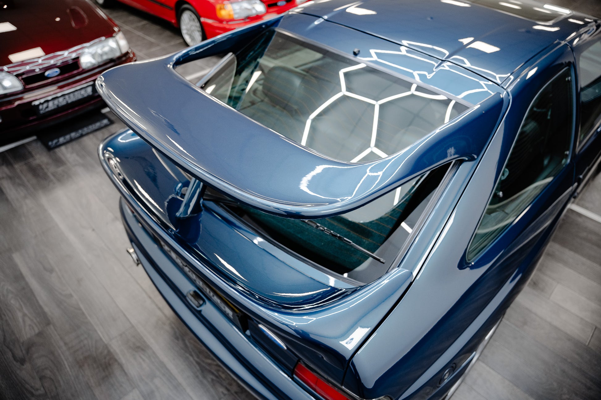 Every body panel presents with a vibrant, glossy shine, displaying pin-sharp fit and finish, with no scuffing or damage to the wrap-around bumpers front or rear. In place of the traditional front fog lamps black mesh grilles are fitted a subtle period-correct weight-saving feature that further emphasises the Escort Rs Cosworth motorsport-inspired engineering