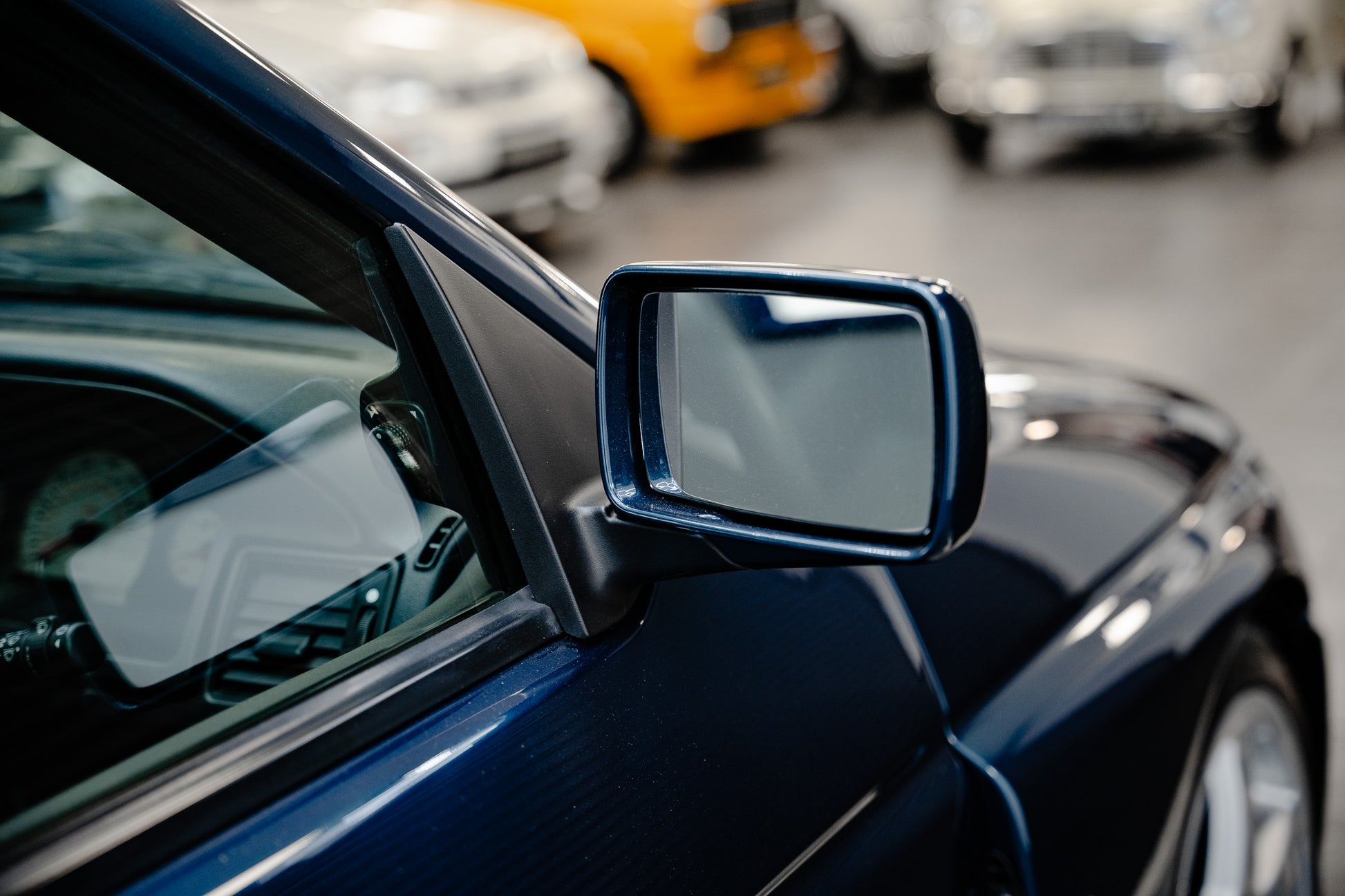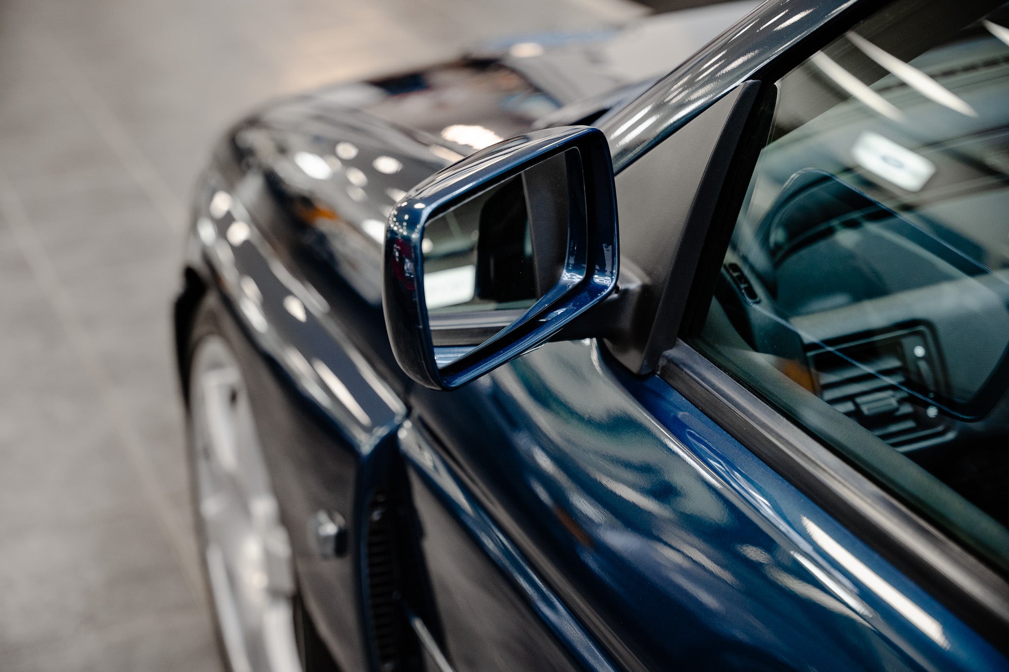 The body-colour front bumper with black lower splitter flows seamlessly into the sculpted lines, while the louvered bonnet air intakes and wing-mounted air extraction grilles hint at the car’s performance pedigree. To the rear, the aerodynamic rear wing with lower boot spoiler adds both purpose and presence, perfectly matched by the large door mirrors, a hallmark of the early more tuneable turbocharged models