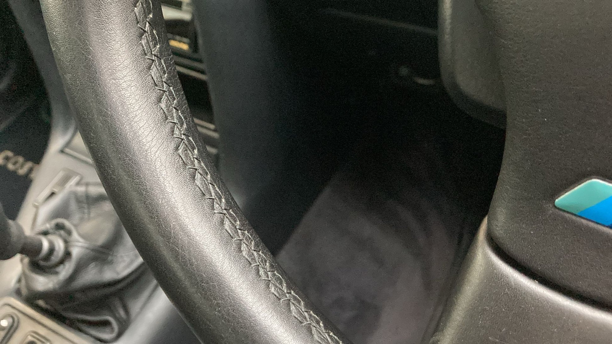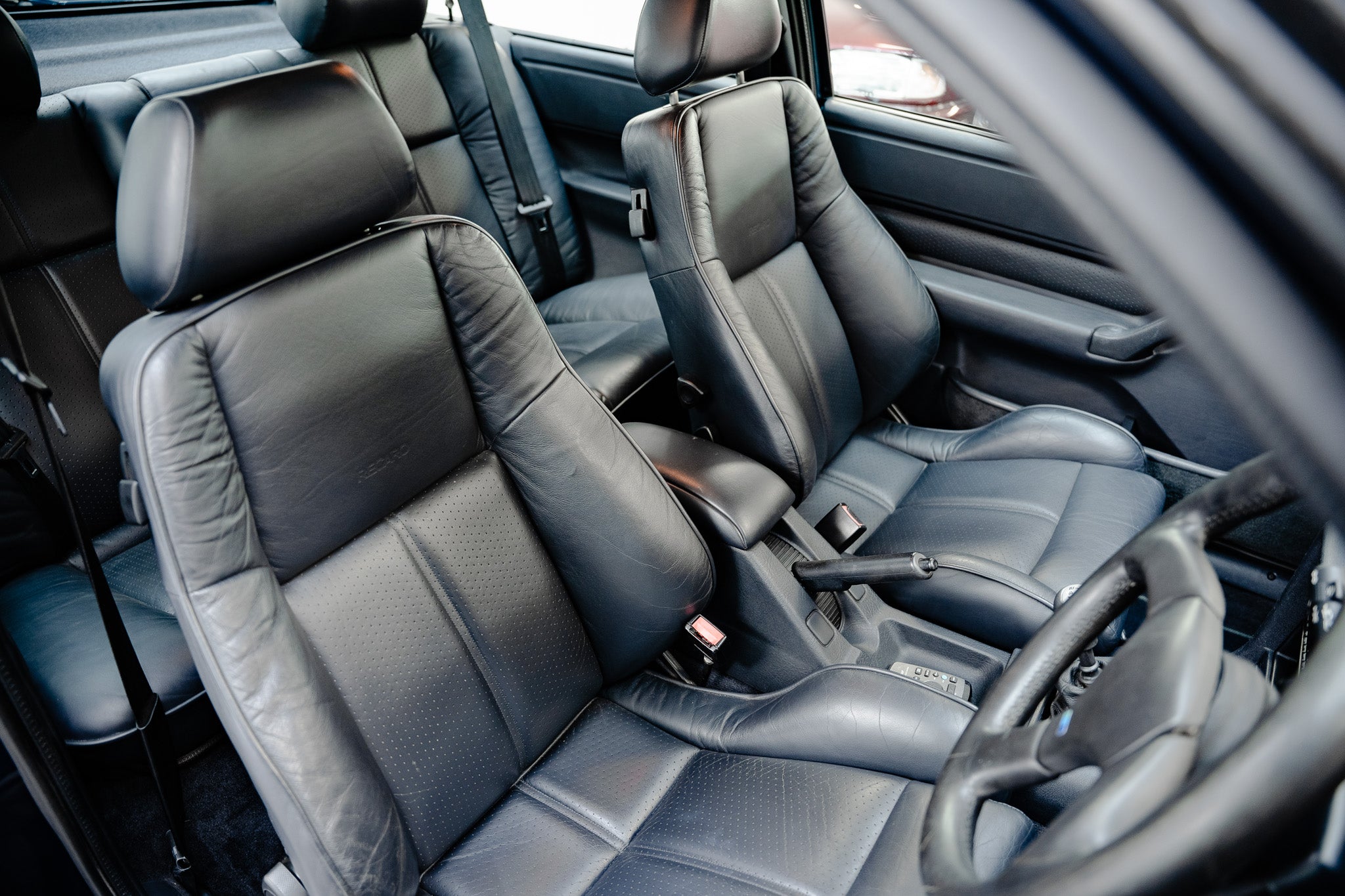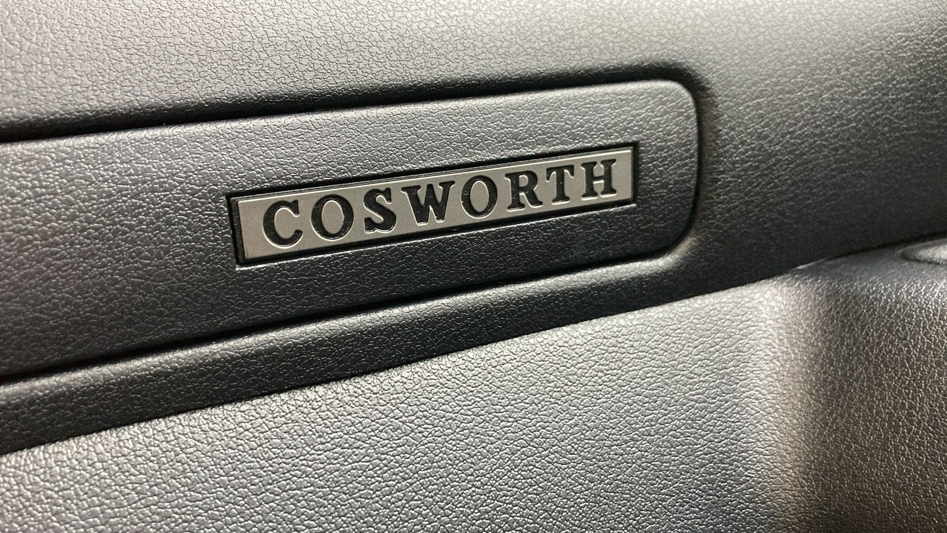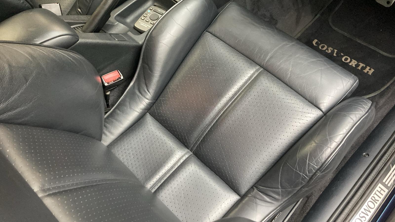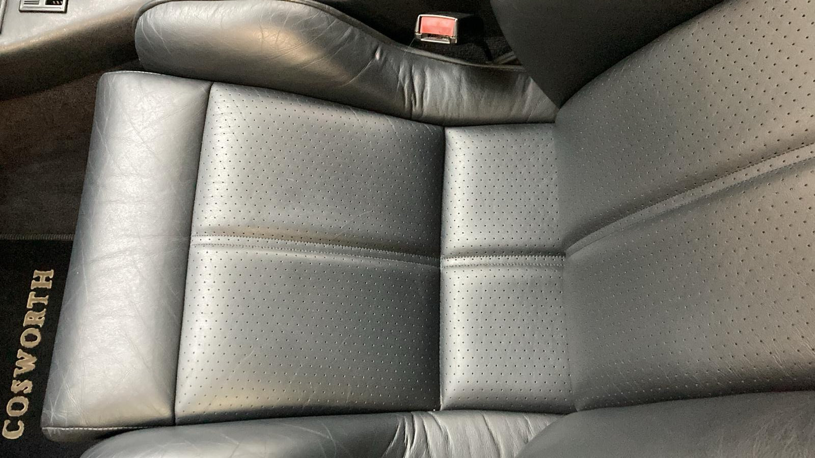 Opening the driver’s door, you are immediately greeted by the Raven Black leather interior, a factory option that elevates this Escort Rs Cosworth into a far more exclusive class of hot hatch. Both front and rear seats remain in very good condition throughout, the perforated seat bases and backrests displaying only the lightest signs of use, while the supportive bolsters sit proud, still tightly hugging occupants in place as intended. Matching black leather headrests to the front and rear complete the ensemble, a clear indication of the car’s preserved originality.