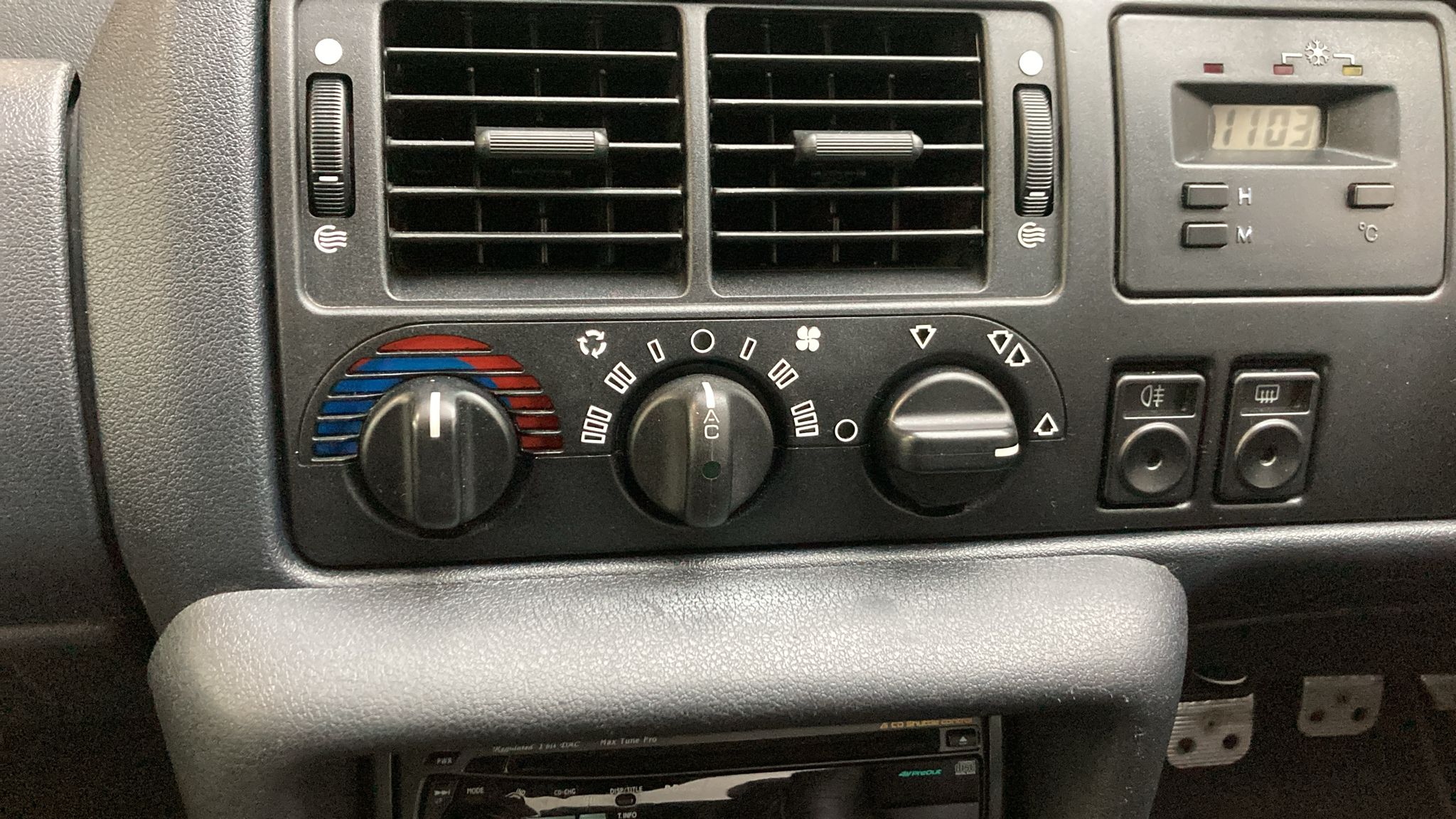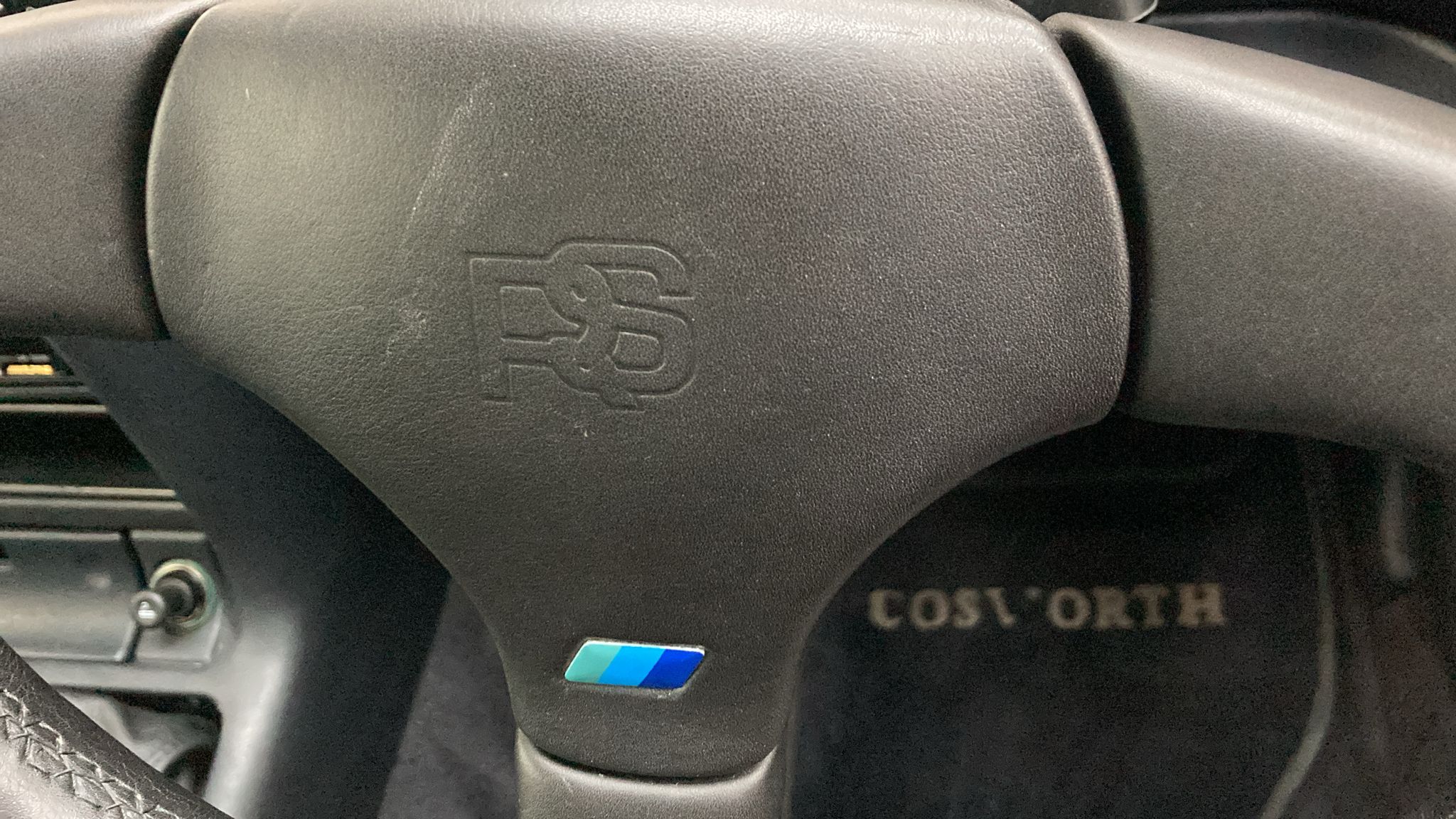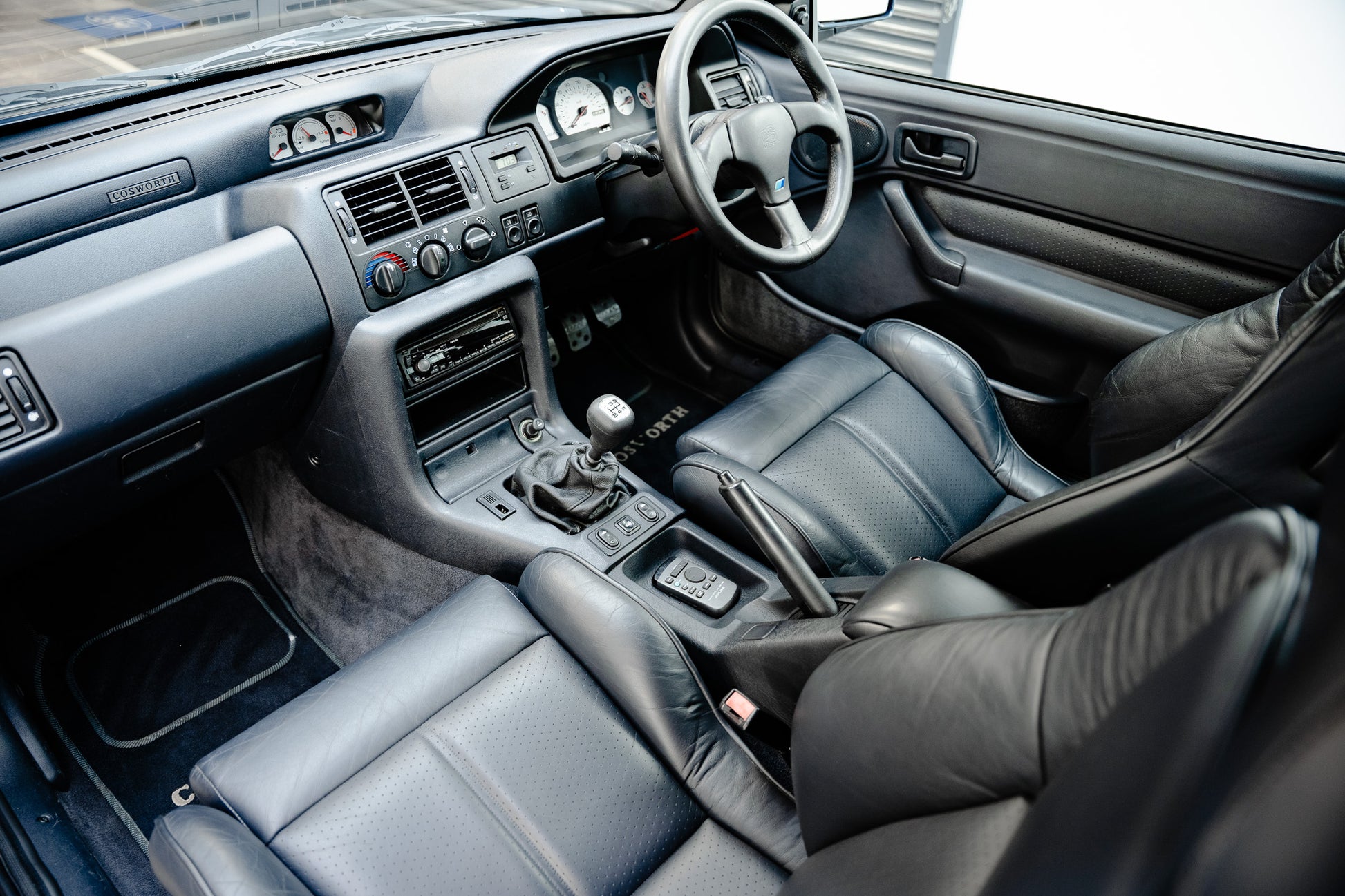 The dashboard retains all its original Cosworth-inspired styling cues, presenting in very good condition with all switchgear remaining crisp to the touch. Period upgrades include an Alpine head unit with remote control, subtly enhancing audio performance while respecting the integrity of the interior. Ahead, the driver benefits from the upgraded Ford RS three-spoke black leather steering wheel with black stitching, showing minimal wear and providing an authentic connection to the car’s motorsport roots.