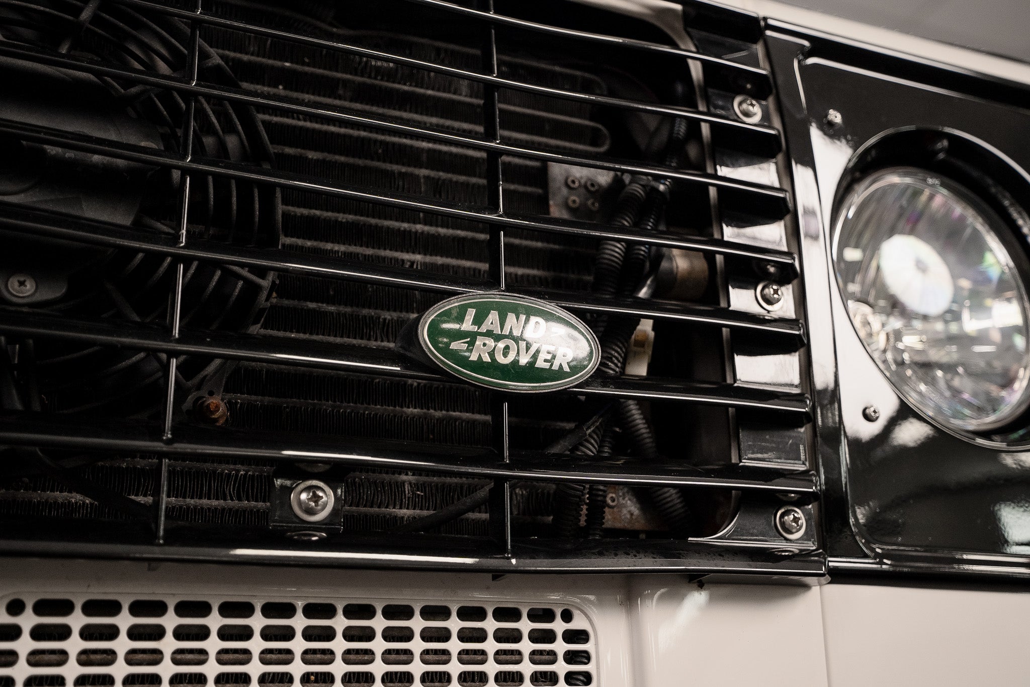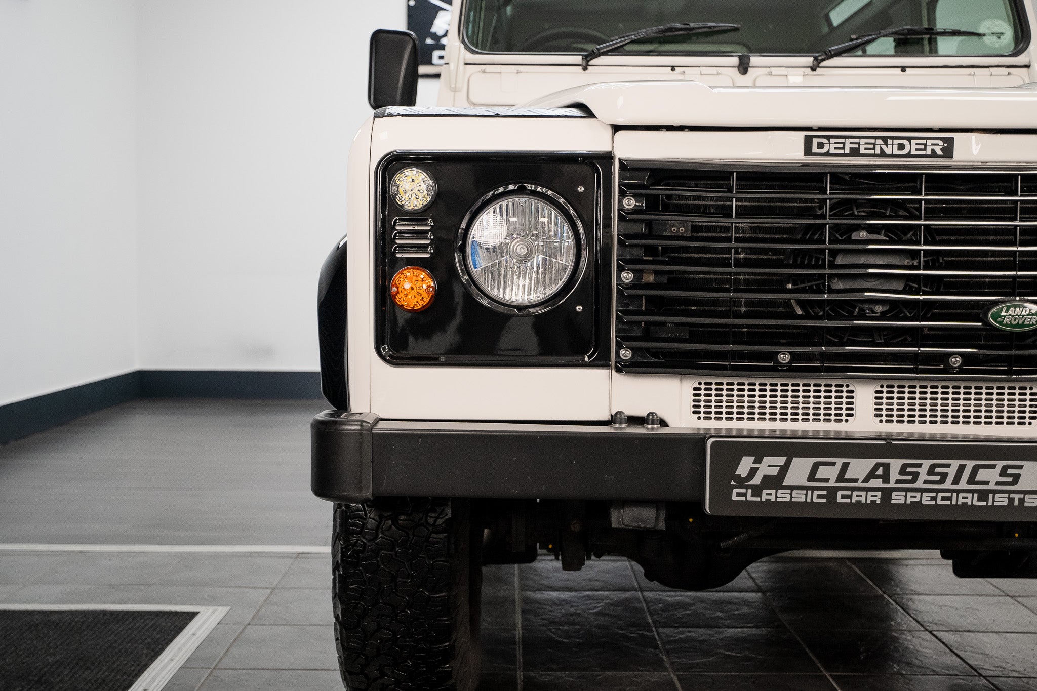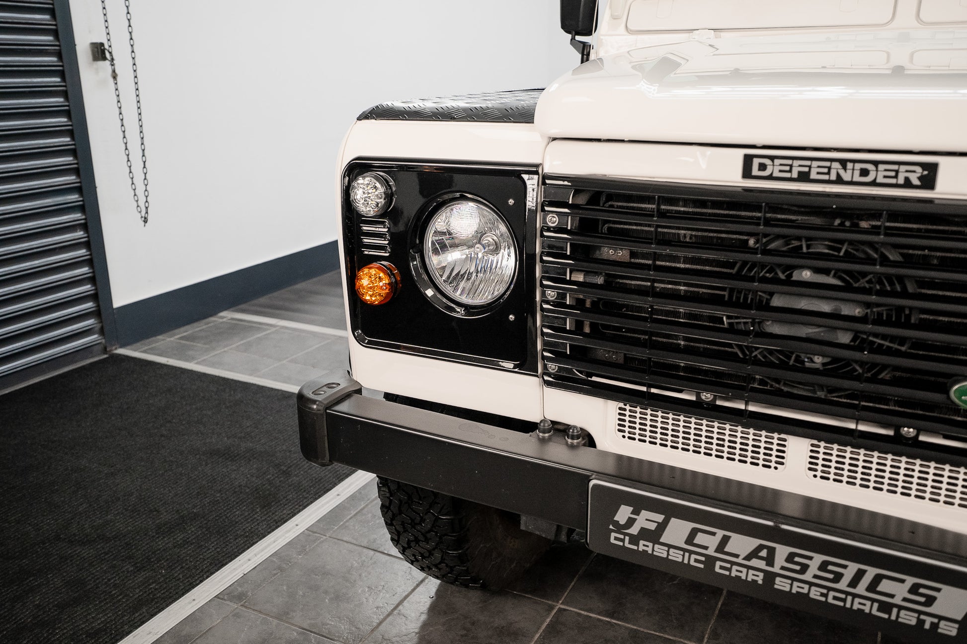 To the front, a full glossy black slatted grille sits proudly, with the correct Land Rover badging mounted. Matching shiny black headlight surrounds house upgraded LED sidelights and indicators, providing crisp luminosity while maintaining a tasteful, period-correct aesthetic. The tough metal black wrap-around front bumper presents extremely well, free from damage and adding to the vehicle’s rugged yet well-kept appearance.