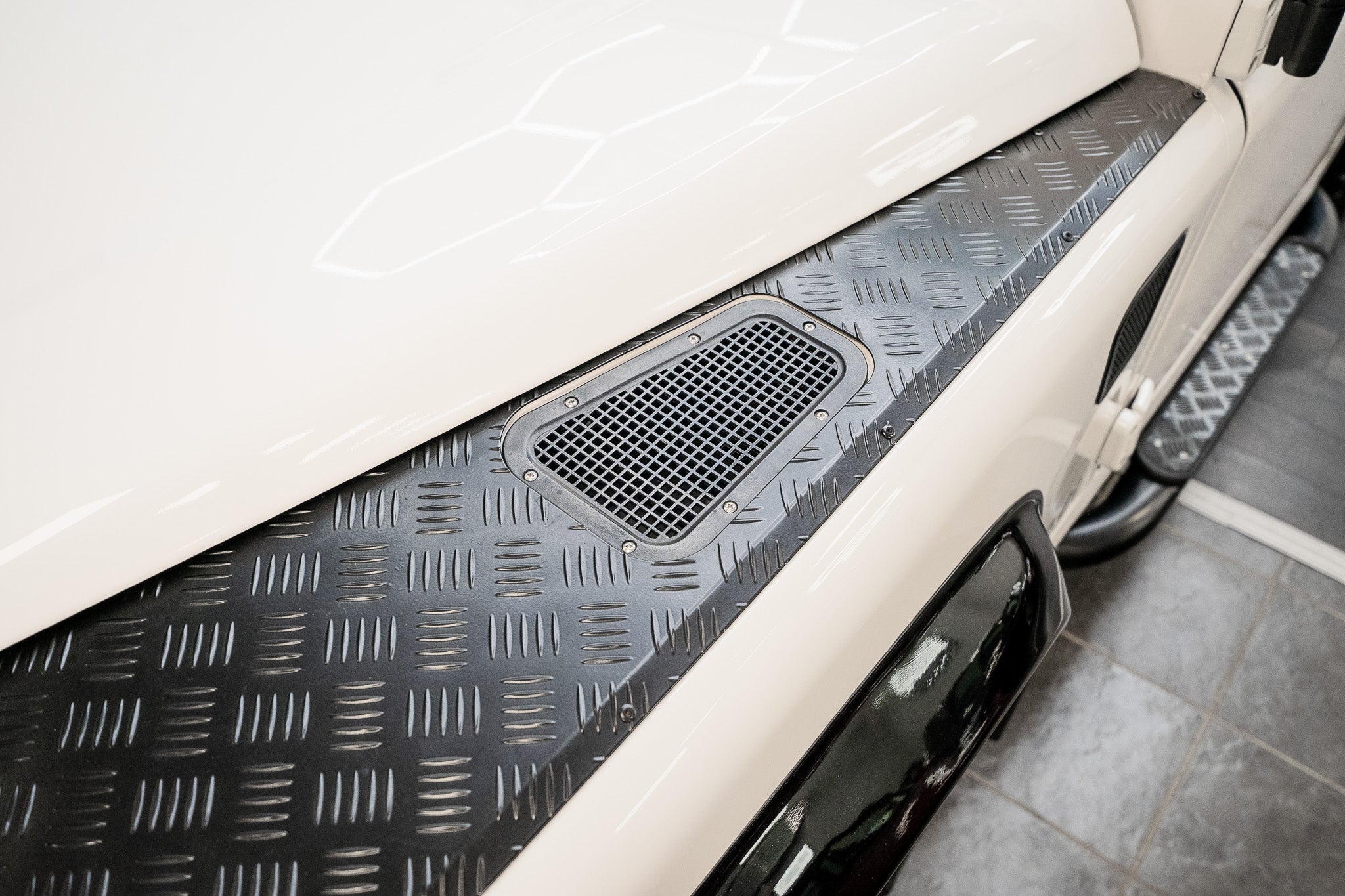 Further enhancing its utilitarian appeal, black chequer plate is fitted to the tops of both front wings, offering durability and visual presence, perfectly complemented by the black gloss wheel arch extensions. Sturdy black chunky side steps run along both sills, providing easy cabin access while remaining solid underfoot.