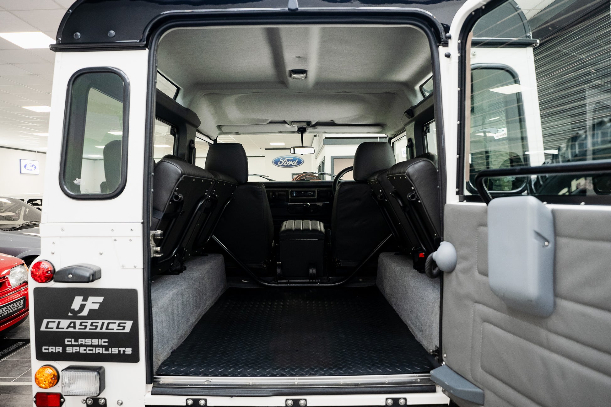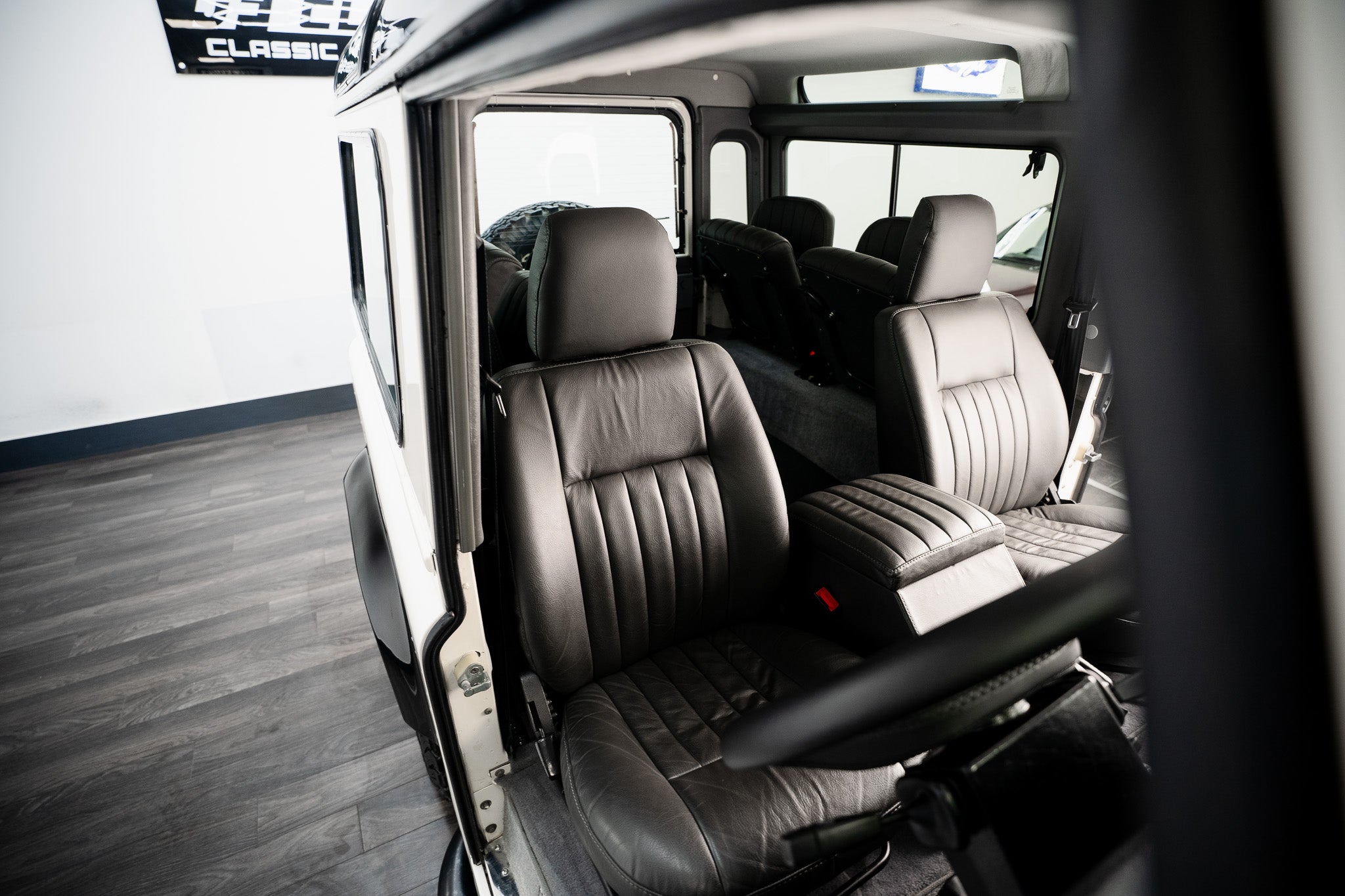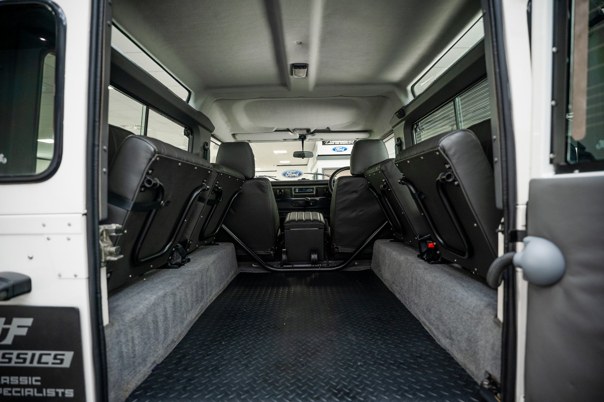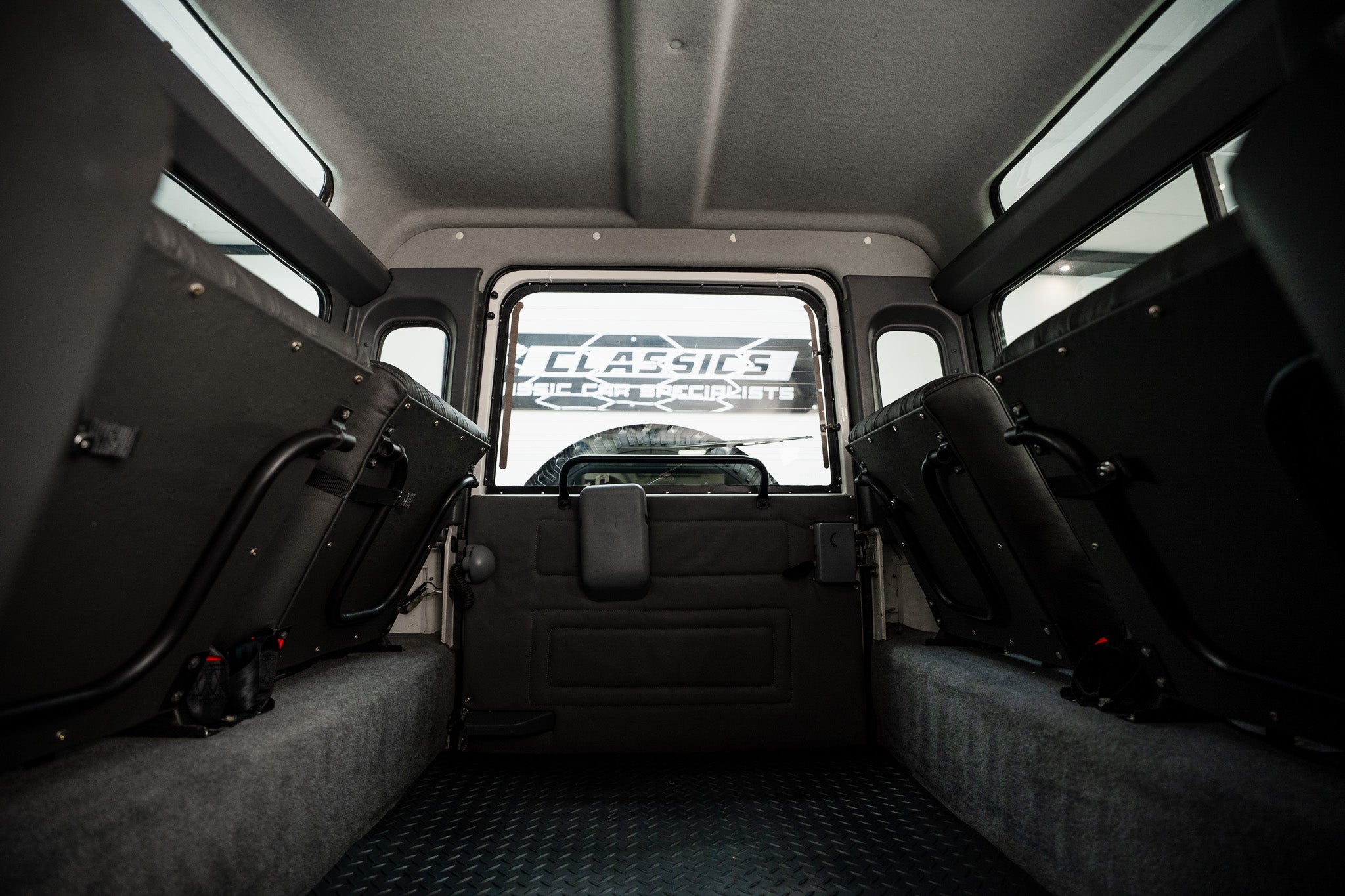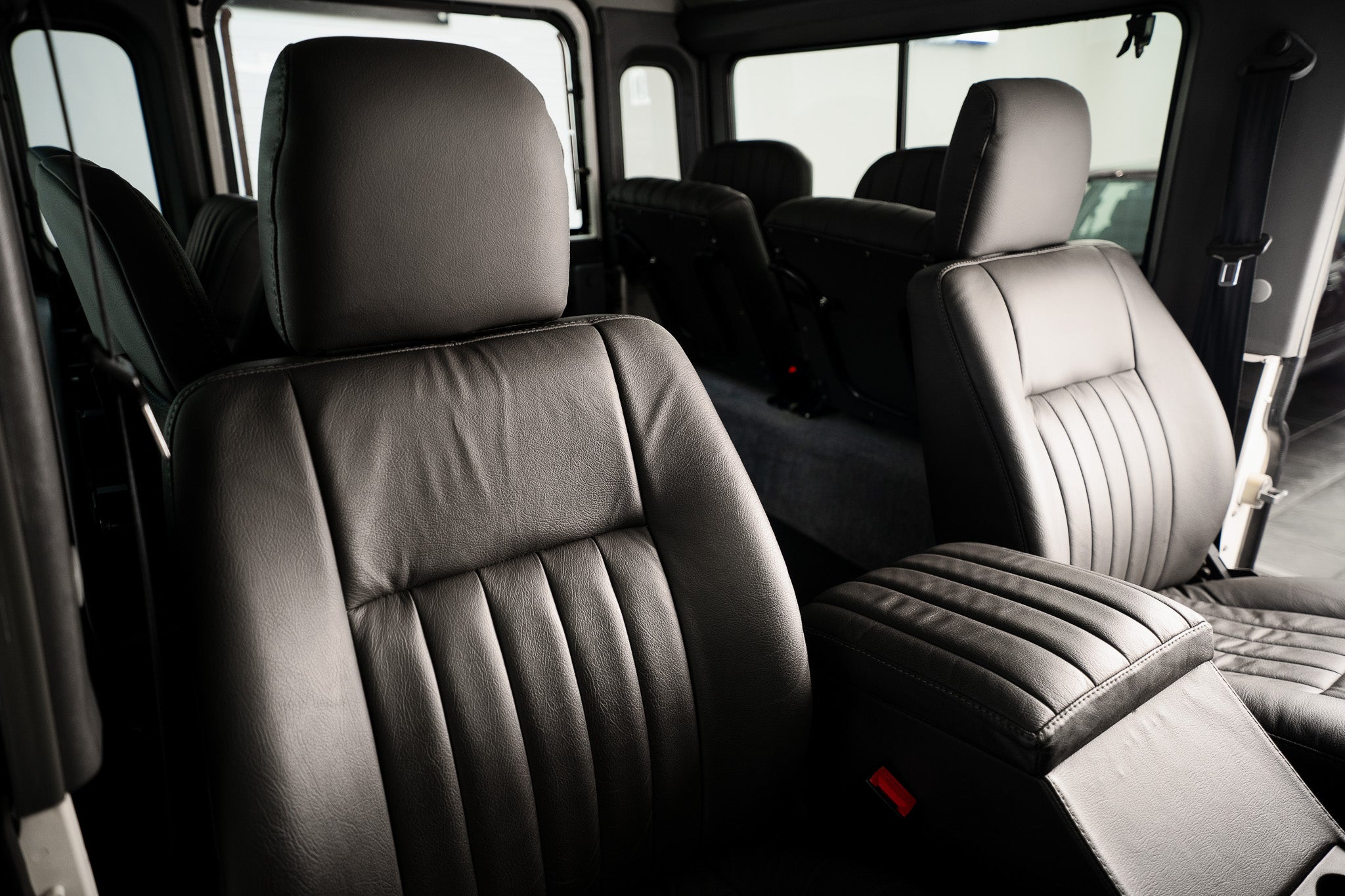 The bespoke Anthracite Grey leather front seats, complete with integrated headrests, present in exceptionally good condition. They display only the very slightest signs of use no rips, tears or damage offering both comfort and durability for everyday usability or long-distance travel. To the rear, four further matching Anthracite Grey leather seats are neatly stowed to each side, appearing virtually unused and each fitted with its own safety belt. This creates a highly practical six-seater configuration, perfect for family, adventure or touring capability.