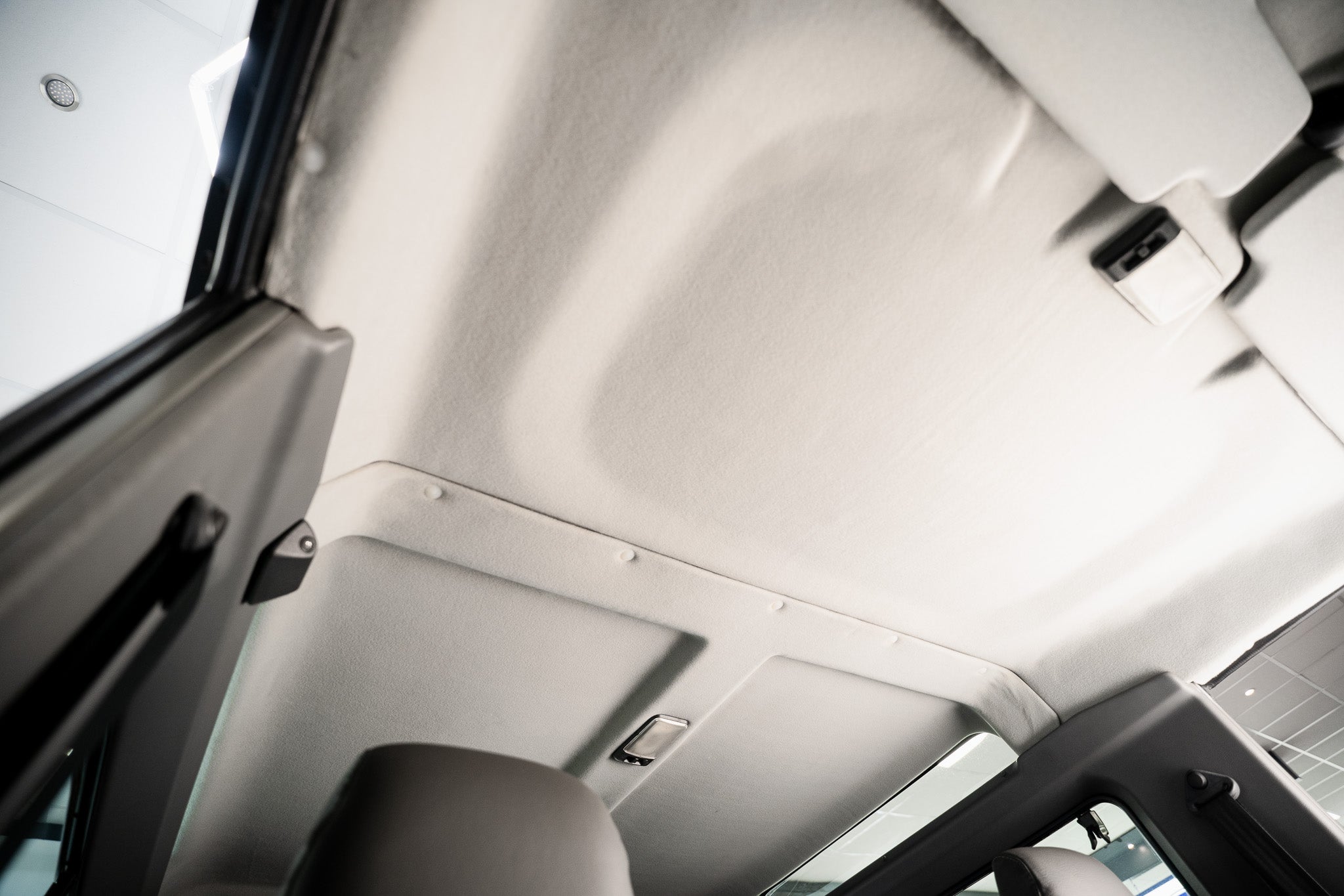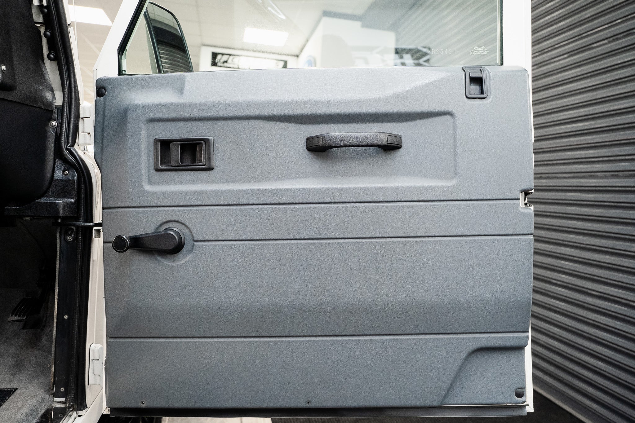 Both front grey door cards present in clean, original condition minimal yet perfectly functional, equipped with manual wind-down windows, sturdy door pulls and release latches. Overhead, the sculptured grey headlining stretches front to rear in excellent order, complemented by matching sun visors and both front and rear roof-mounted interior lights.