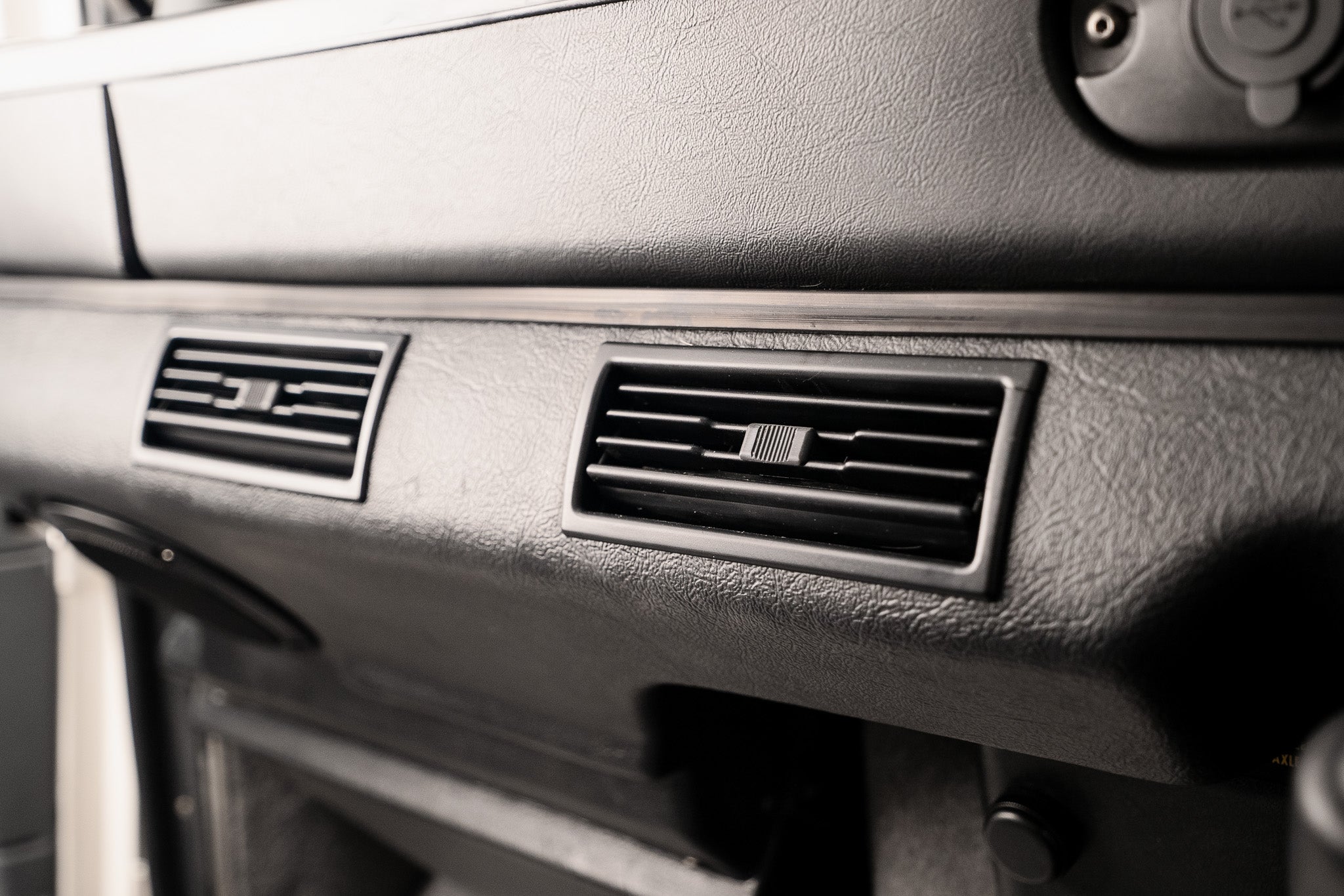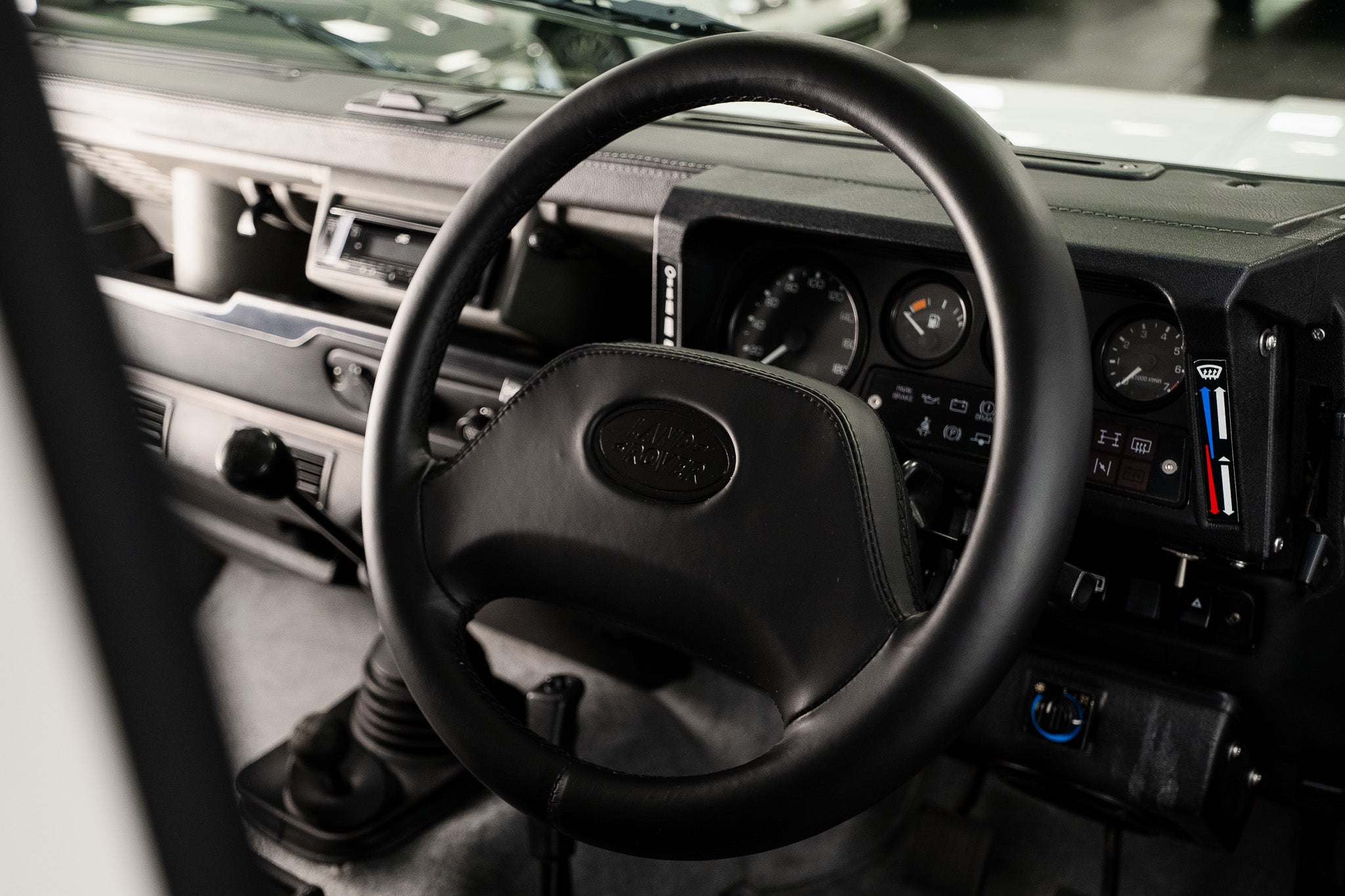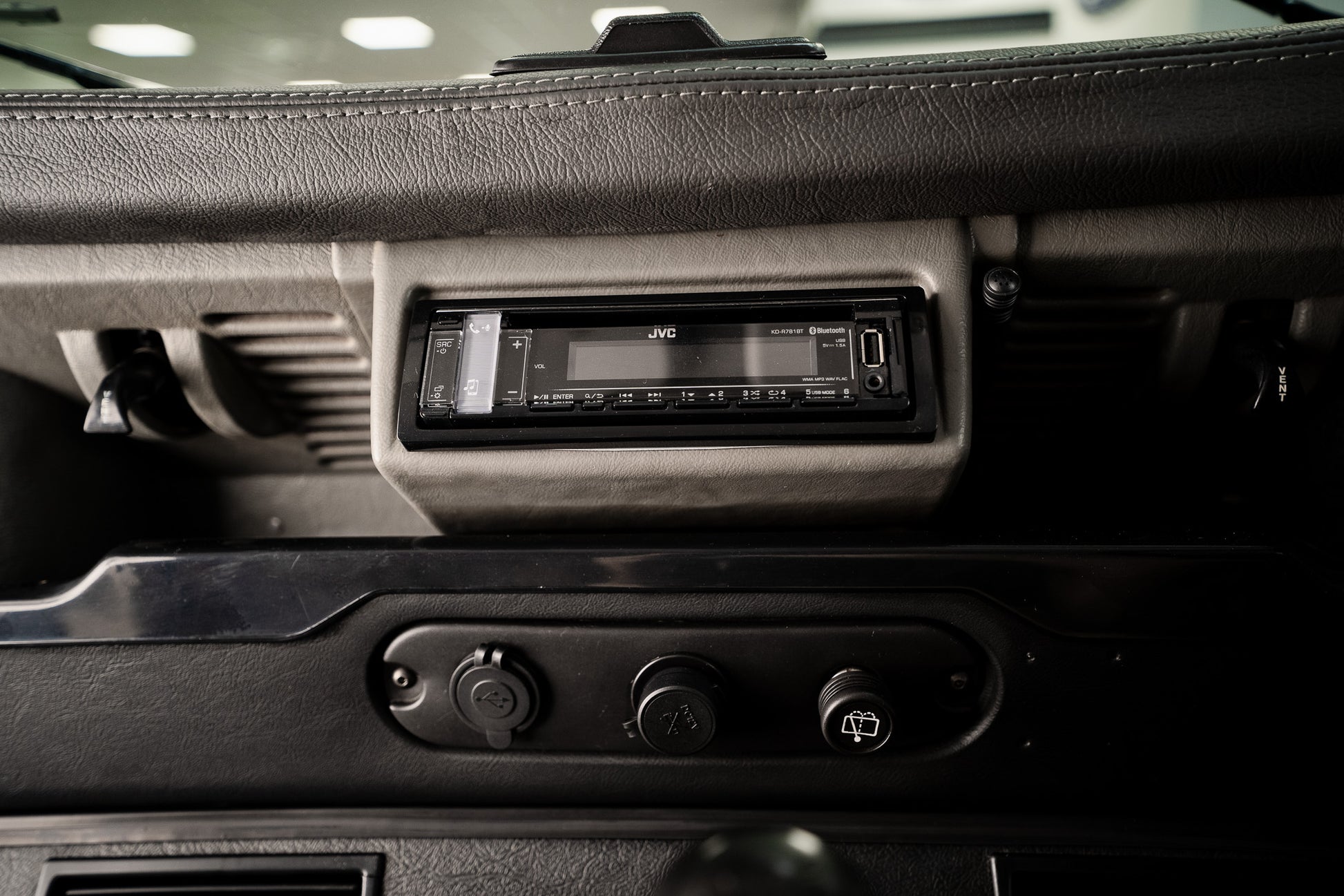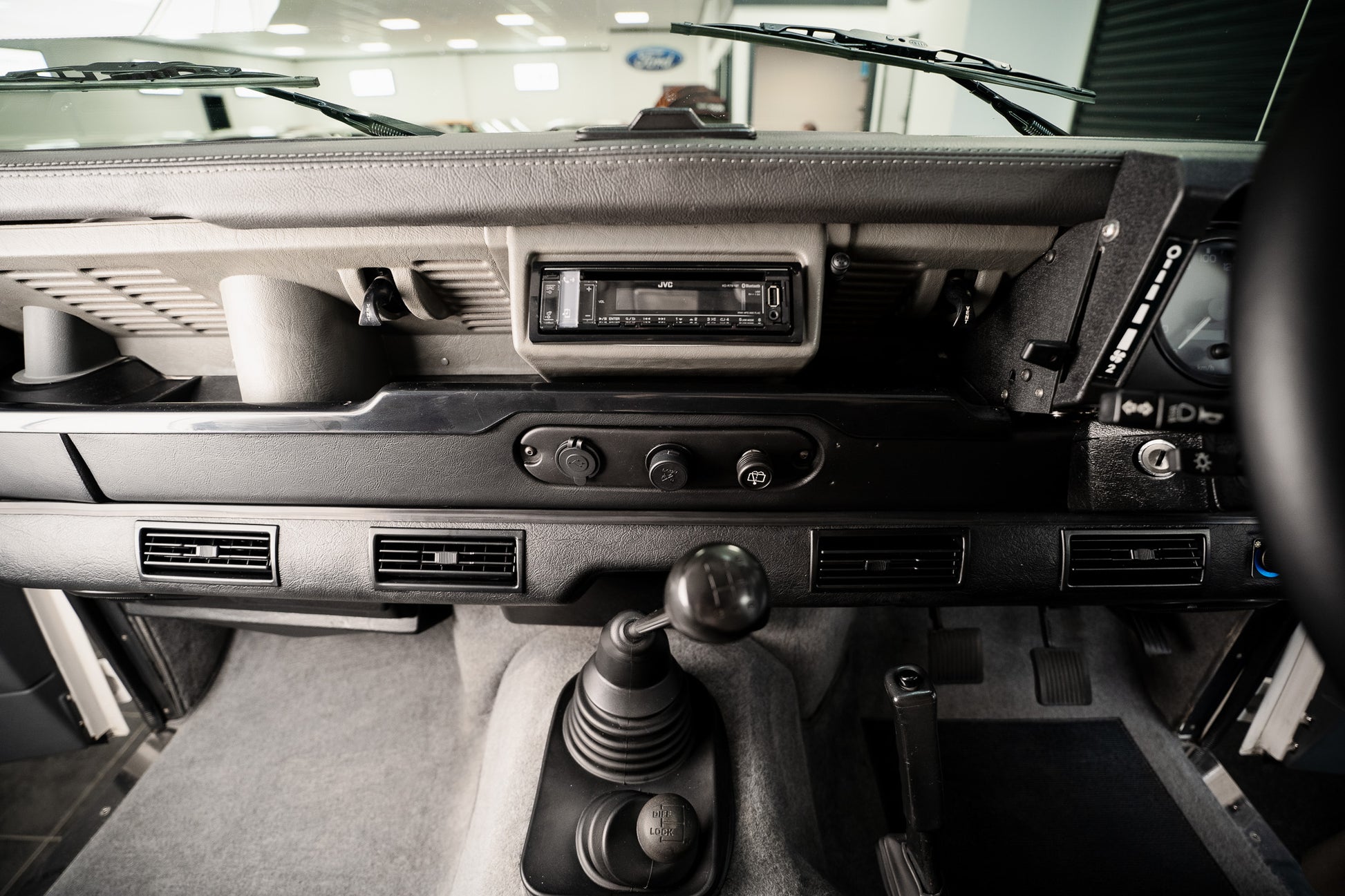 The dash itself remains minimal but entirely functional, just as a Defender should be. Four adjustable air vents run cleanly from left to right, supplying direct and effective airflow. A modern JVC Bluetooth sound system is integrated neatly into the dash alongside an integrated USB multi-charging socket, bringing contemporary convenience without interrupting the vehicle’s purposeful layout.