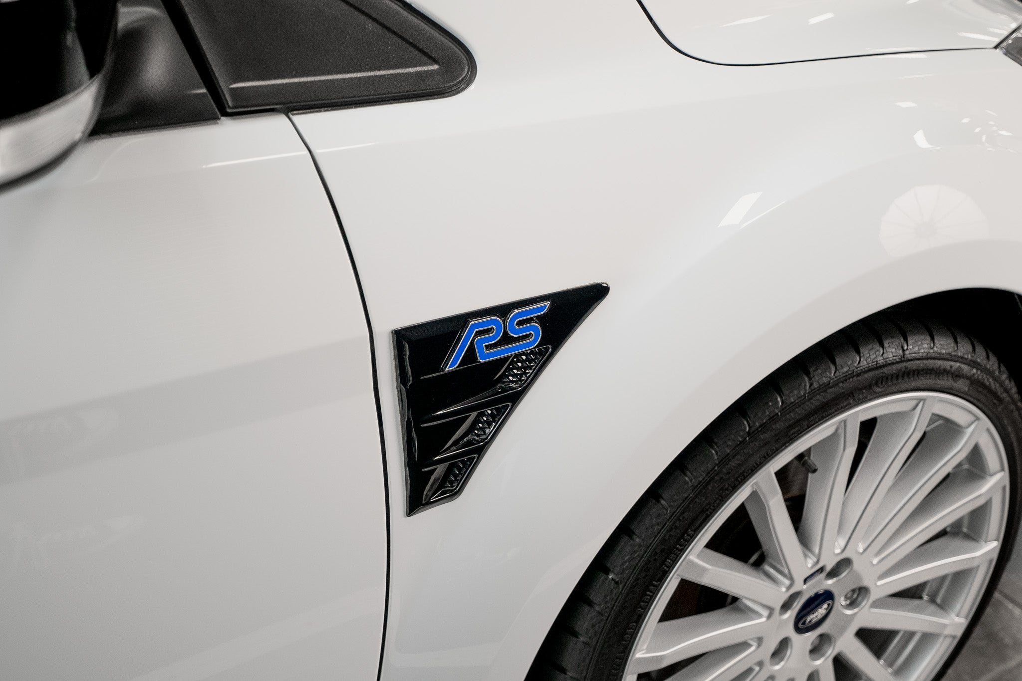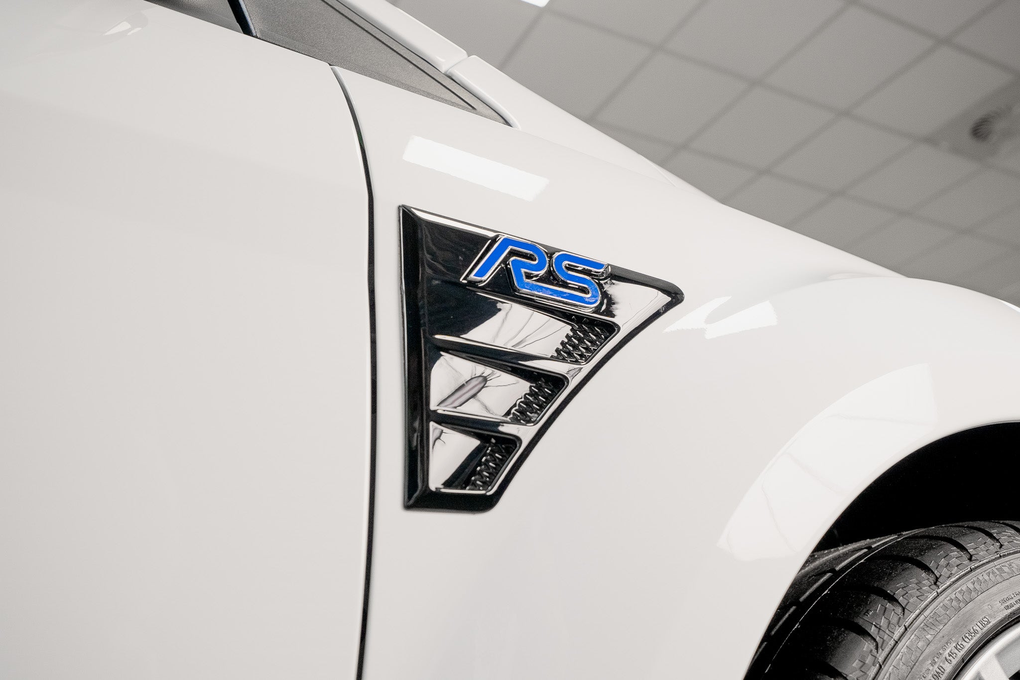 Wide, flared arch extensions give the RS its iconic stance, each one perfectly contoured and absolutely pristine. The Frozen White paintwork contrasts dramatically with the black aerodynamic inserts and vivid blue RS badging, a combination that emphasises the car’s aggression while celebrating its heritage.