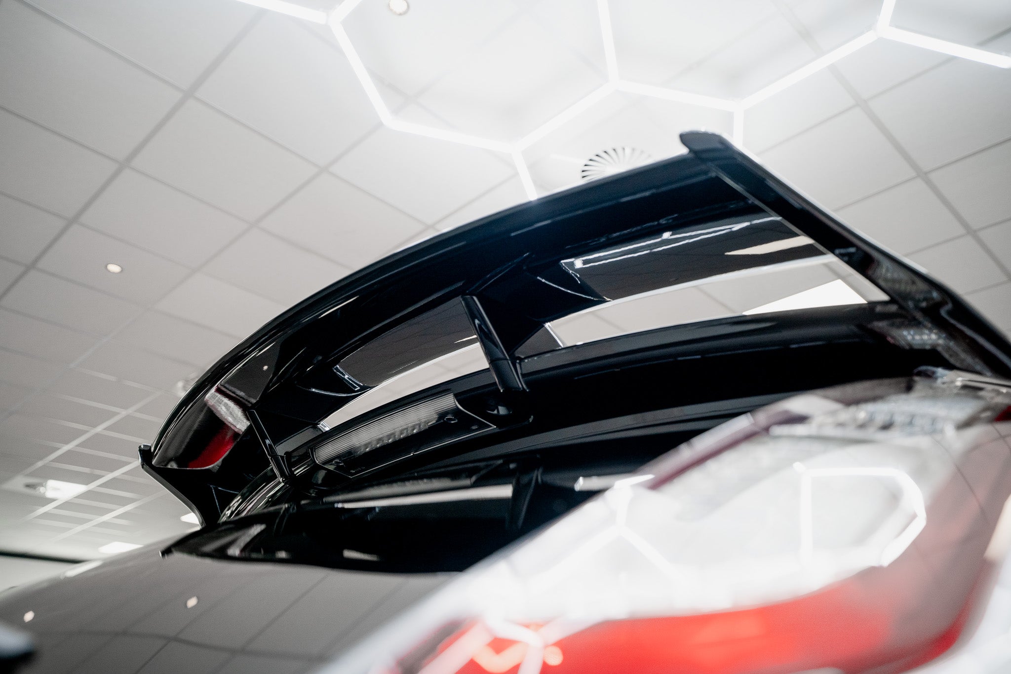 At the rear, the colour-coded bumper carries a lower black diffuser-style panel housing the dual exhaust outlets which complements the RS’s voice without ensuring originality. Above it all sits the unmistakable twin-blade rear spoiler functional, stable, and visually dominant without being overbearing, keeping the chassis planted at speed and reminding you this car was engineered with performance at its core.
