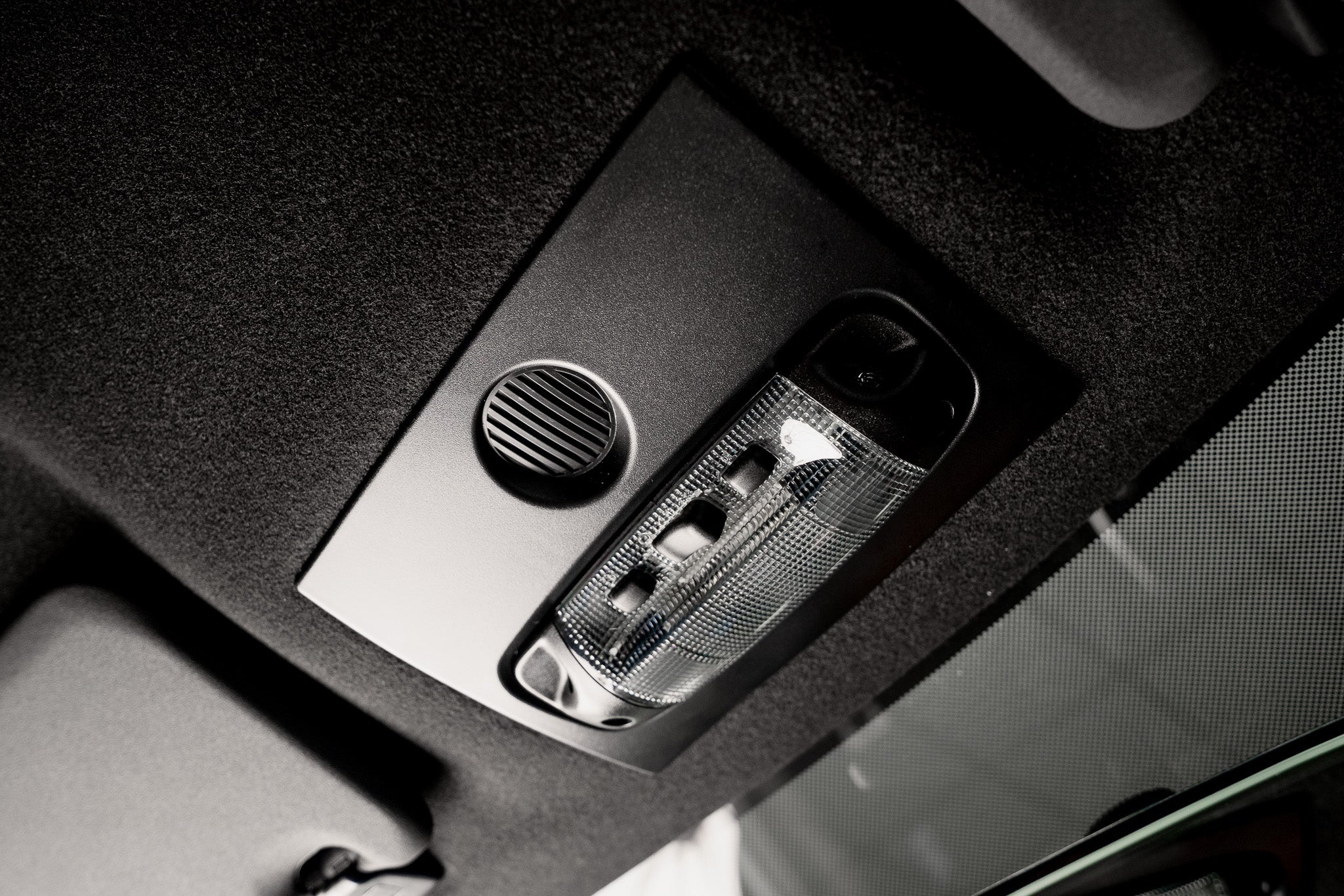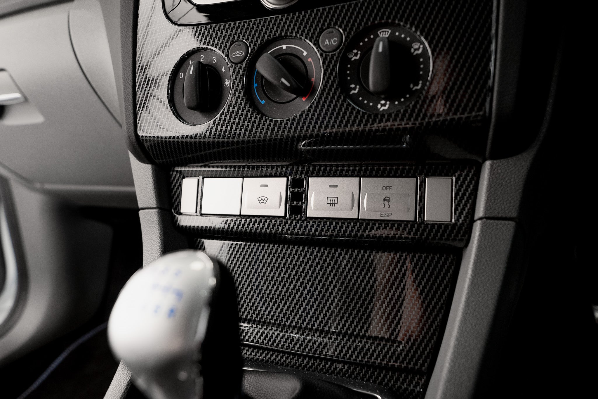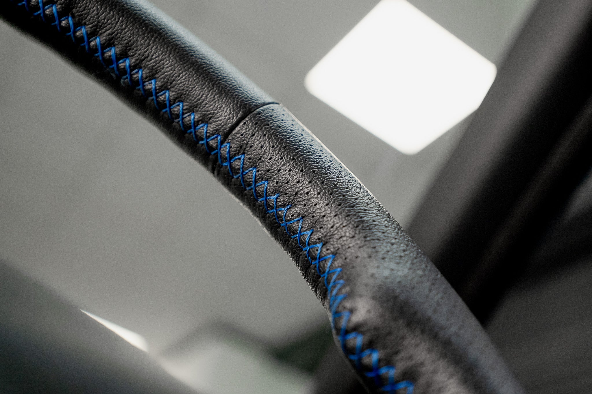 Sitting behind the wheel, the driver is met with a perfectly preserved black leather steering wheel with blue stitching, the leather still matte and unworn. Centre stage, the smoked carbon-effect console frames the start button, a signature RS detail and one that contributes to the sense of theatre every time the engine is awakened.