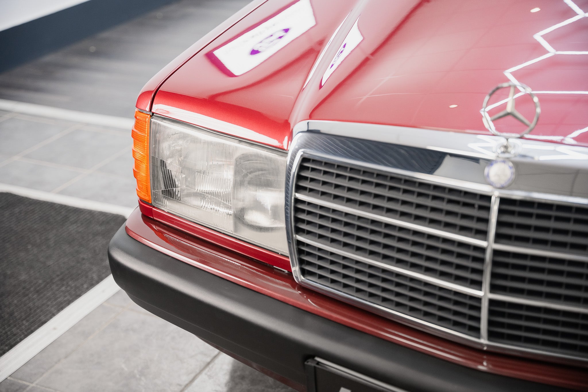 Proudly positioned at the leading edge of the bonnet sits the iconic Mercedes-Benz three-pointed star, standing tall above the grille as a symbol of the brand’s engineering heritage. The front wraparound bumper is colour-coded with black trim and beautifully preserved, free from scuffs or distortion