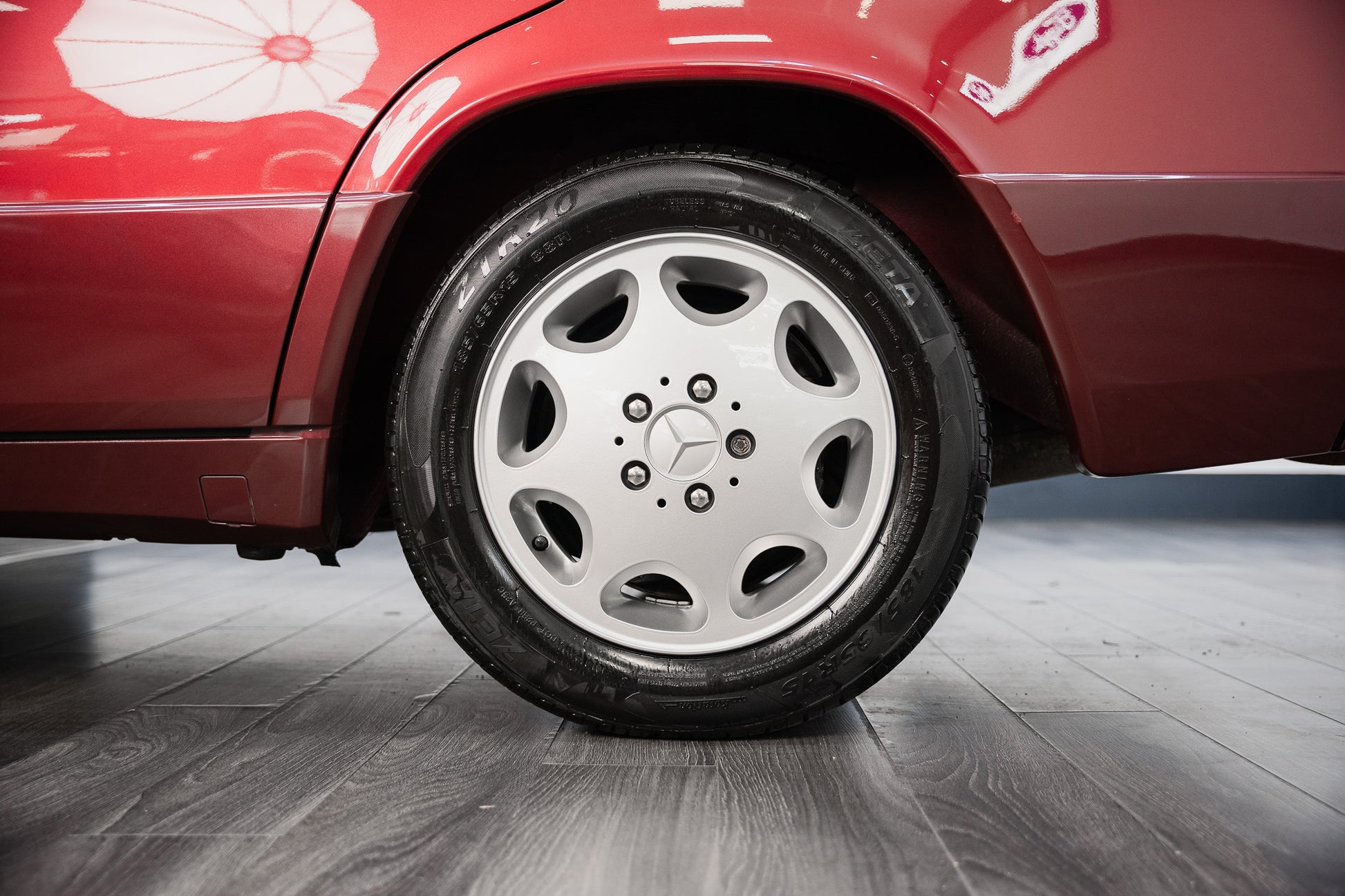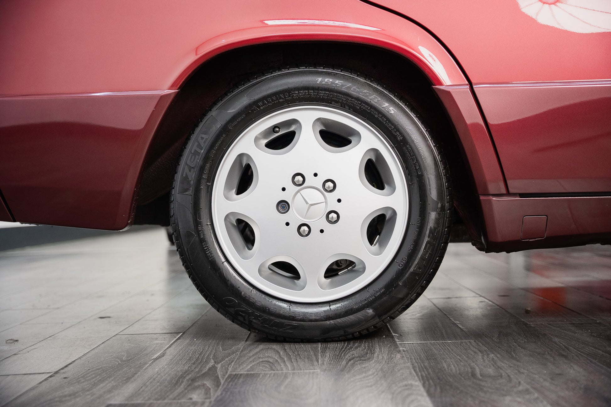 This 1993 Mercedes-Benz 190E retains its correct and highly desirable 15-inch ‘Gullideckel’ eight-hole silver alloy wheels, presented in immaculate condition. The finish across all four alloys remains bright and uniform, free from kerbing or corrosion, perfectly complementing the car’s understated executive styling. Fitted to each corner are 185/65 R15 tyres, all displaying ample tread depth and providing the correct balance of ride comfort, steering precision, and road holding characteristics as intended by Mercedes-Benz.