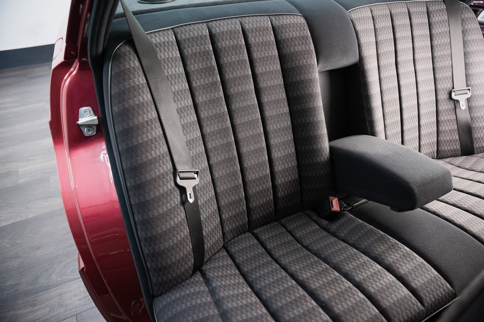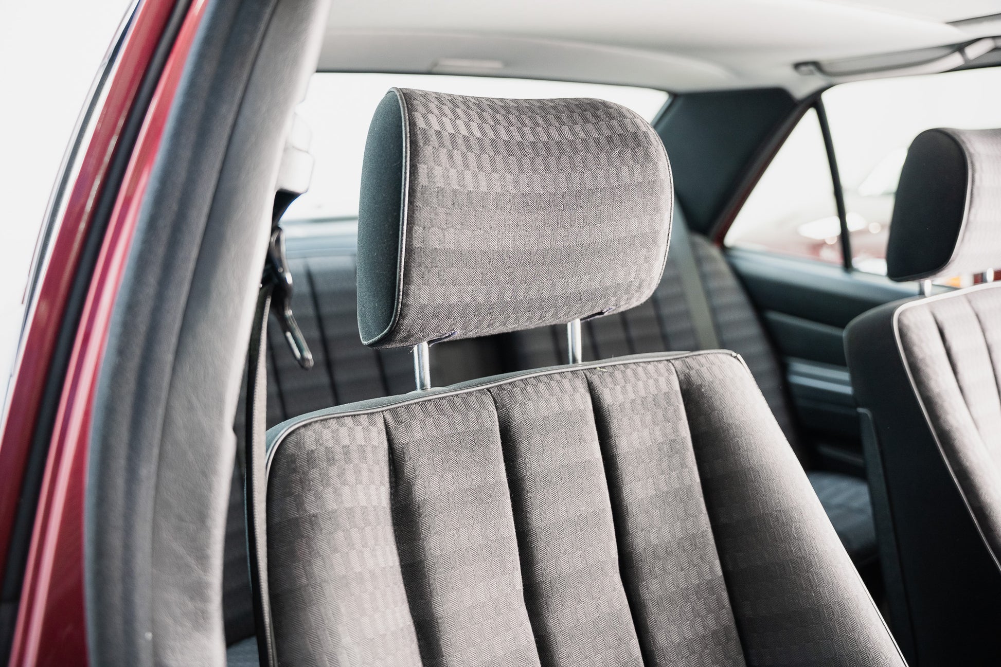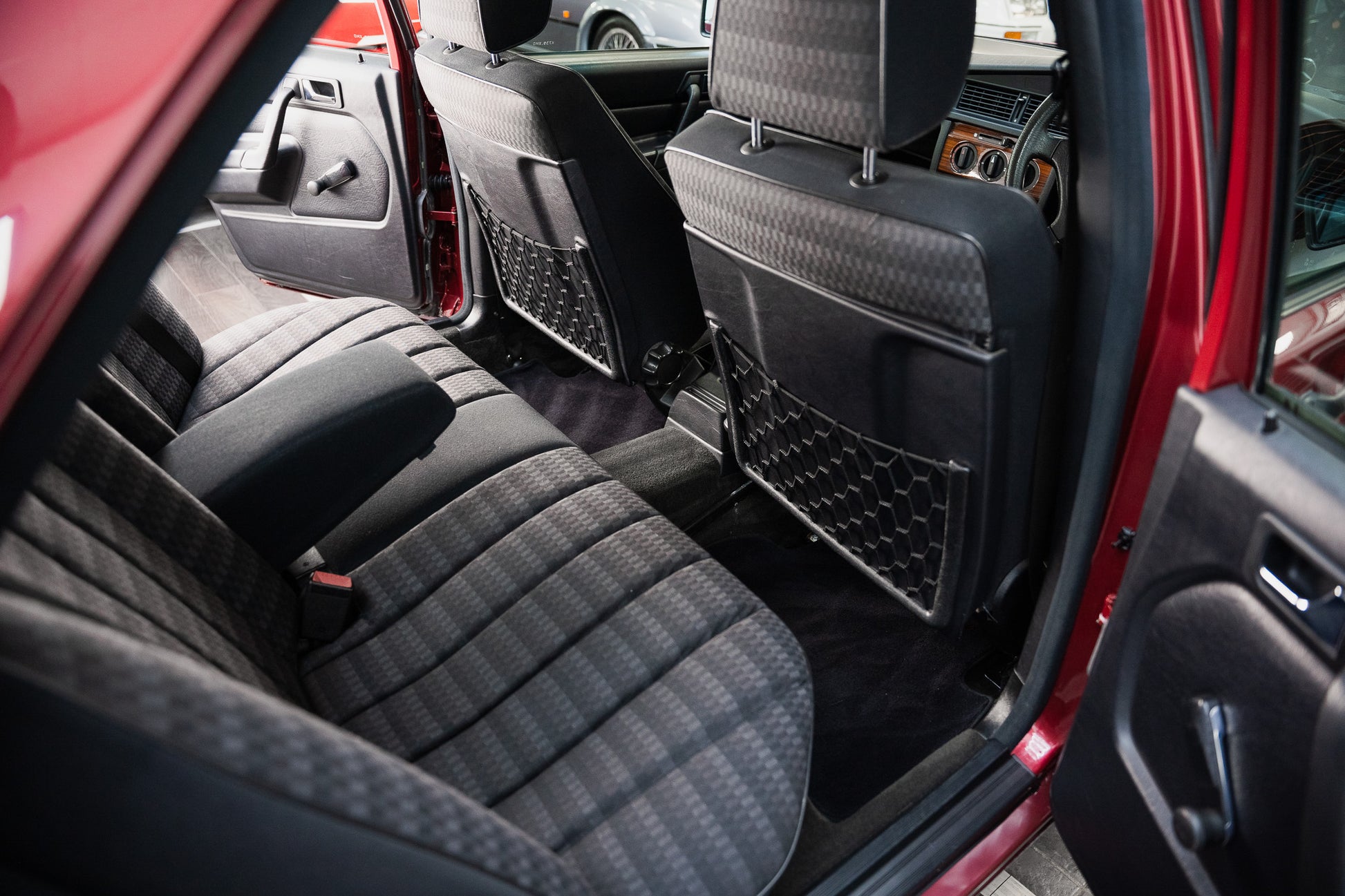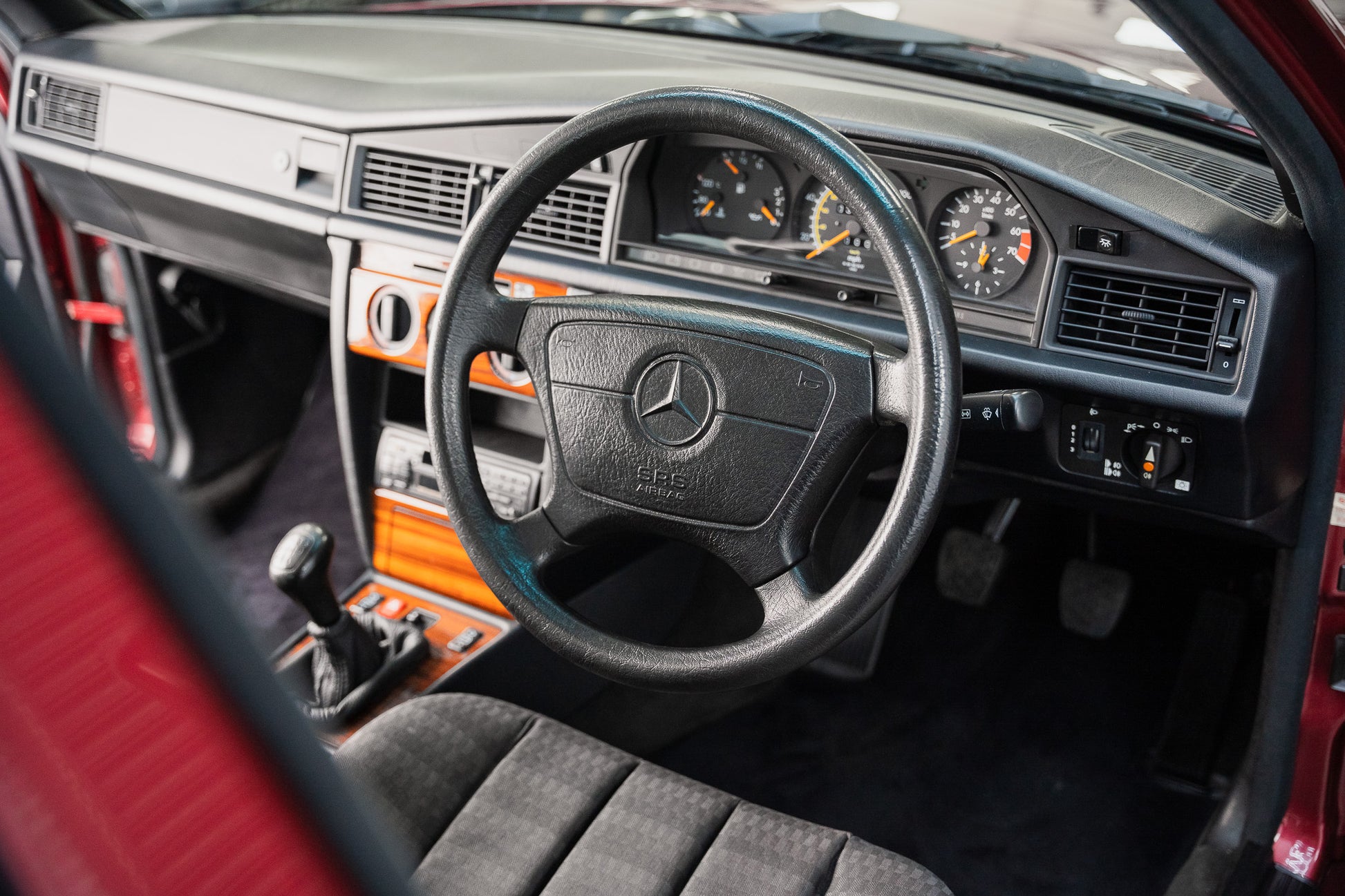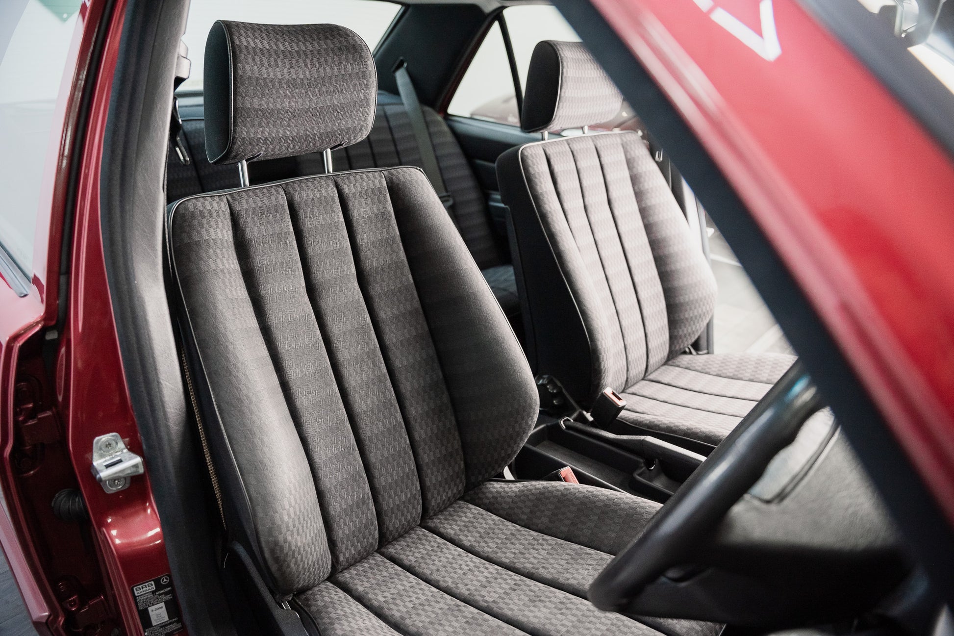 Finished in the highly desirable Almandine Red Metallic (Paint Code 512), this 1993 Mercedes-Benz 190E presents with a deep, lustrous finish that perfectly complements the W201’s crisp, engineered lines. The paintwork retains an even, uniform gloss across every panel, reflecting both the car’s low mileage and the care it has received throughout its life. The rich metallic tone enhances the 190E’s understated yet purposeful stance, offering a refined presence that remains timeless.