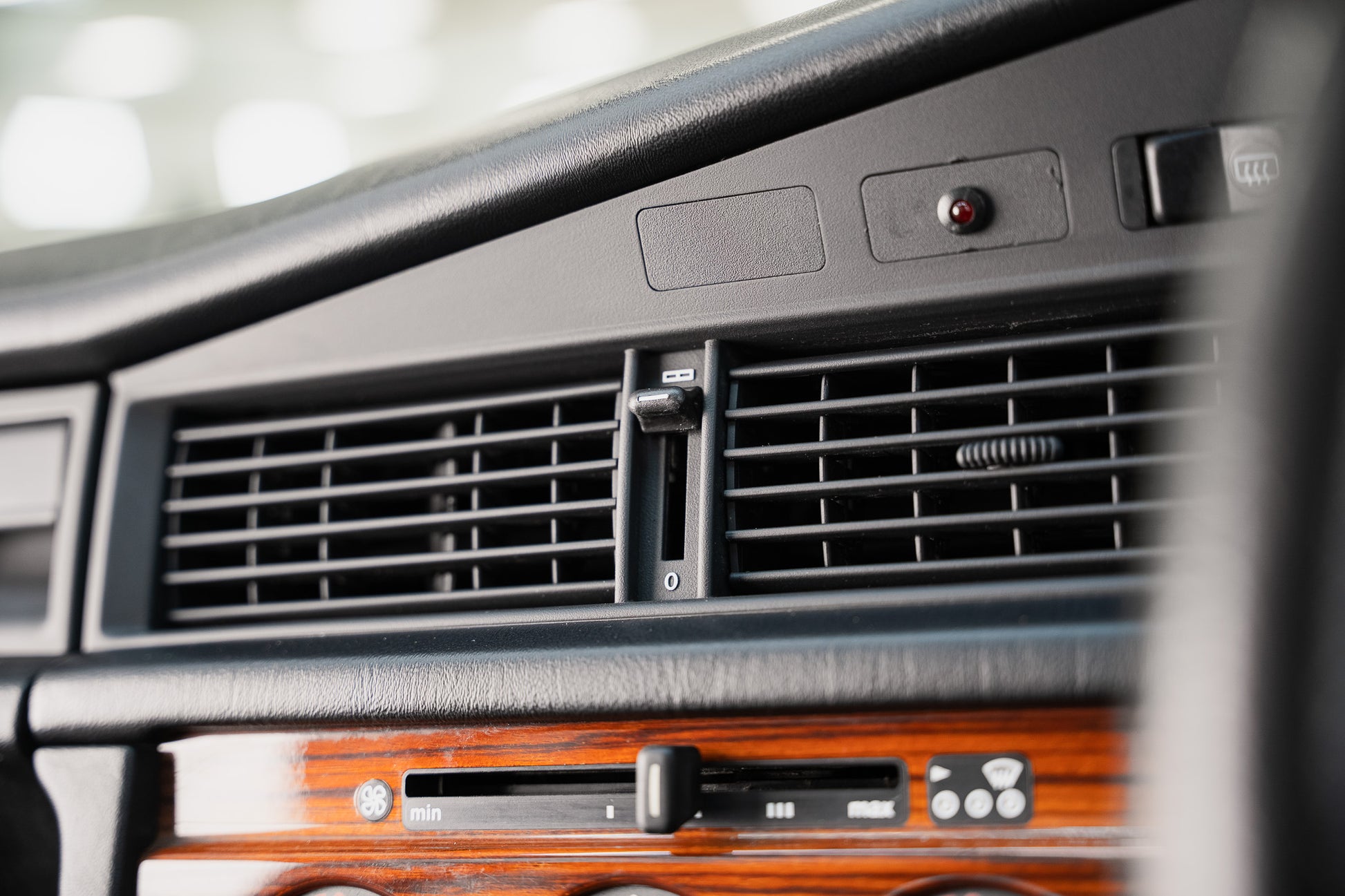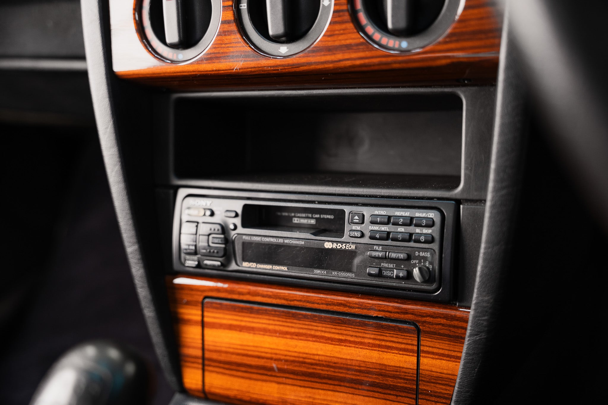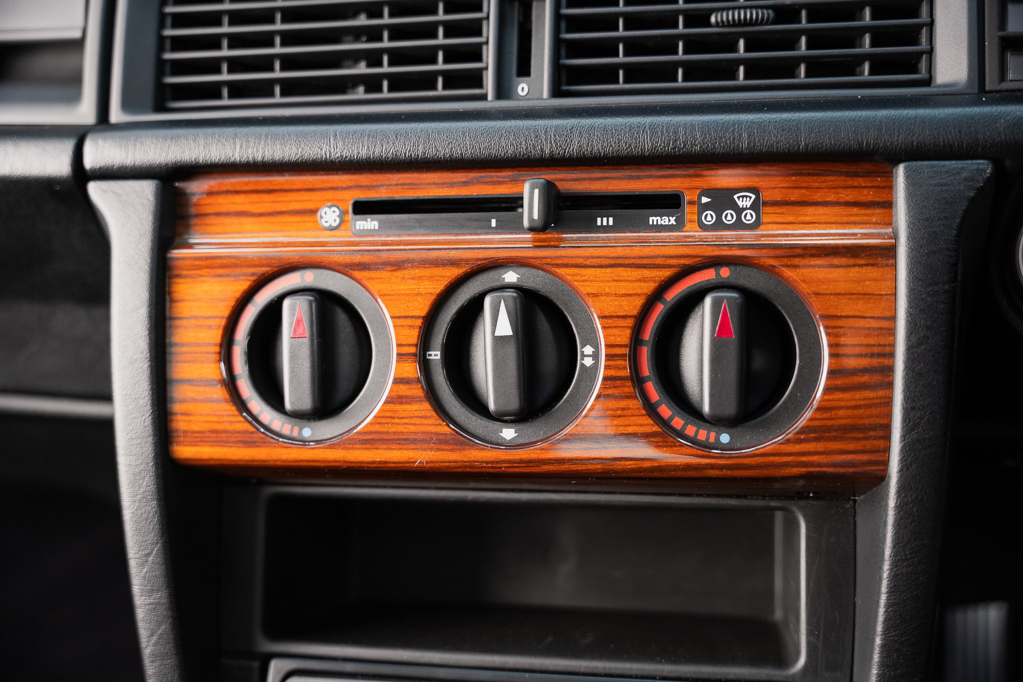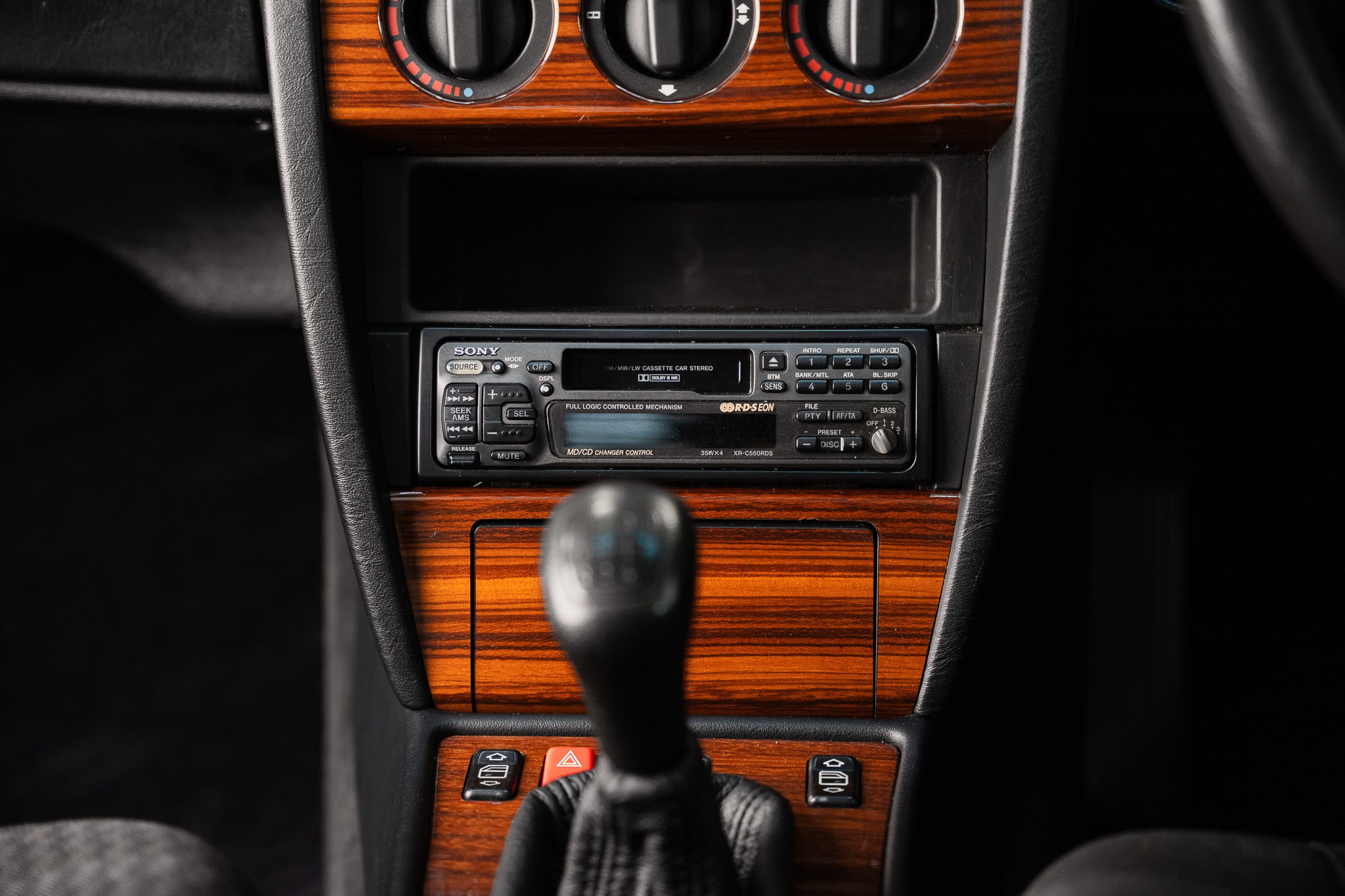 This example is equipped with rotary controls for fan speed, hot & cold air and directional airflow. The controls show minimal signs of use and operate smoothly, delivering effective climate management as designed. Sony retro music cassette system fitted having the original Blaupunkt speakers within