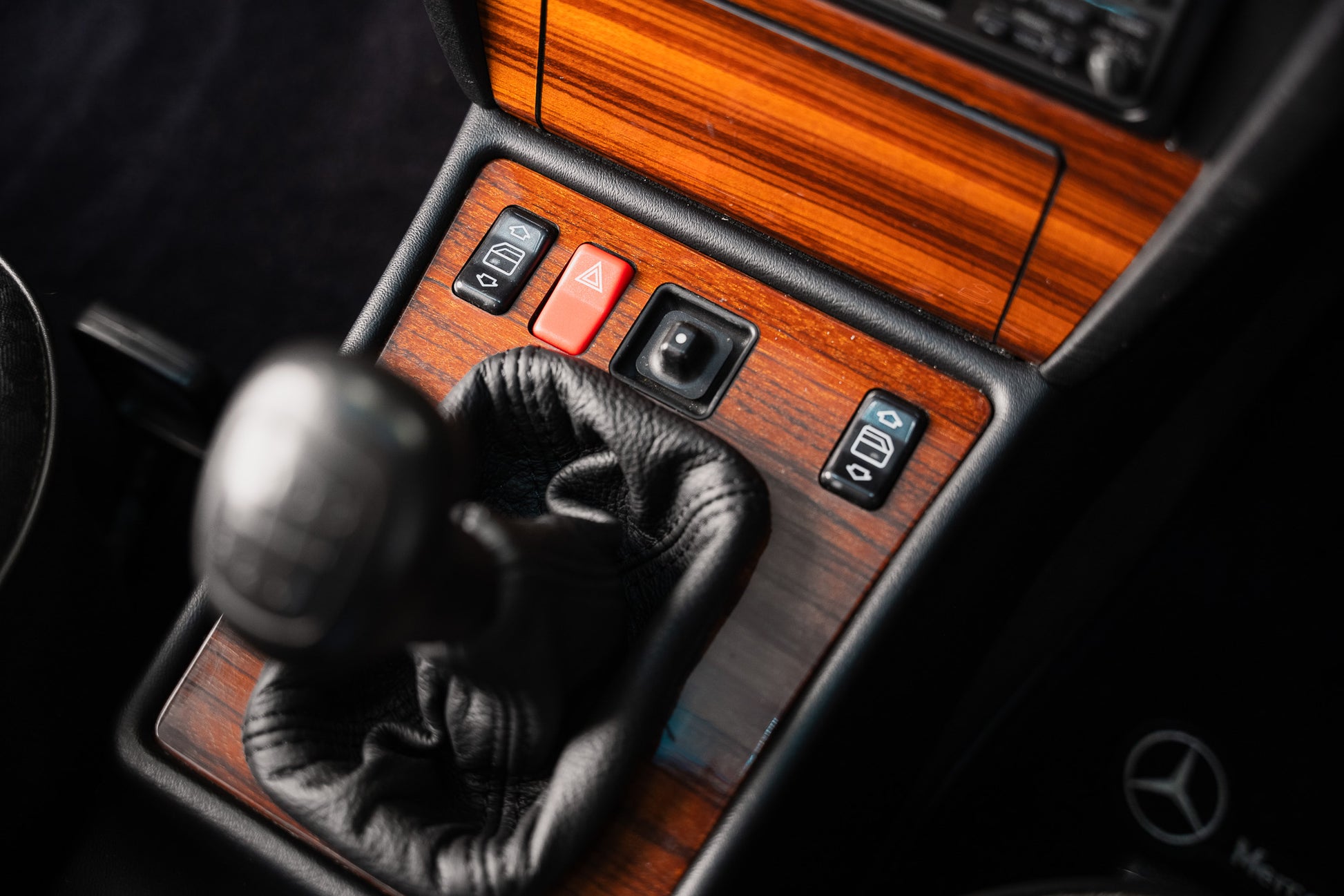 Below the veneer panel, the original smokers pack sit neatly concealed behind a push-open wooden cover, The centre console incorporates the 5 speed gear lever showing little wear, Surrounding this are the electric window switches for the front windows, each functioning smoothly, along with the electrically operated mirror adjustment control.