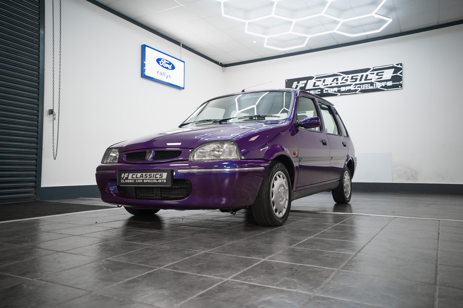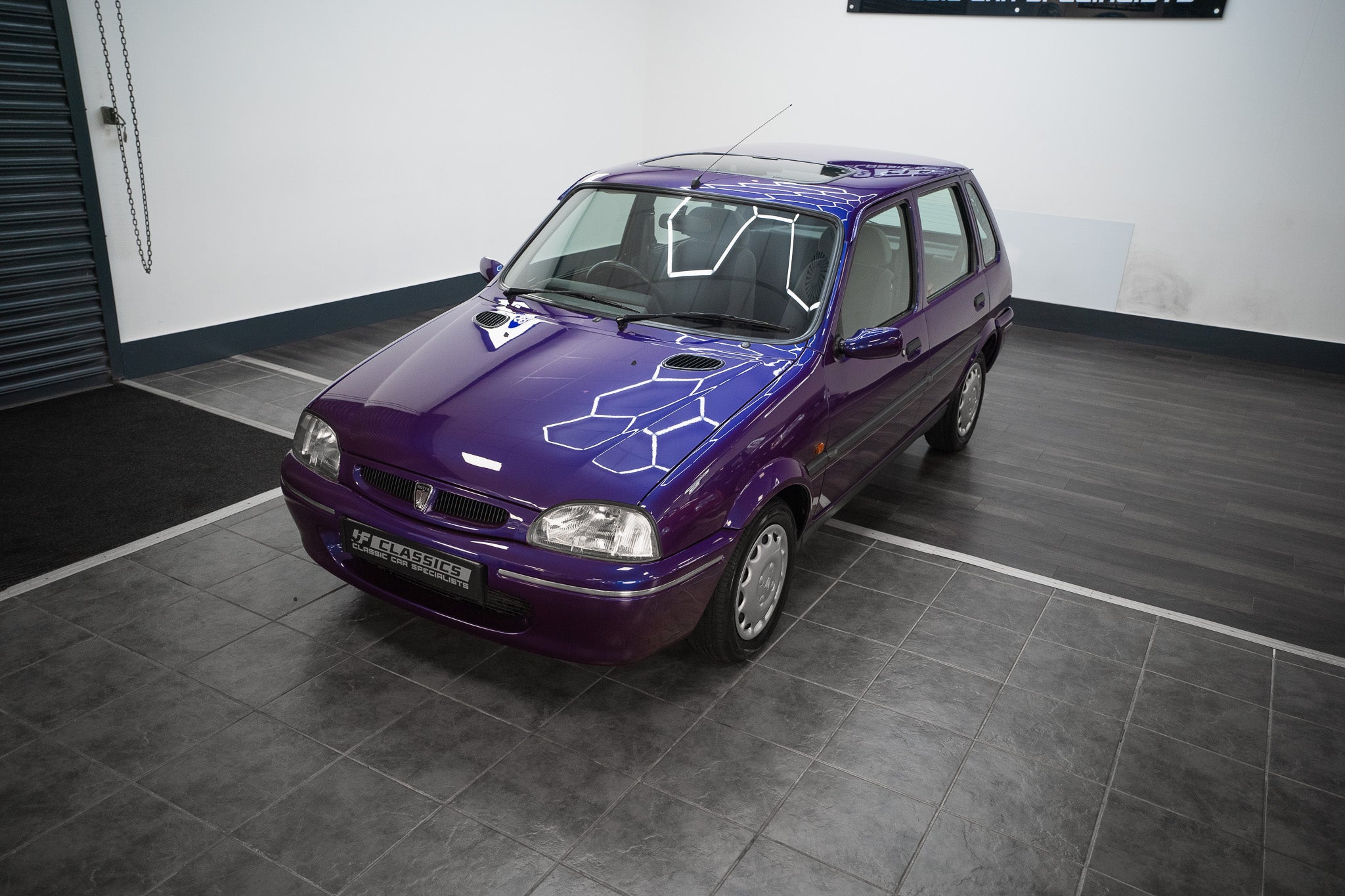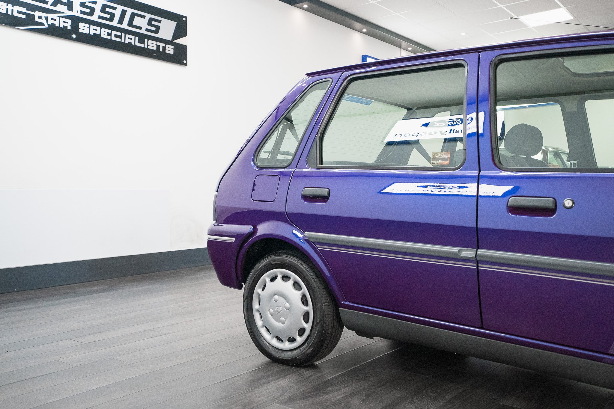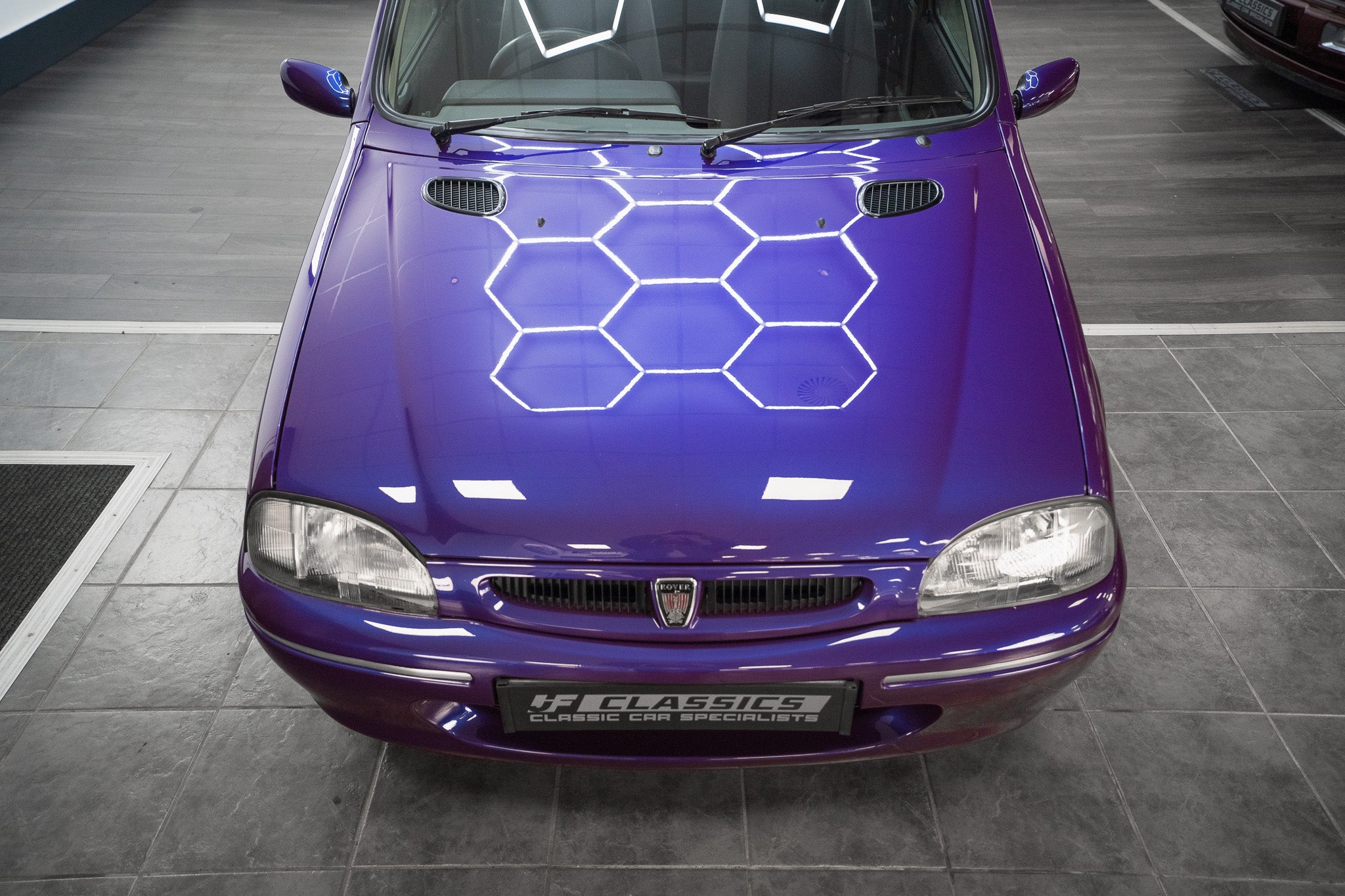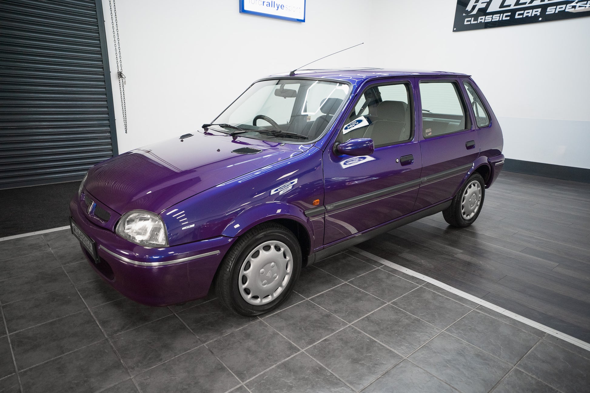 The exterior design is a wonderful reminder of mid-’90s British styling compact, boxy, and full of character. The Amaranth Metallic paintwork is nothing short of breathtaking, boasting a deep, lustrous gloss across all panels, exactly as it left the factory. Panel gaps are pin-sharp and consistent, and every surface retains a mirror-like shine that exudes careful ownership and indoor storage throughout its life.