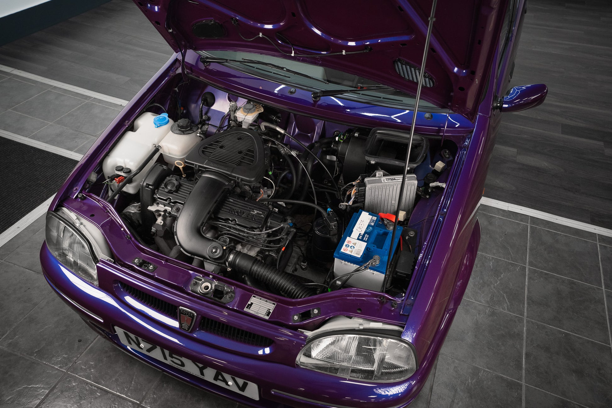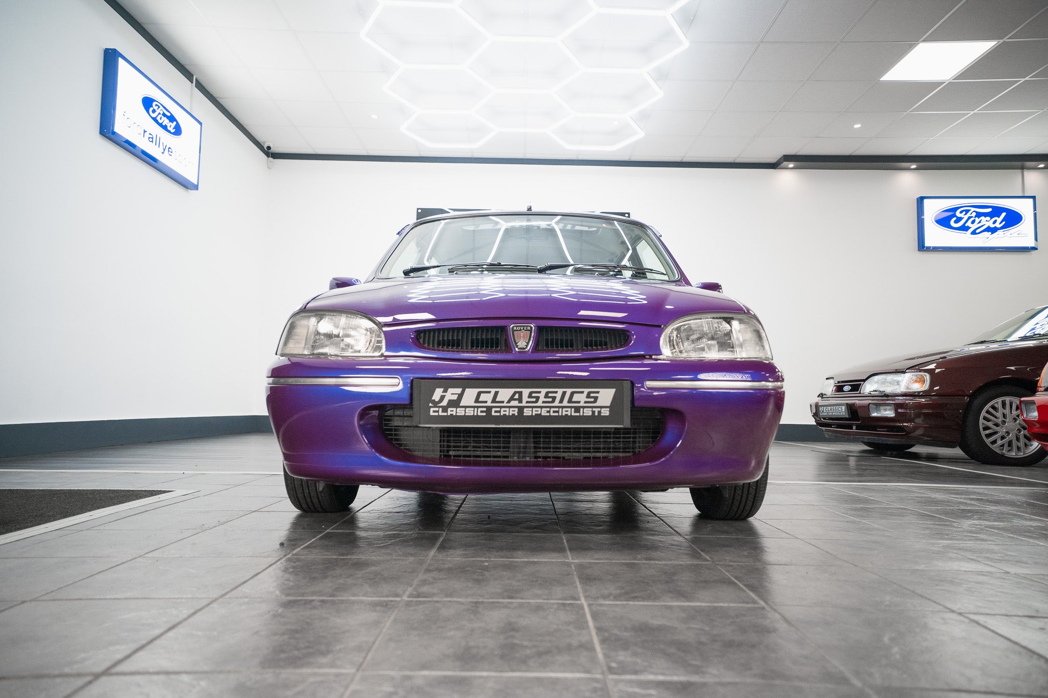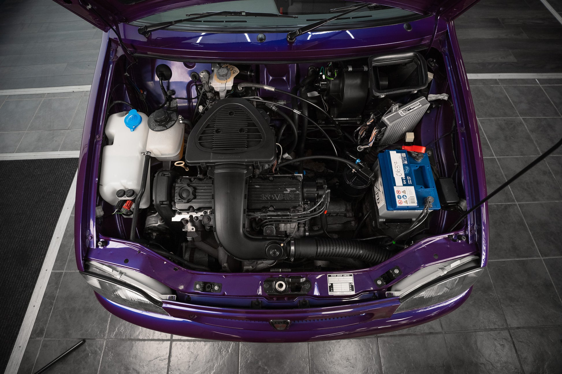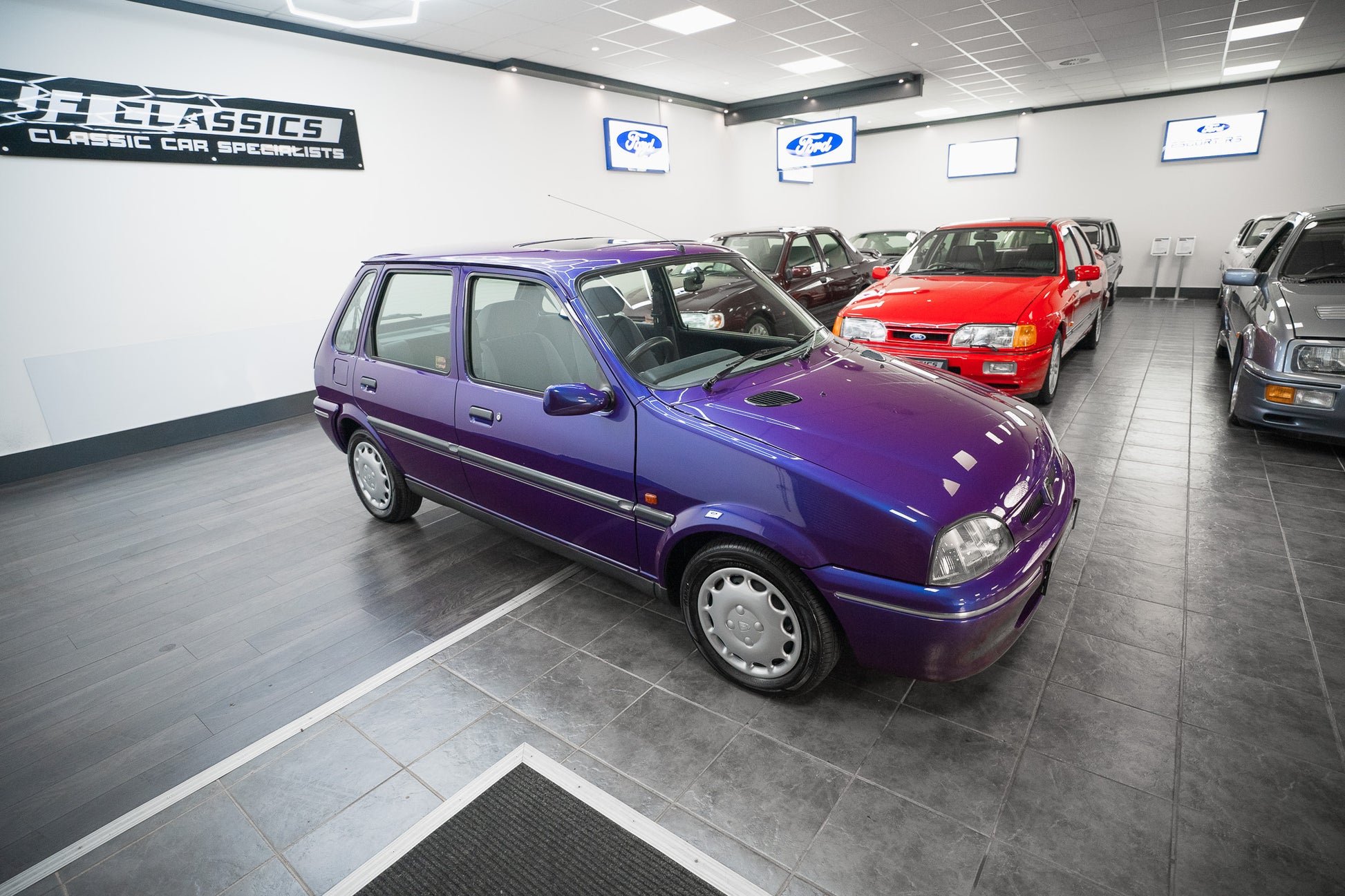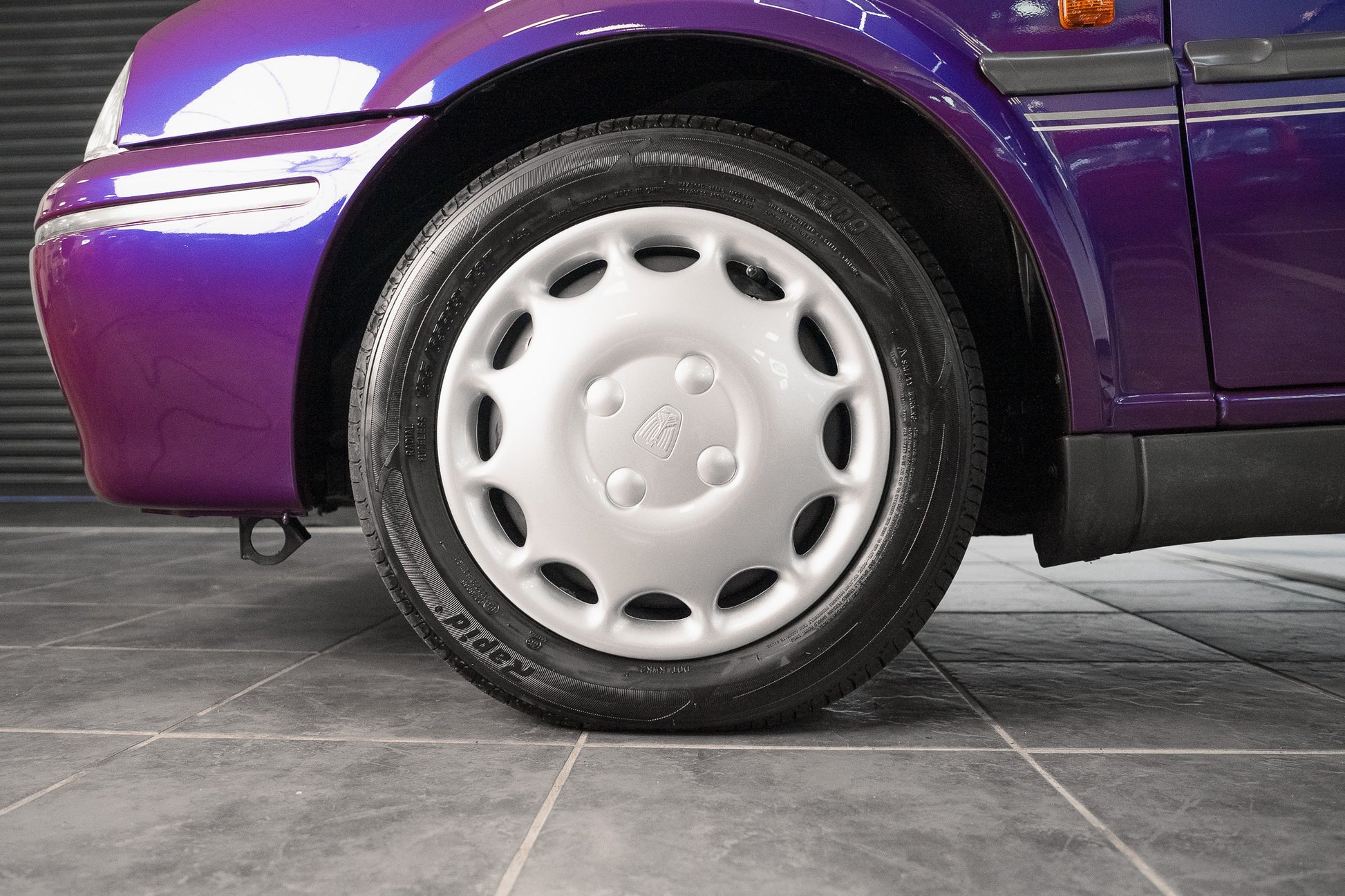 The exterior design is a wonderful reminder of mid-’90s British styling compact, boxy, and full of character. The Amaranth Metallic paintwork is nothing short of breathtaking, boasting a deep, lustrous gloss across all panels, exactly as it left the factory. Panel gaps are pin-sharp and consistent, and every surface retains a mirror-like shine that exudes careful ownership and indoor storage throughout its life.