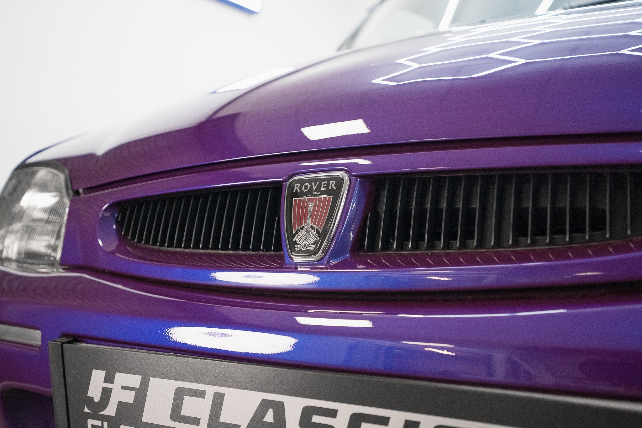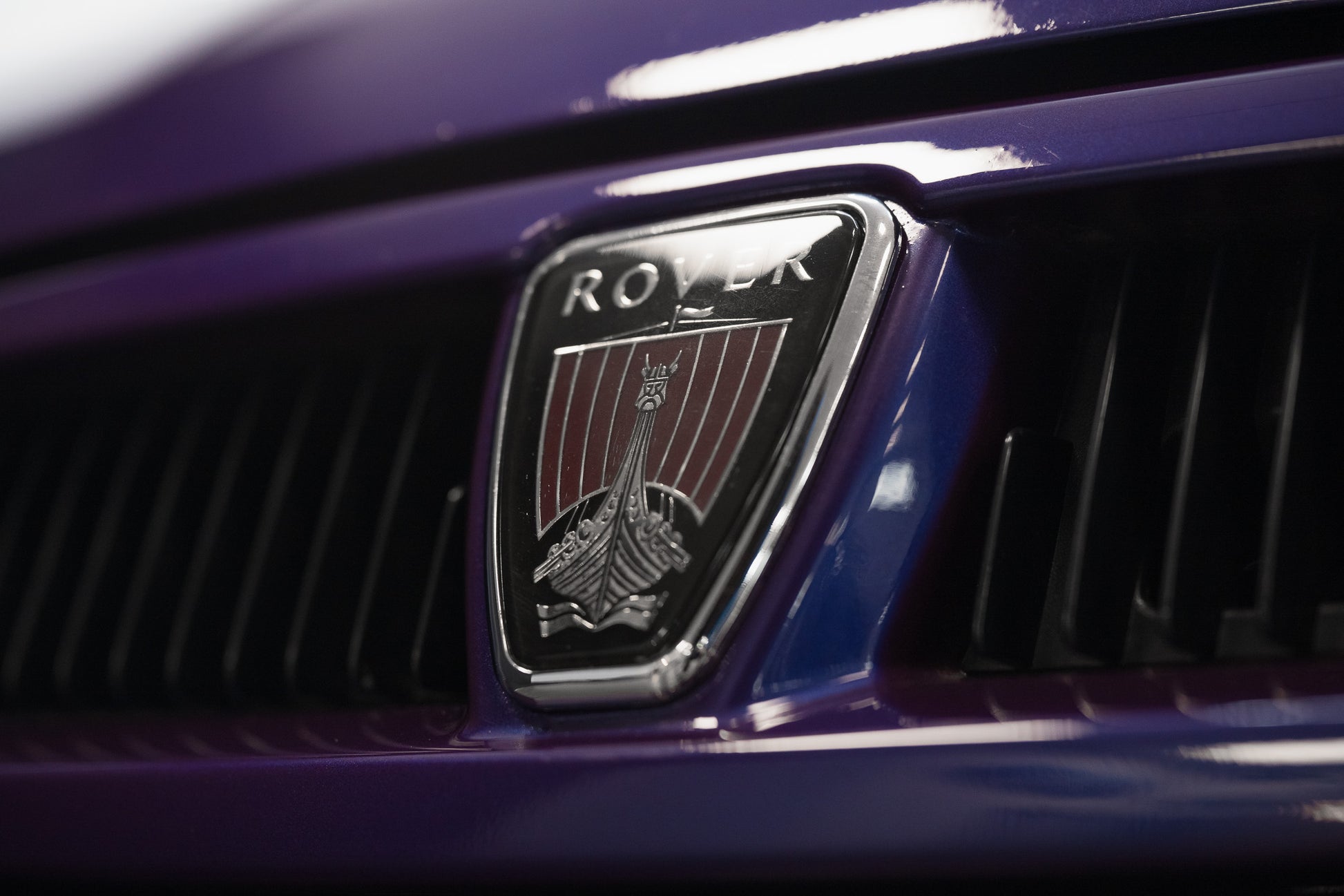 Both front and rear colour-coded bumpers with their distinctive silver accent strip remain mark and scuff-free, perfectly complementing the rich paint finish. The front grille, finished in the correct colour-coded surround with a black lattice centre, proudly displays the iconic Rover Viking longship badge sitting centre stage, a perfect finishing touch