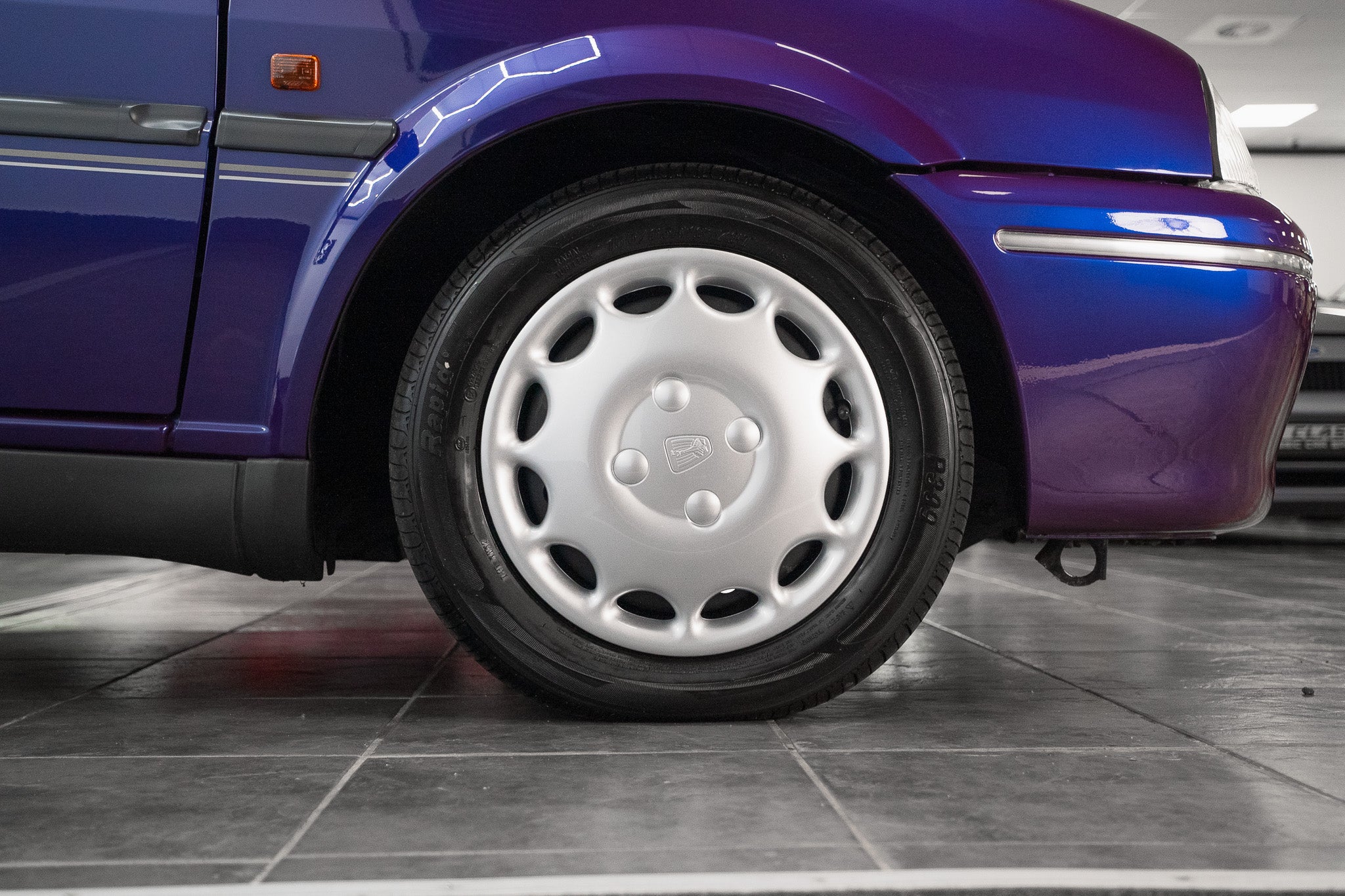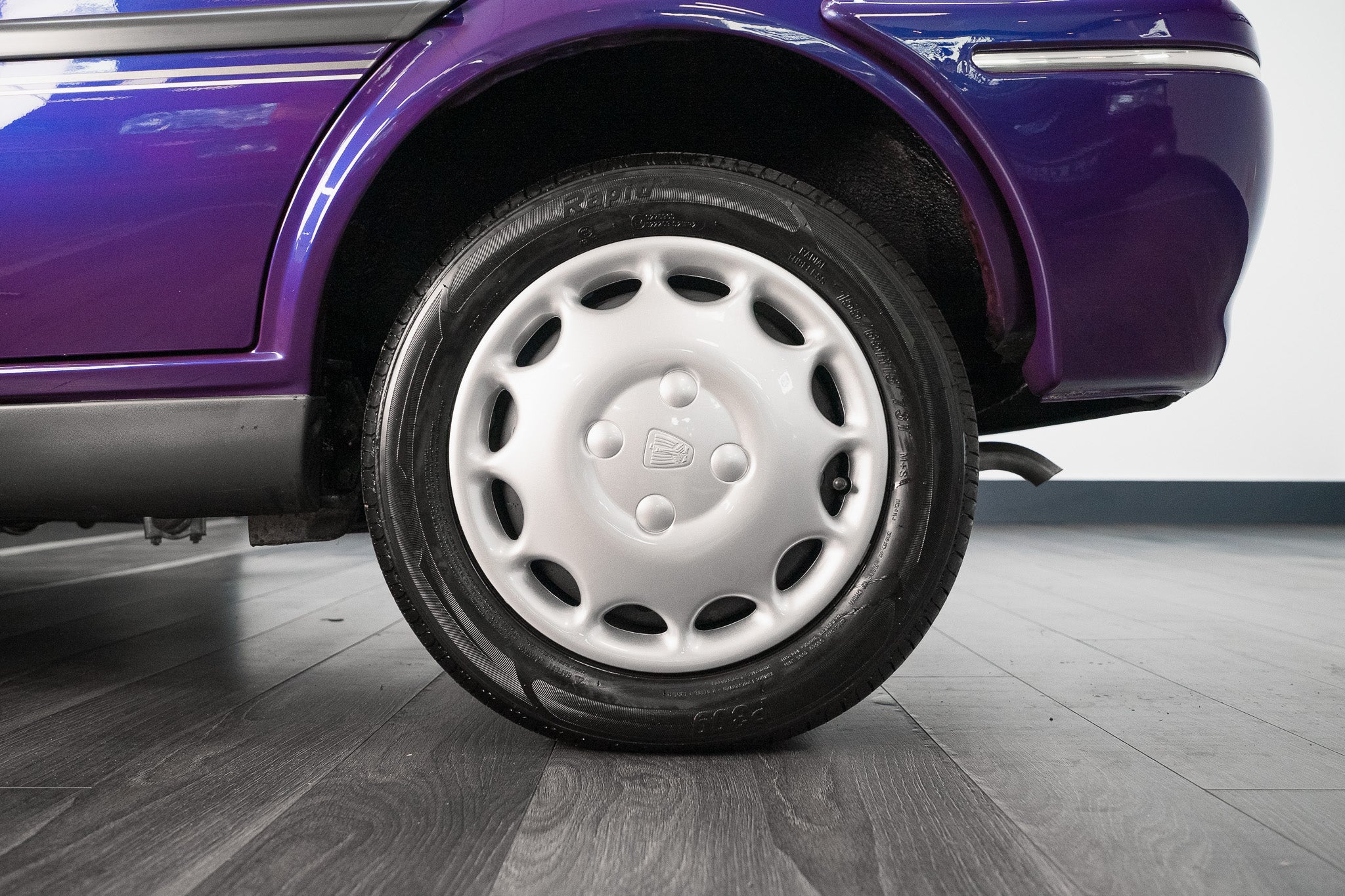 This superb example sits proudly on its original 13-inch pressed steel wheels, each still adorned with the factory-fitted Rover Silver wheel trims all present and in exceptional, scuff-free condition. The trims retain their bright metallic sheen with no cracking or discolouration, sitting perfectly aligned on steel rims that remain true and undamaged, exactly as they left Longbridge in 1995.