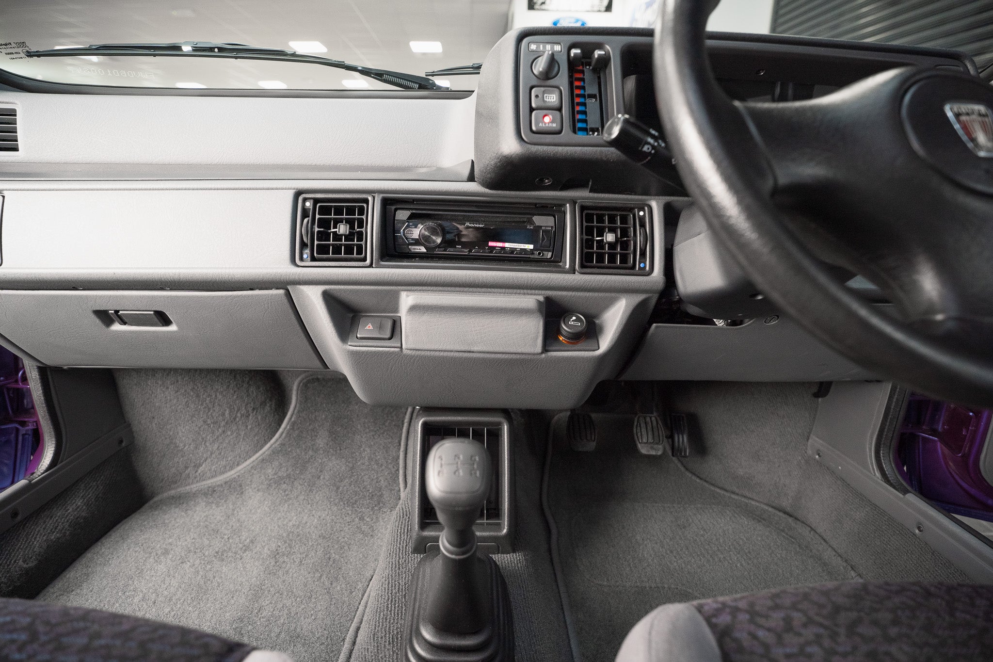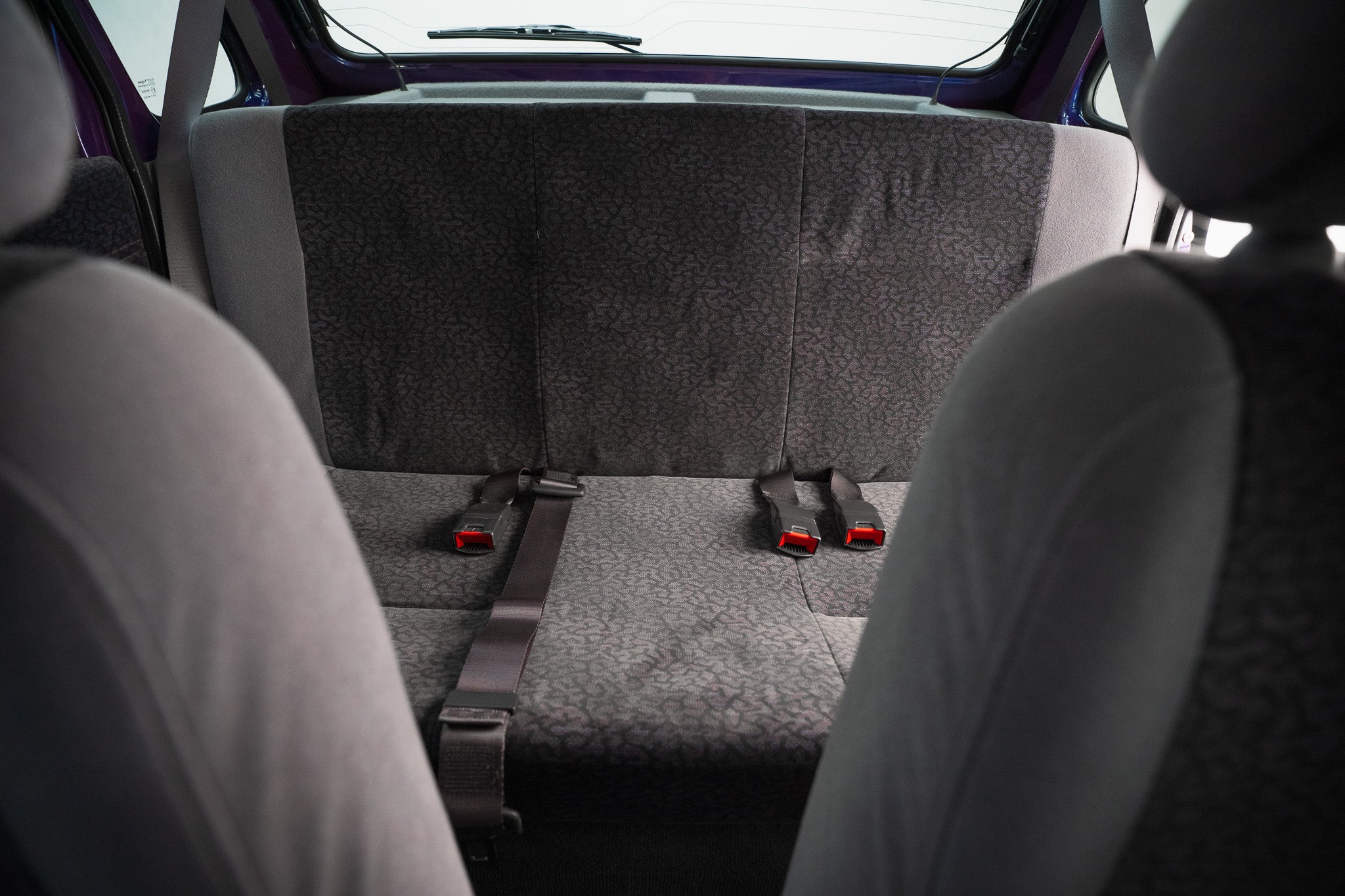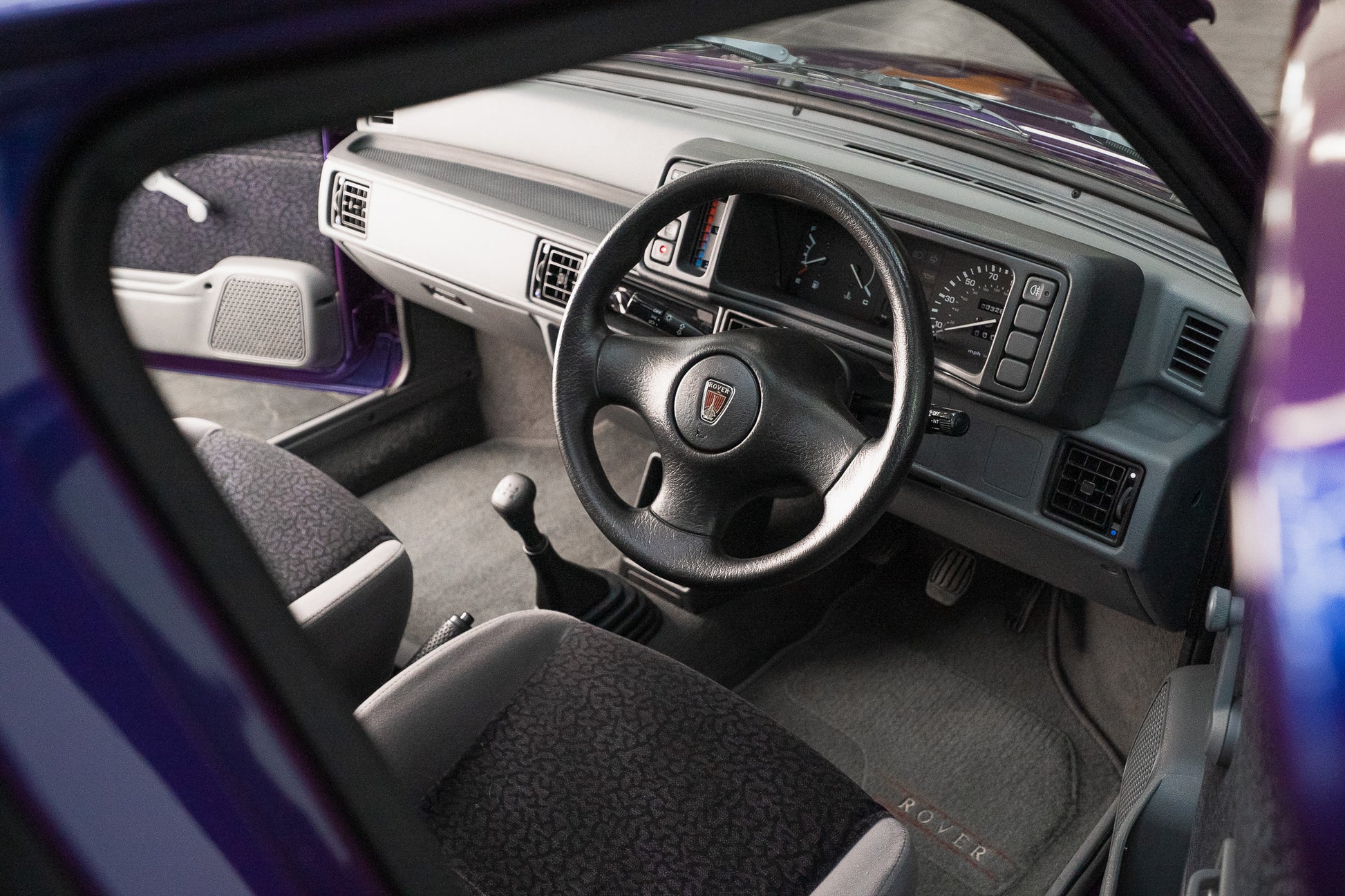 Seating is outstanding the chequered centre panels remain bright and crease-free, while the side bolsters retain their original shape and firmness, providing that unmistakable “new car” level of support. The grey carpeting still looks freshly laid, preserved by its set of genuine Rover Metro overmats fitted from day one.