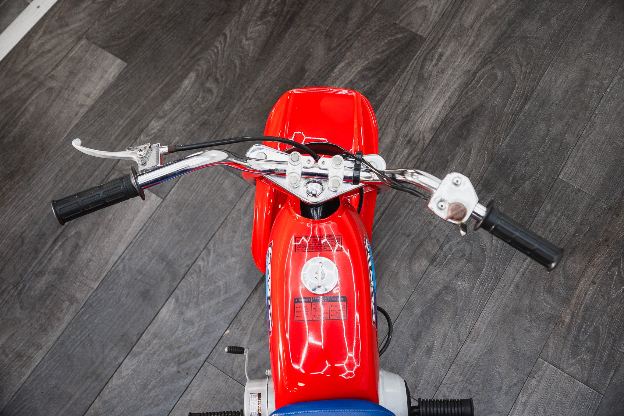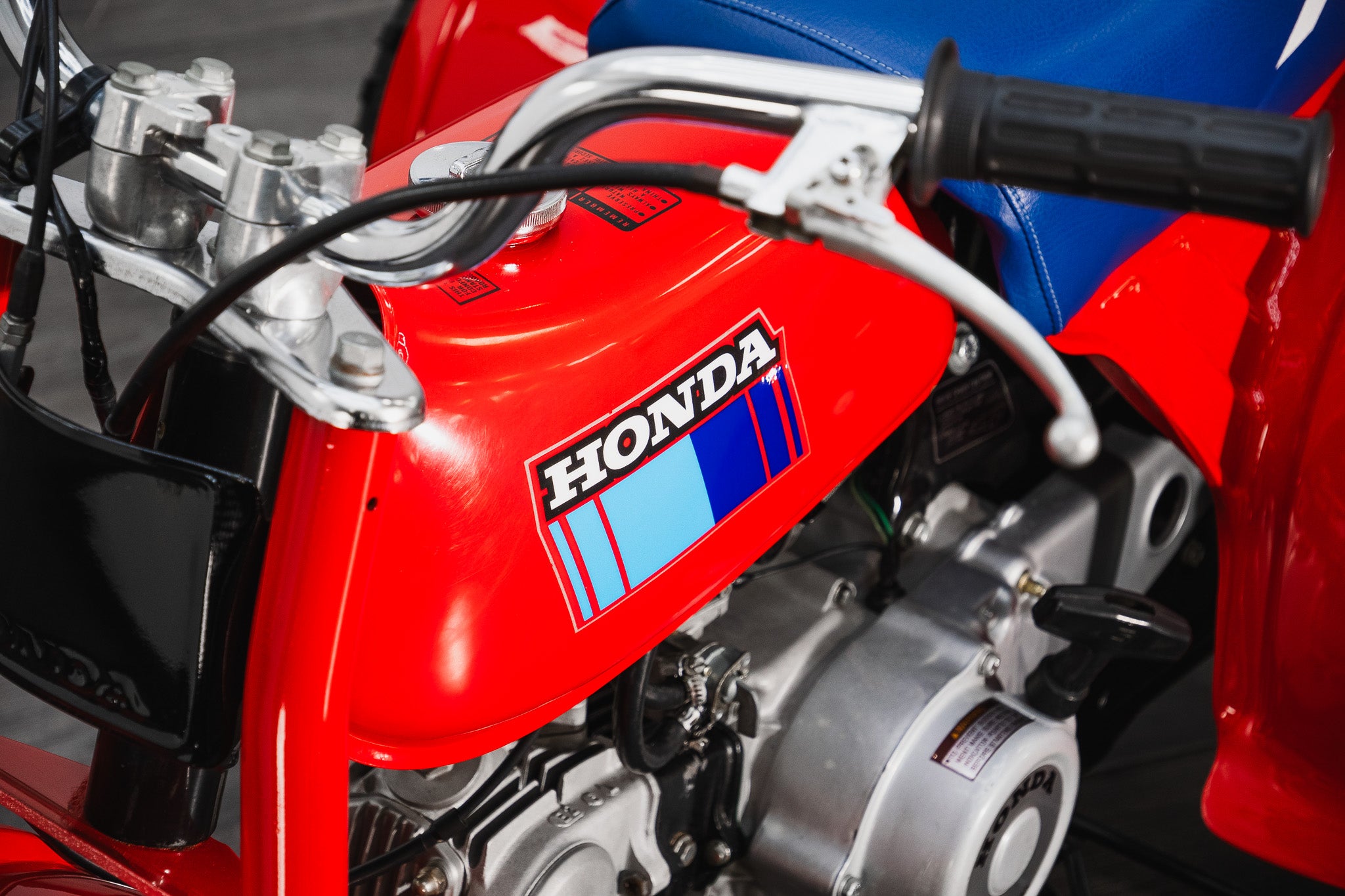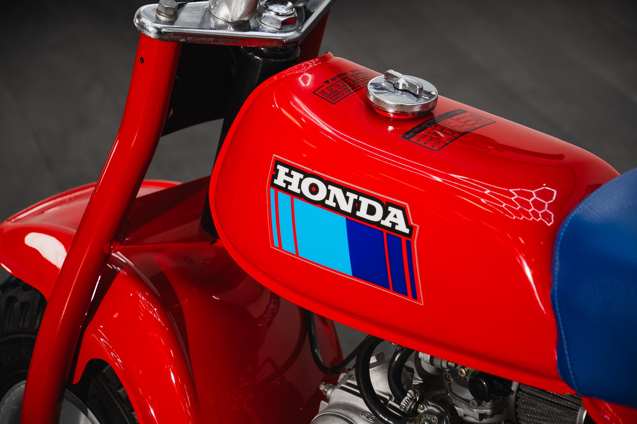 Even the informational decals (fuel/oil mixture, model name, etc.) on the fuel tank and rear fairing remain intact and legible consistent with a cherished survivor example. The deeply hued blue vinyl classic Honda-style seat is legendary on this model completely original, clean and firm, with the Honda logo and 70 side numbers still sharp, showing no rips or tears