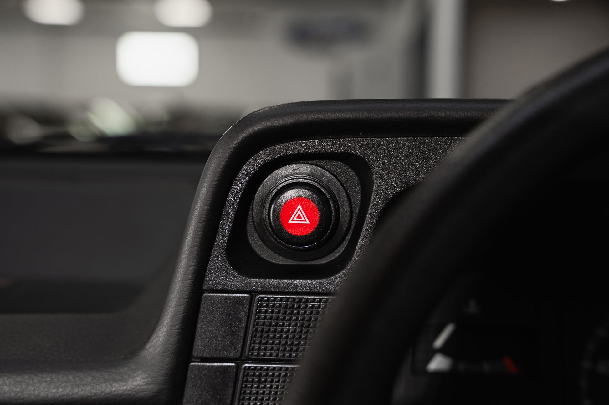 Ahead of the driver, the instrument binnacle is clean and uncluttered, housing a temperature gauge to the left, a centrally positioned speedometer displaying just 12,192 miles from new, and a fuel gauge to the right. All warning lights function correctly and extinguish as intended. The original two-spoke steering wheel remains in excellent condition, free from wear, while the rotary headlight switch and push-button rear fog light integrate seamlessly into the dashboard layout.