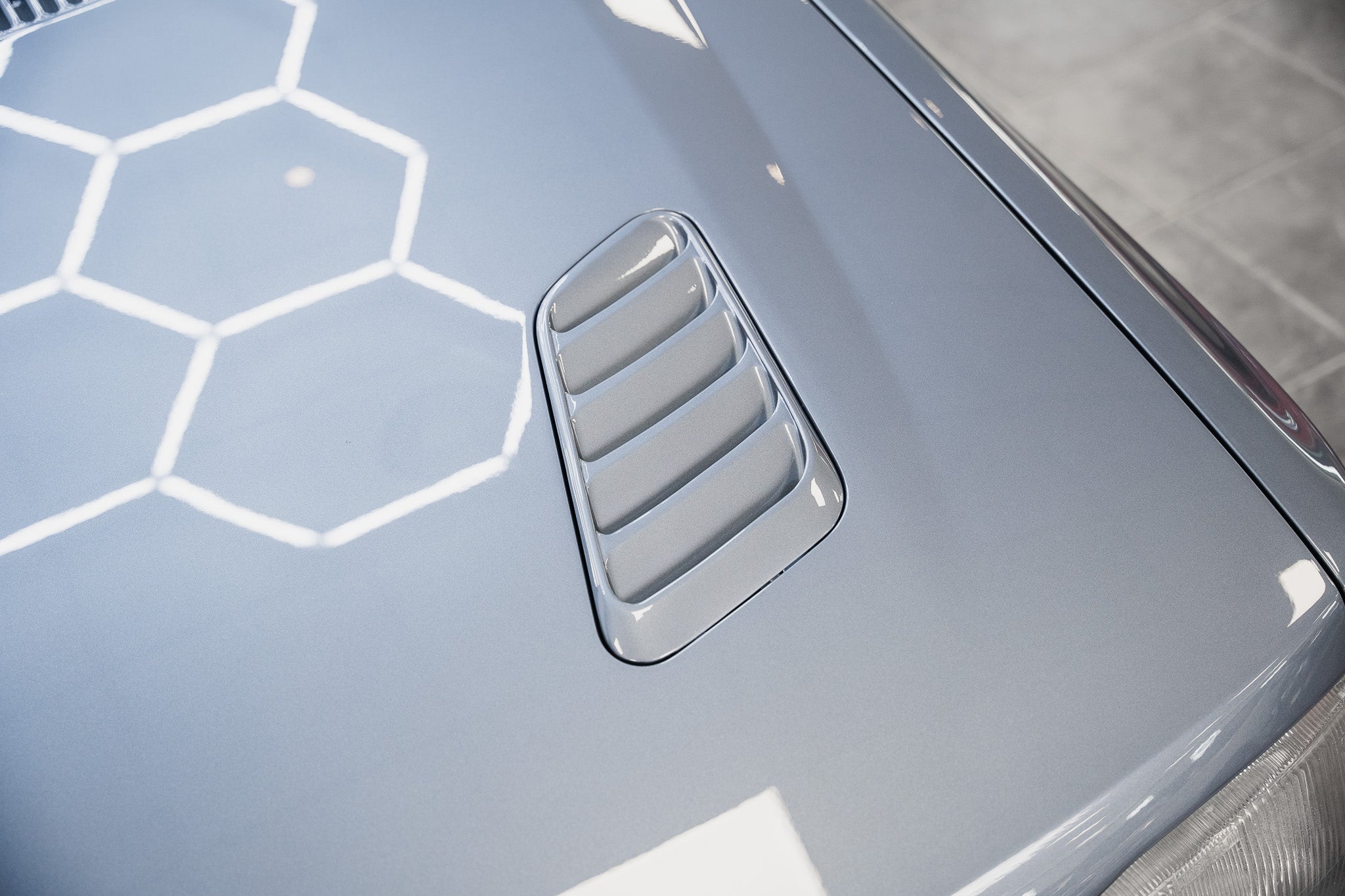 At the front, the factory headlamps and auxiliary driving lamps remain in place, their lenses clear and free from cracks, chips, or clouding. The grille, bumpers, and exterior trim pieces retain a rich, even finish, showing none of the fading or deterioration often associated with cars of this era. The contrast between the dark trim elements and the Mercury Grey paintwork further enhances the car’s authentic period presence.