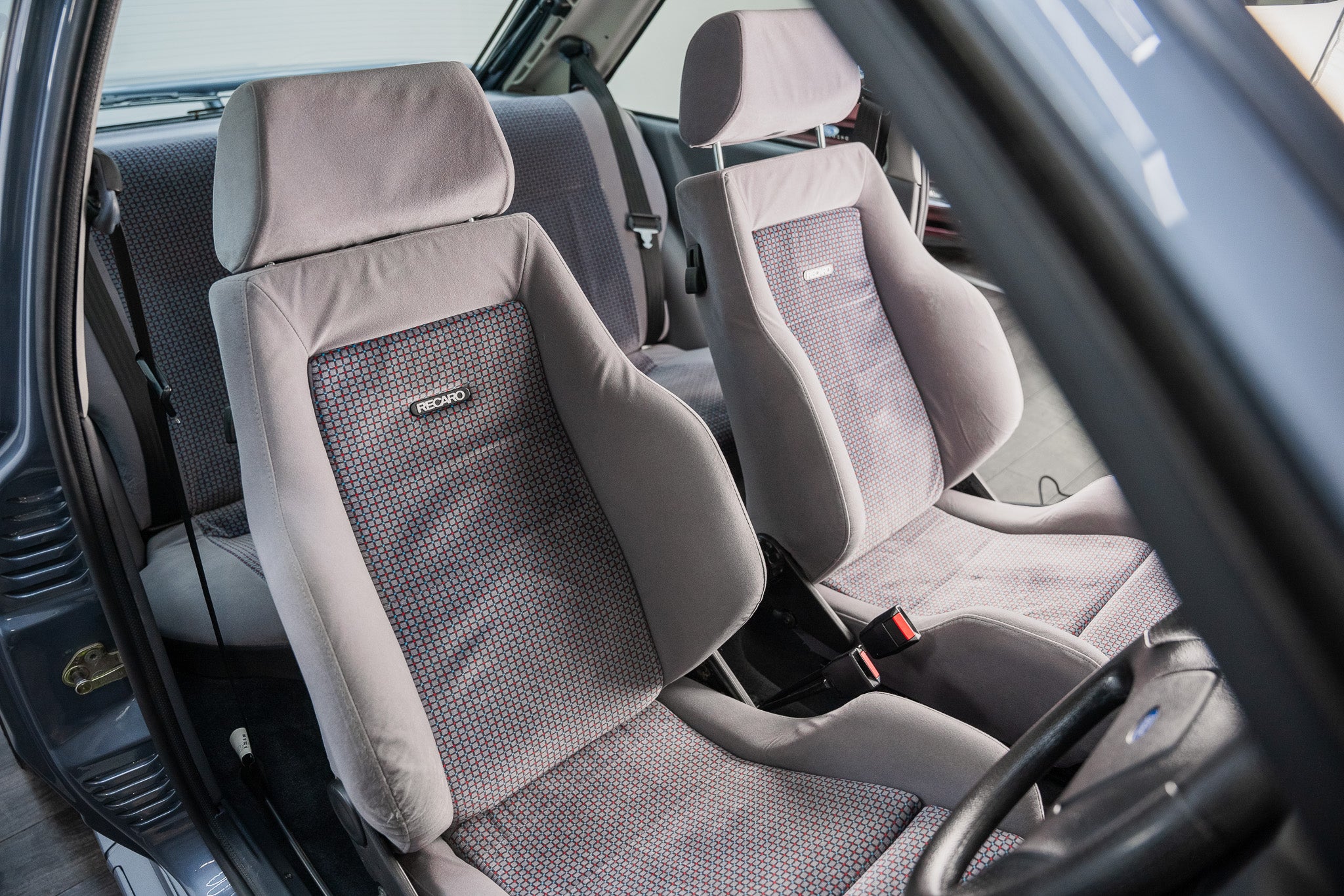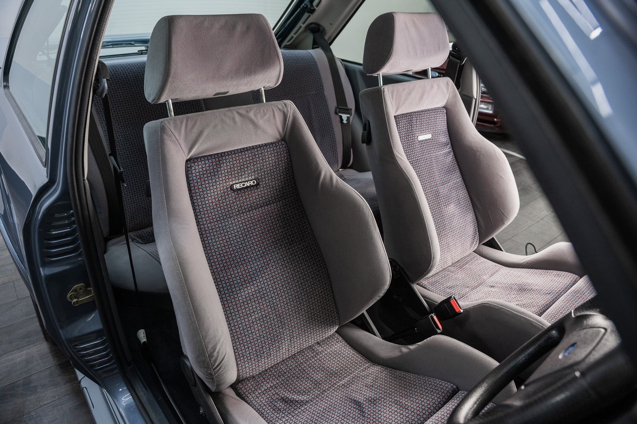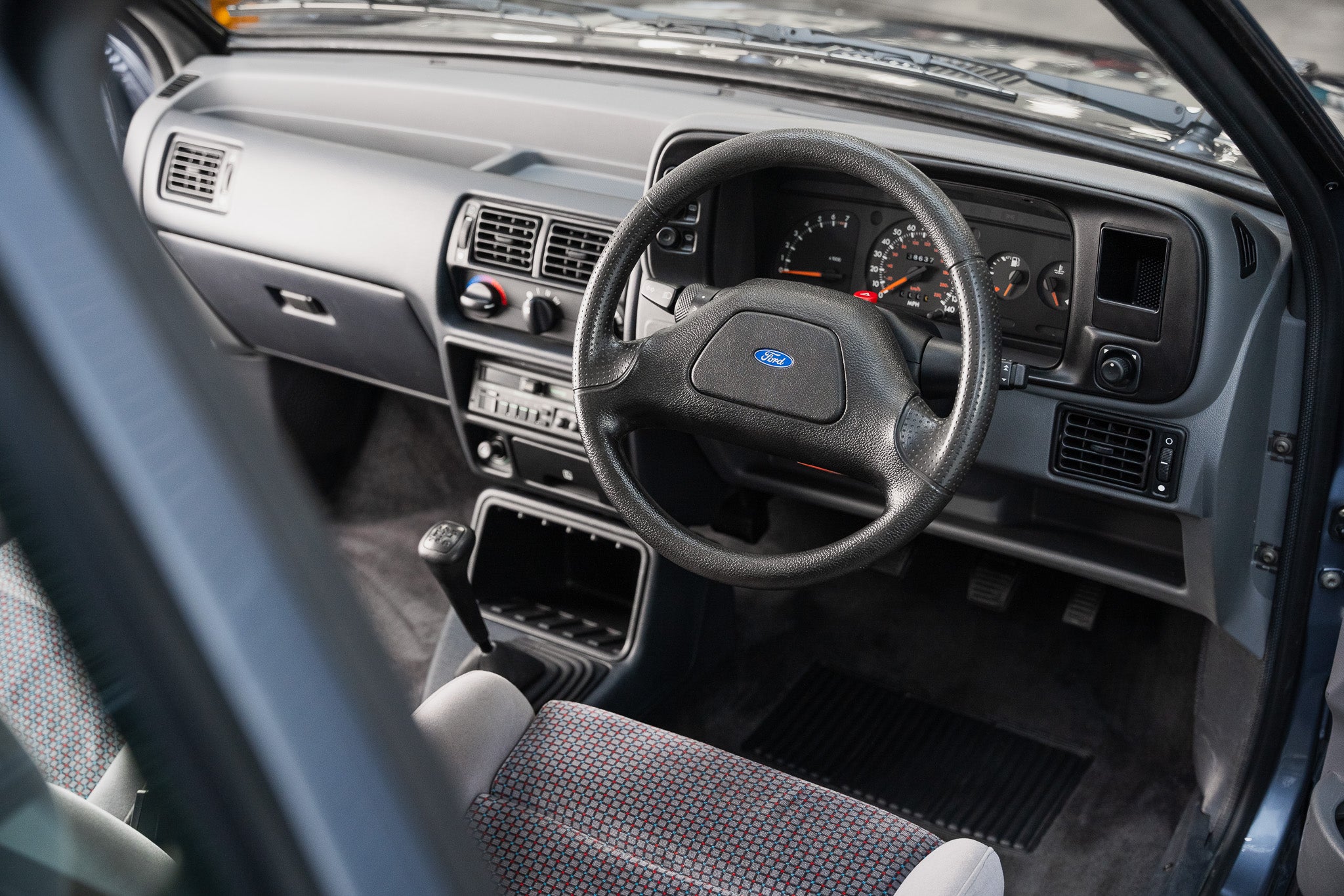 The factory Recaro sports seats, trimmed in Ford’s distinctive period-correct cloth, remain in outstanding condition. Their deeply sculpted bolsters continue to provide excellent lateral support, with the seat structure retaining its firmness and original shape a clear reflection of the car’s careful use. The upholstery is clean and vibrant, free from fading, excessive wear, or distortion, with stitching and fabric weave remaining sharp and intact.