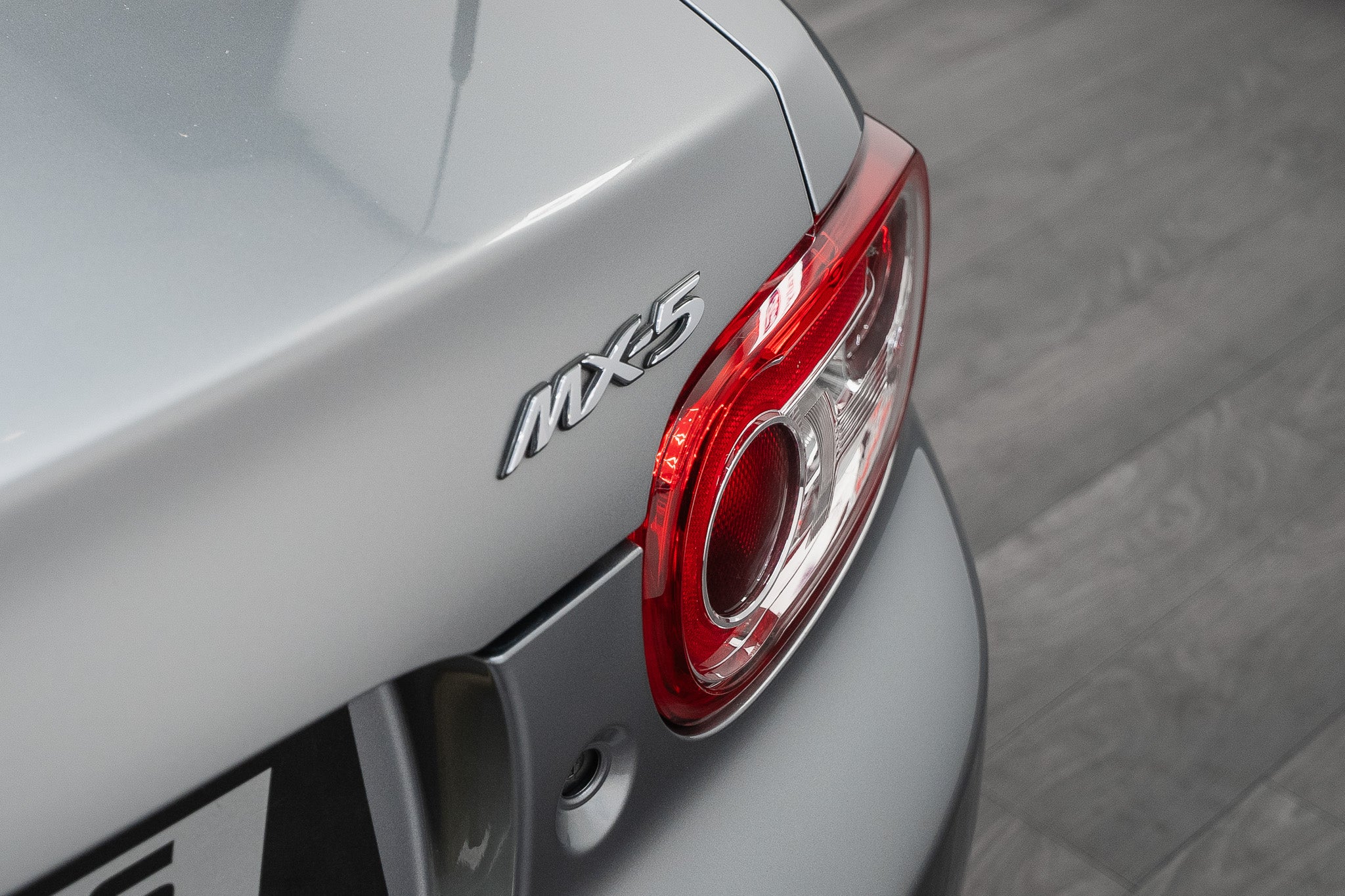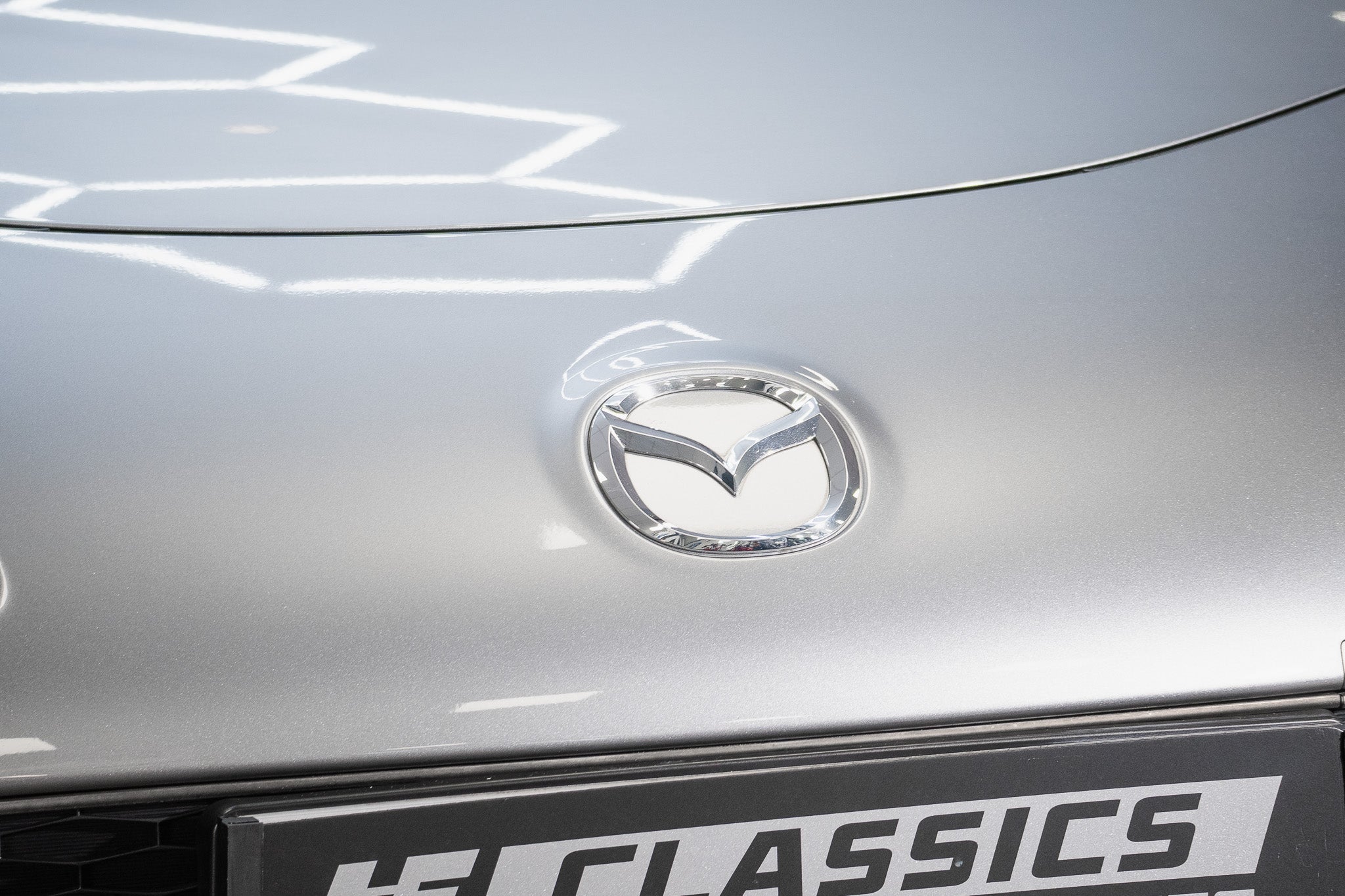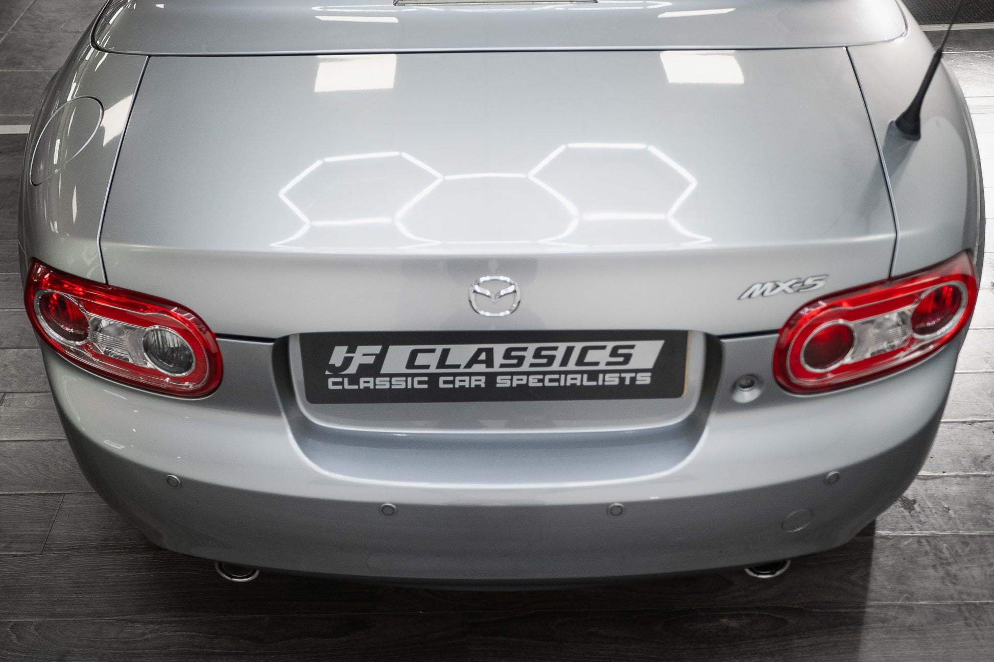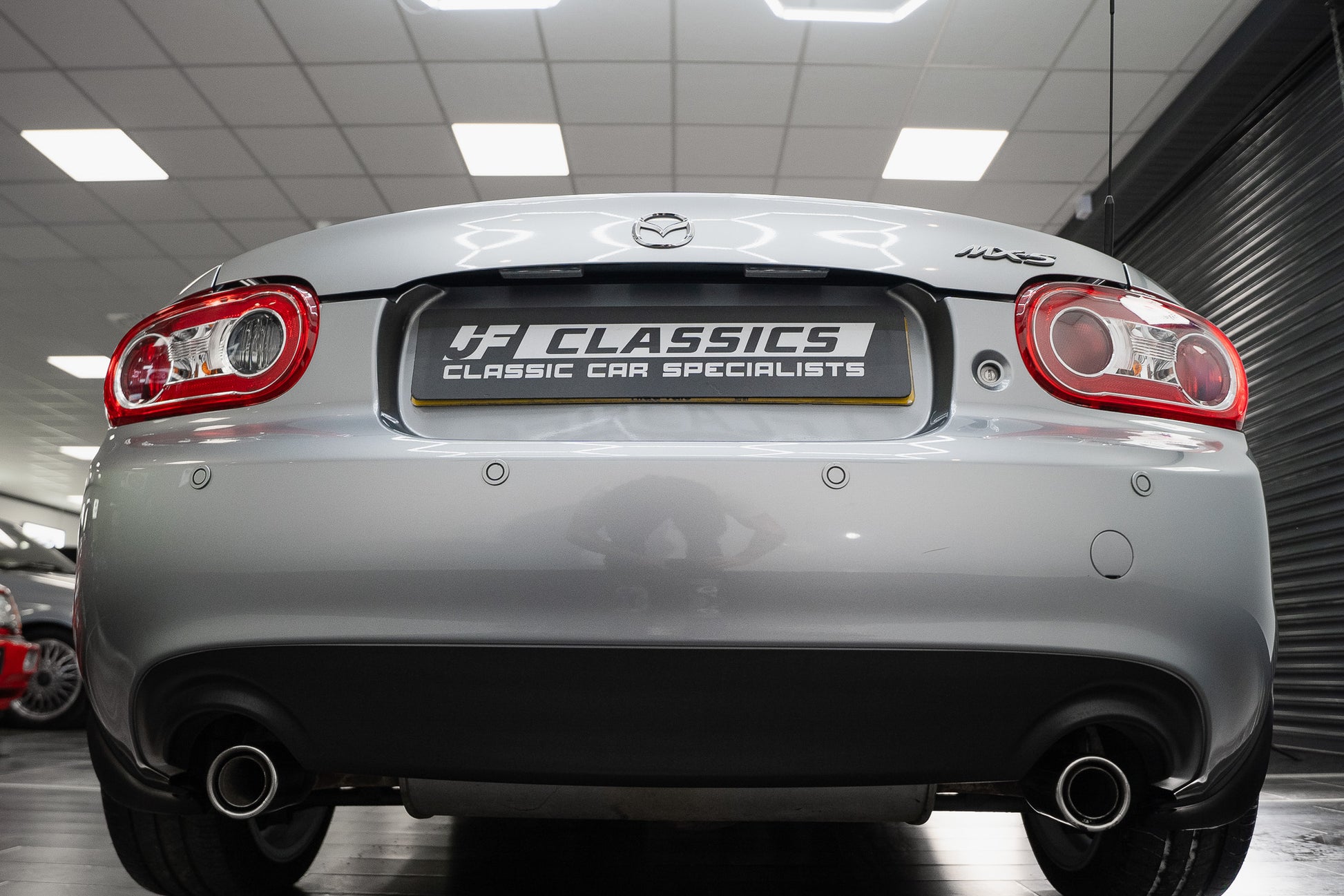 To the rear, the car is equipped with neatly integrated parking sensors within the bumper, enhancing everyday usability. Silver Mazda badging remains bright and correctly positioned, maintaining the car’s factory appearance. Twin polished exhaust outlets exit symmetrically from both the left and right sides of the rear, adding a subtle sporting touch, while a boot-mounted high-level brake light provides both safety and visual balance.