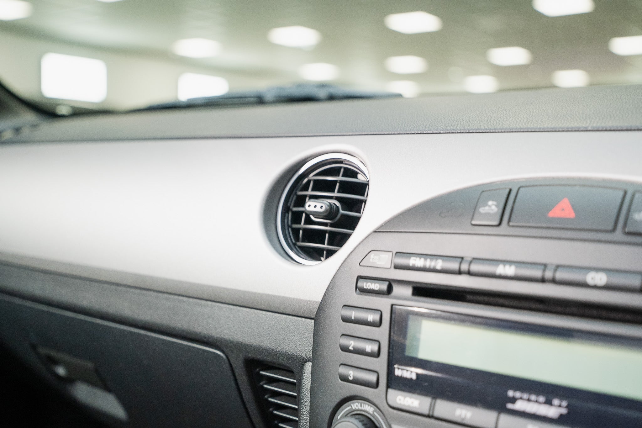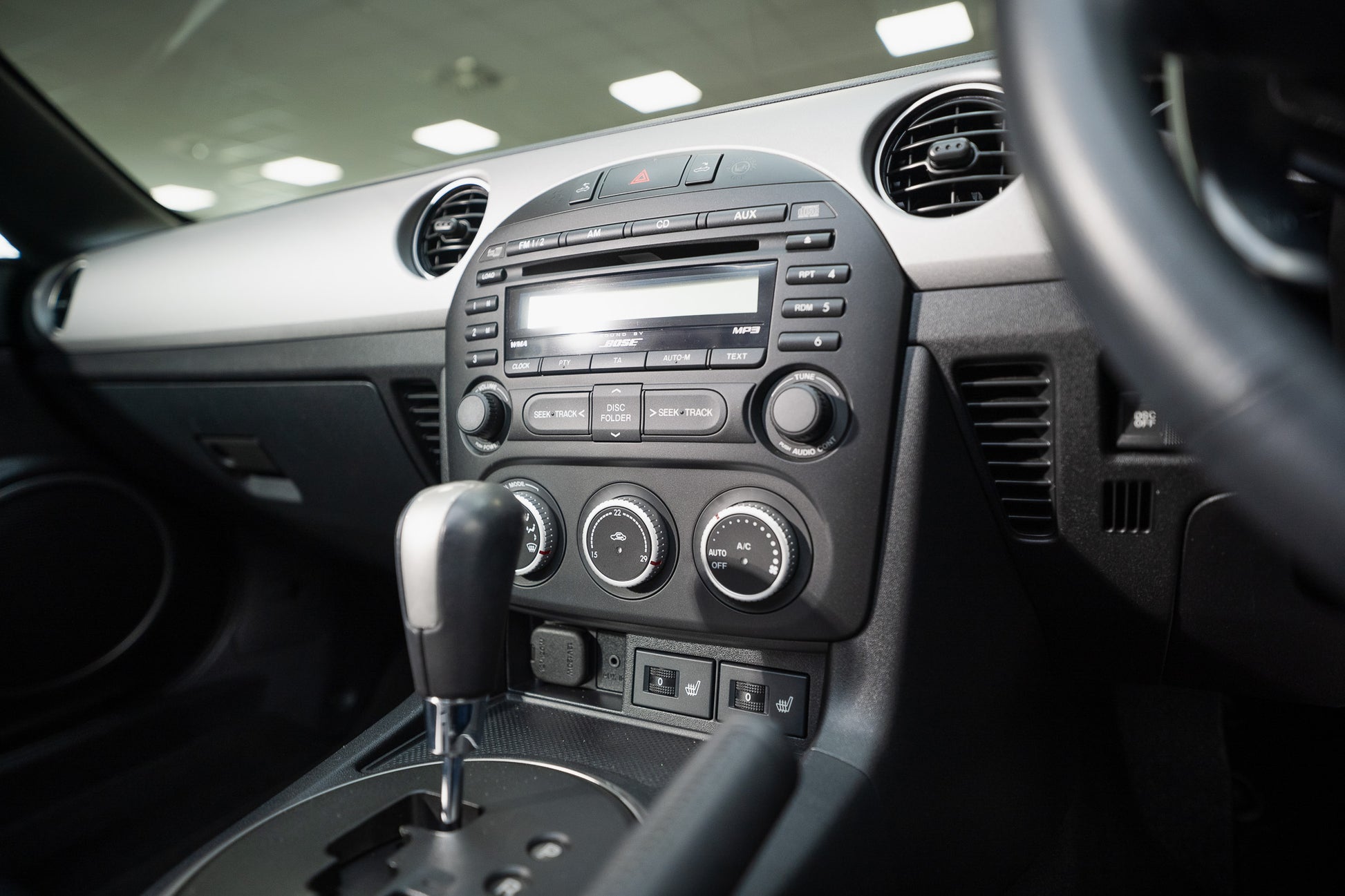 Centrally mounted are the controls for the electrically operated hardtop roof, positioned either side of the hazard warning switch for ease of use. The factory-fitted Bose premium sound system is a notable feature, incorporating a six-disc CD changer and delivering excellent sound quality. Beneath this, rotary controls manage the interior heating and ventilation, including an air conditioning function, all operating smoothly and as intended.