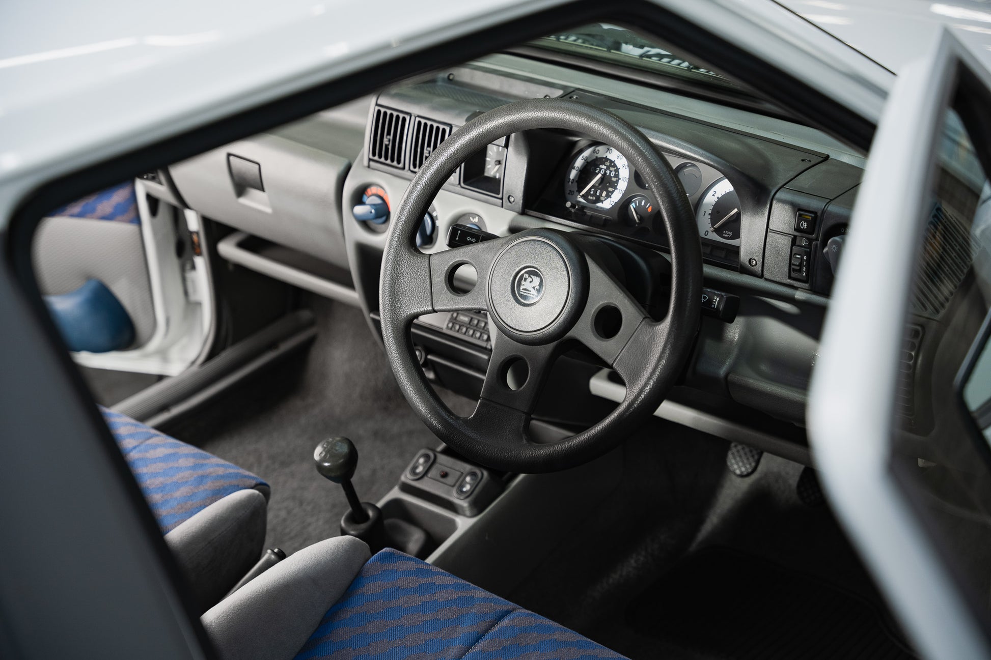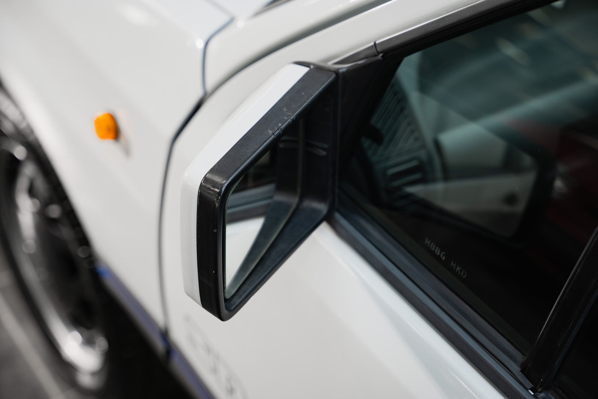 Complementing the Glacier White are the factory-correct lower grey accent panels which remain well defined and contrast effectively with the upper body while the distinctive blue pinstripe runs cleanly and uninterrupted around the exterior of the car adding an authentic finishing touch true to the model’s original specification.