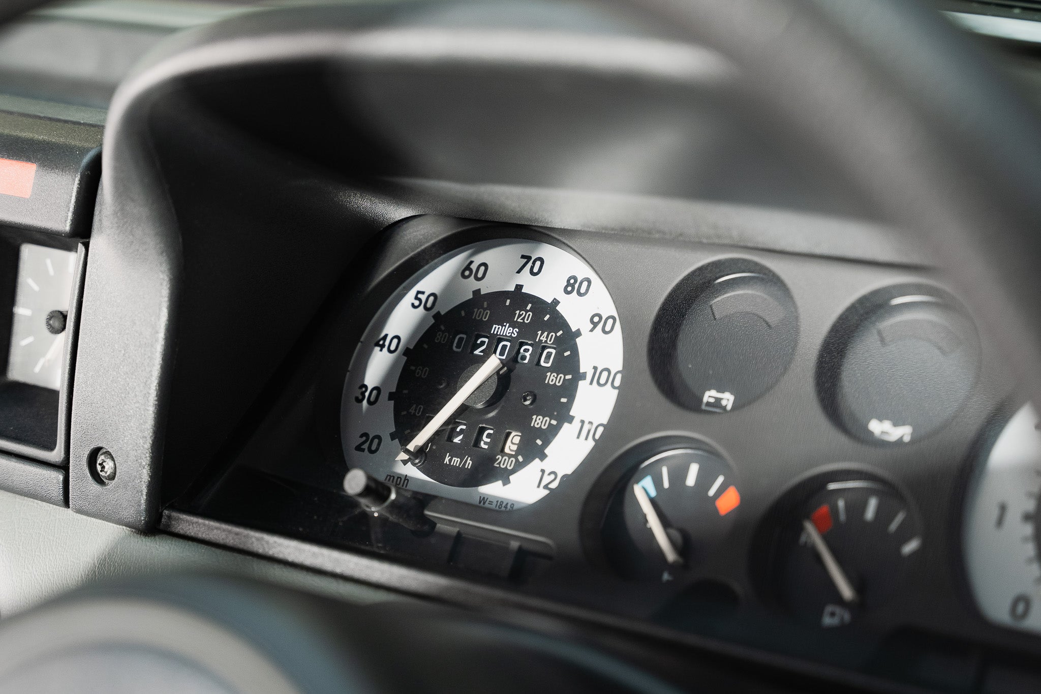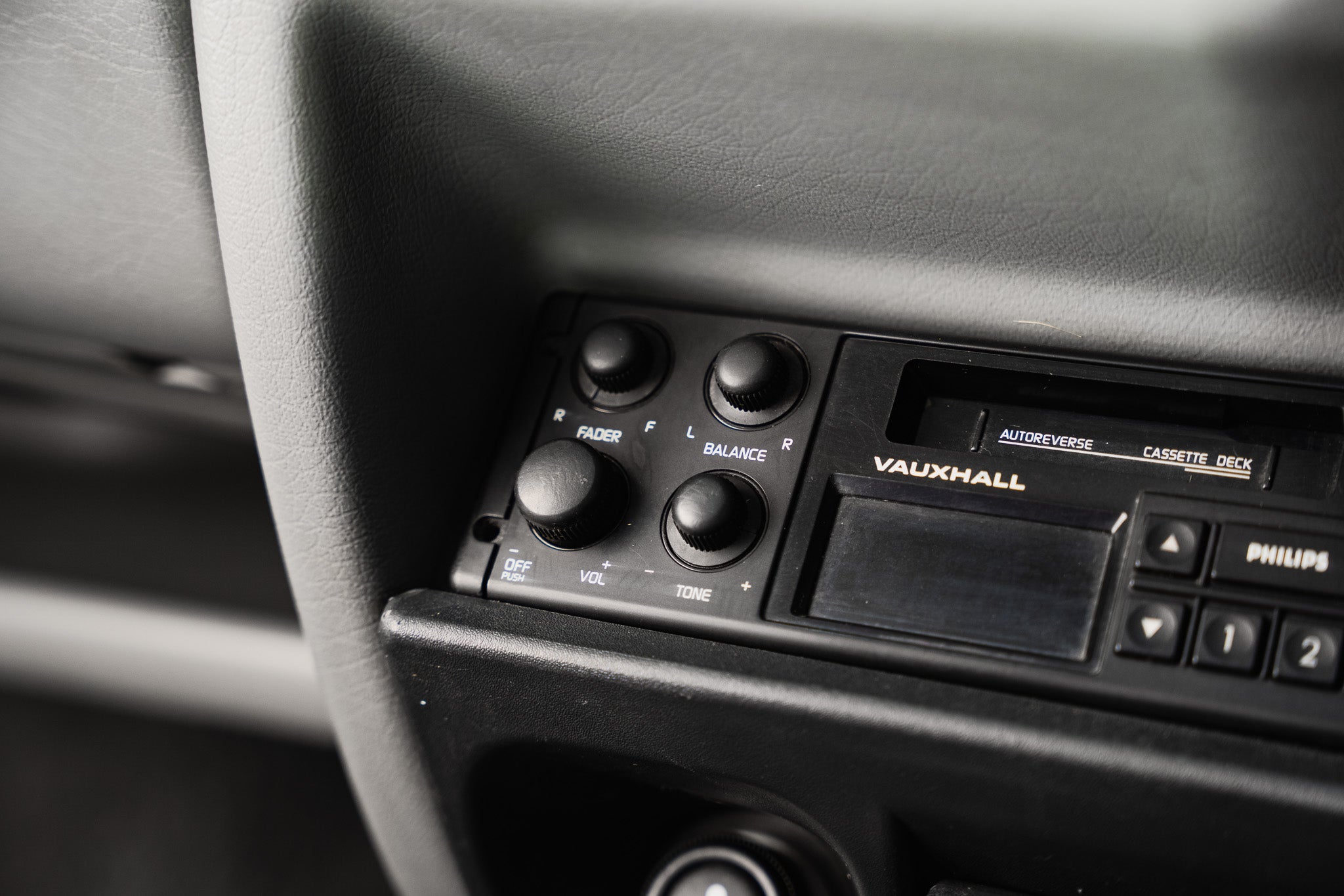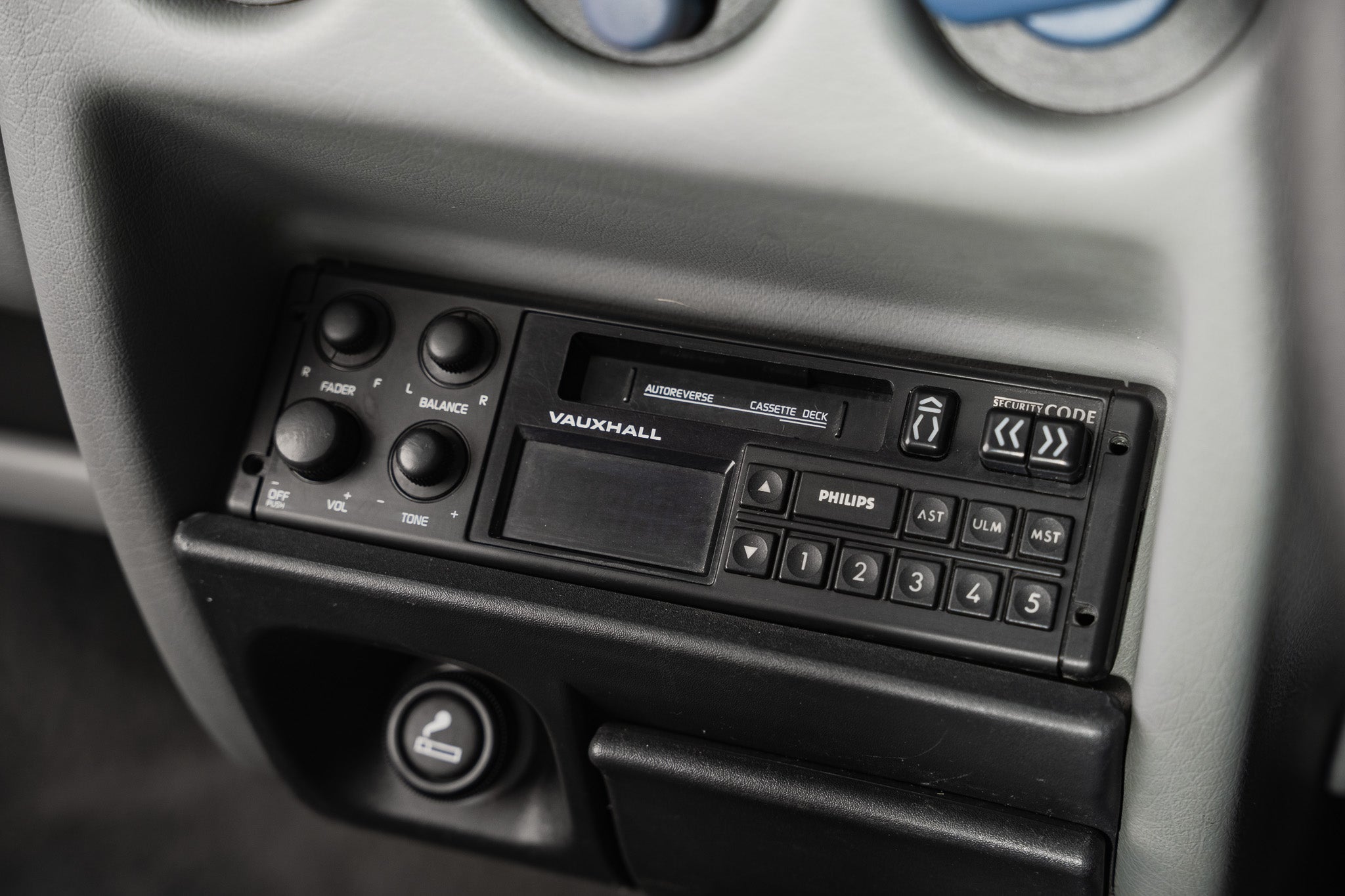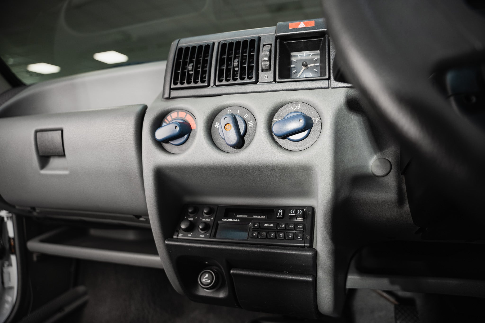 Center console specification is equally impressive, housing the original Vauxhall Philips autoreverse radio cassette unit, which remains in as-new condition and underscores the car’s originality. This is complemented by a neatly integrated cigarette lighter and ashtray assembly, both presenting in excellent order. Ahead of the driver, the instrument binnacle continues the sporty white and black colour theme, with the speedometer positioned to the left and displaying just 2,080 miles, reinforcing the car’s exceptional provenance