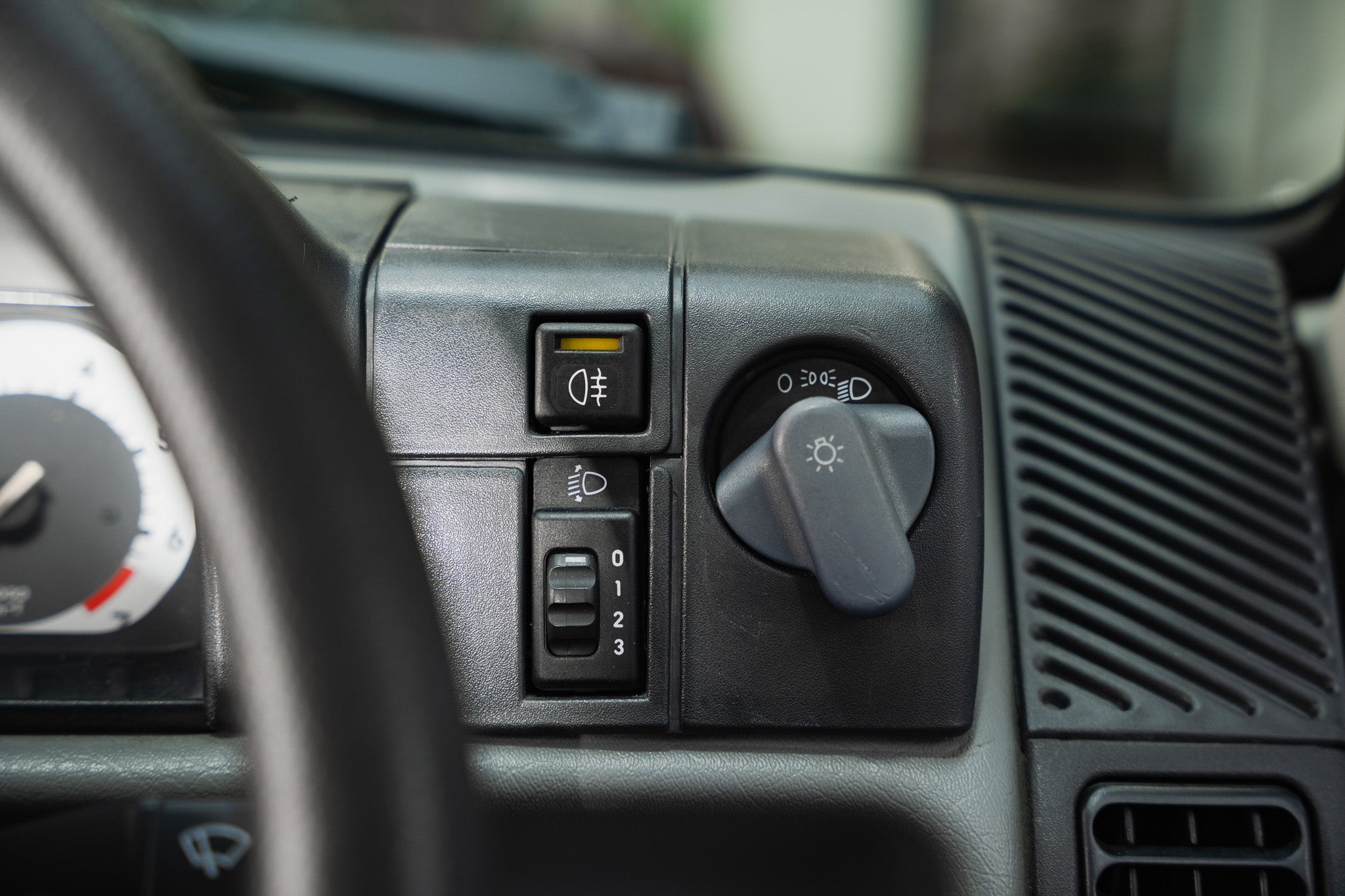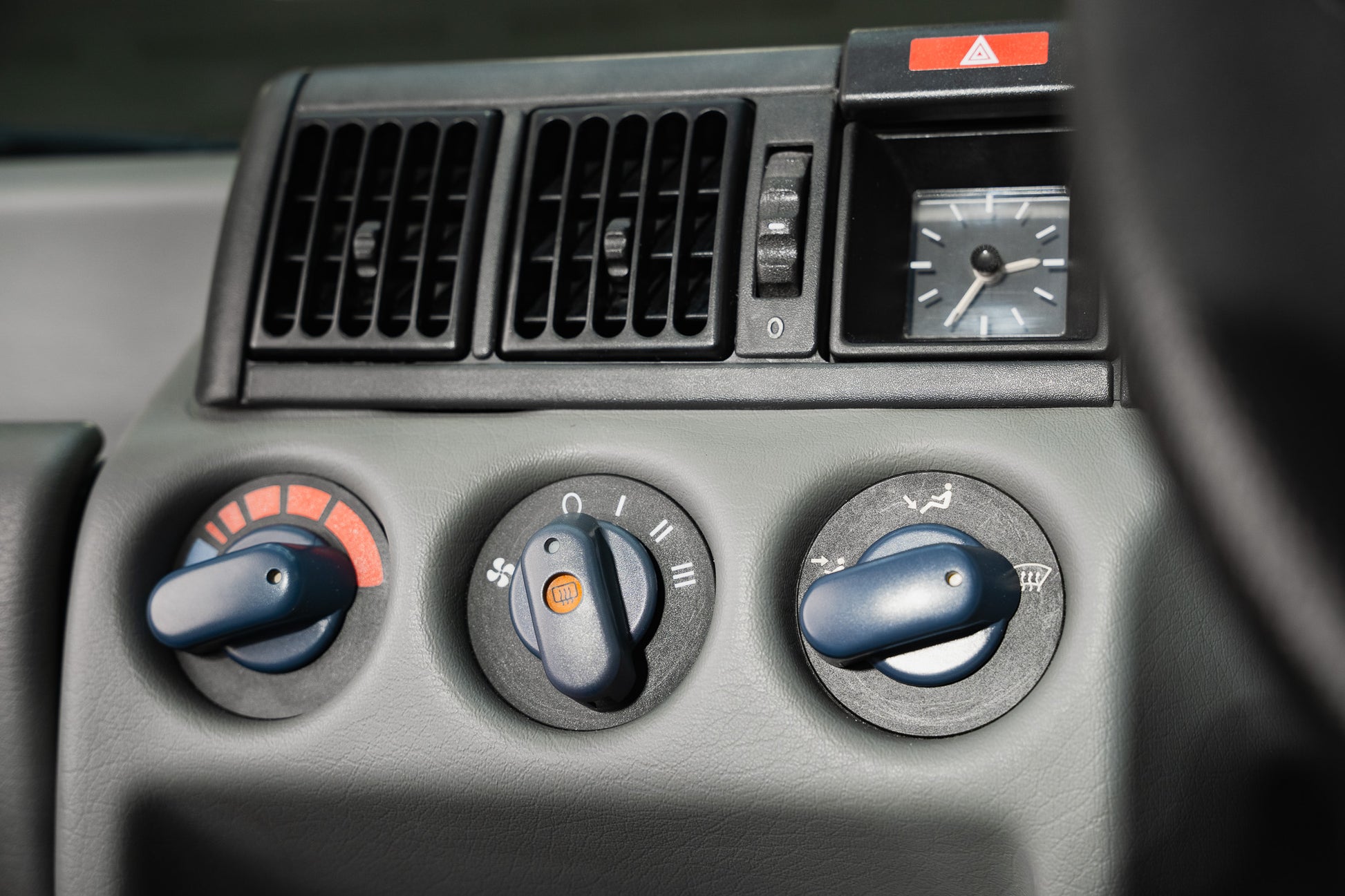 To the passenger side, a neatly integrated glovebox is positioned beneath a directional heater vent, with the central dash area featuring twin adjustable air ducts accompanied by the hazard warning switch positioned conveniently alongside. Just below, the analogue time clock sits neatly in view, with three rotary control dials located further down, governing interior temperature, fan speed, and airflow direction. The fan speed control incorporates the correct pull-out function to activate the heated rear screen, a thoughtful and practical feature of the era.