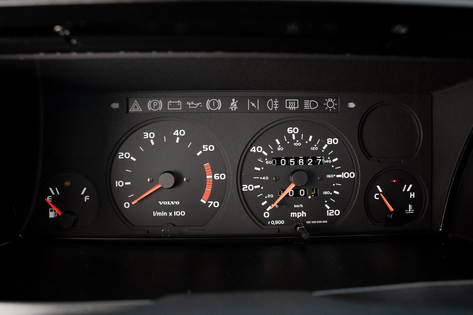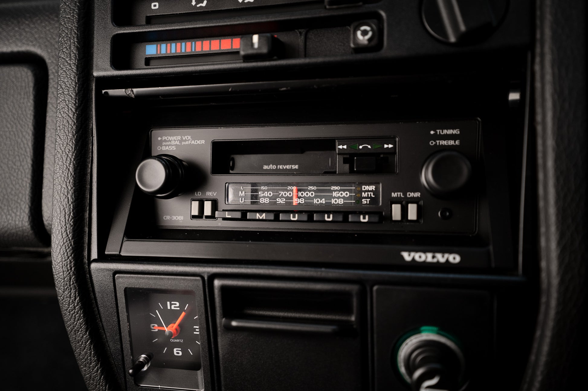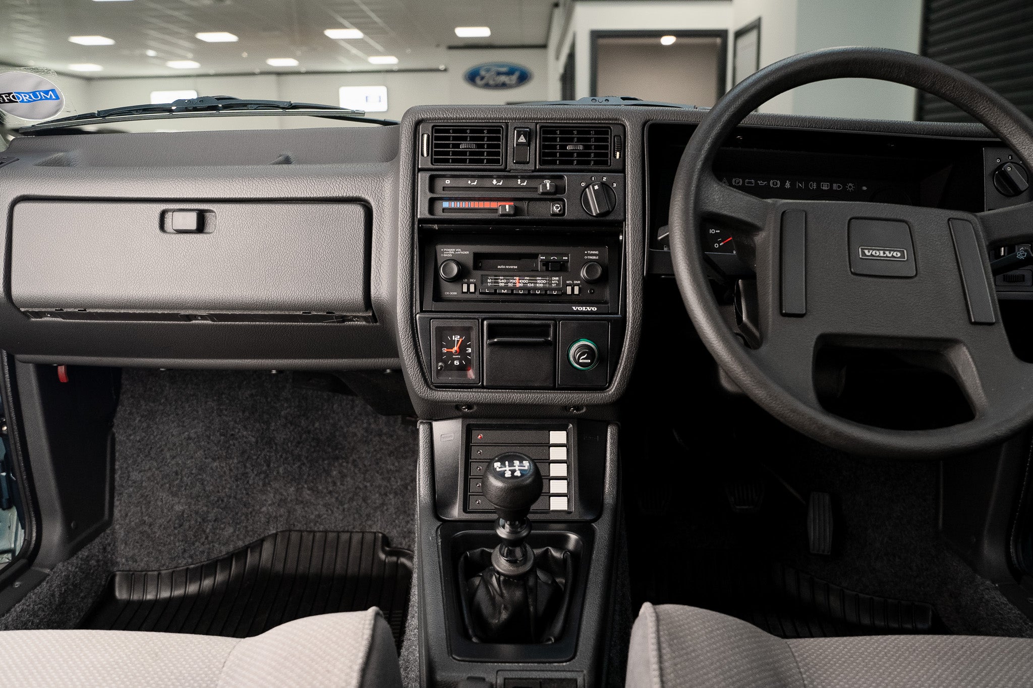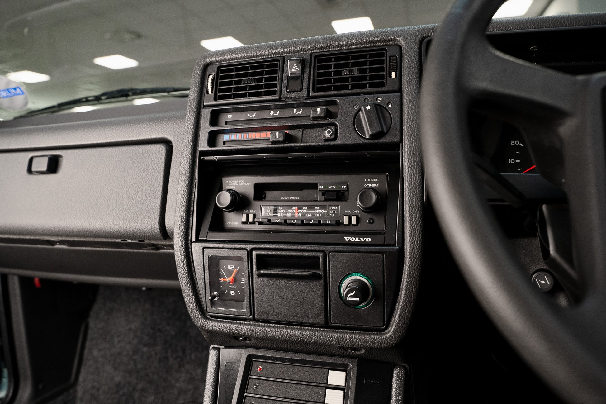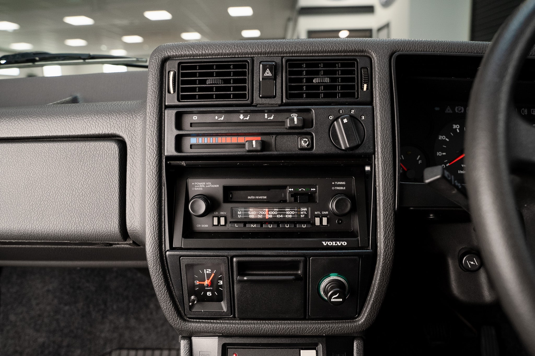 The dashboard is unmarked and retains a deep natural grain, presenting clearly laid-out analogue instrumentation with sharp calibration and fully functioning warning indicators. All switchgear operates with the reassuring precision of low wear, including original heating controls, ventilation sliders and column stalks. A factory Volvo CR-3081 FM radio cassette head unit remains proudly in place and fully operational a detail increasingly lost to replacement but invaluable for originality.