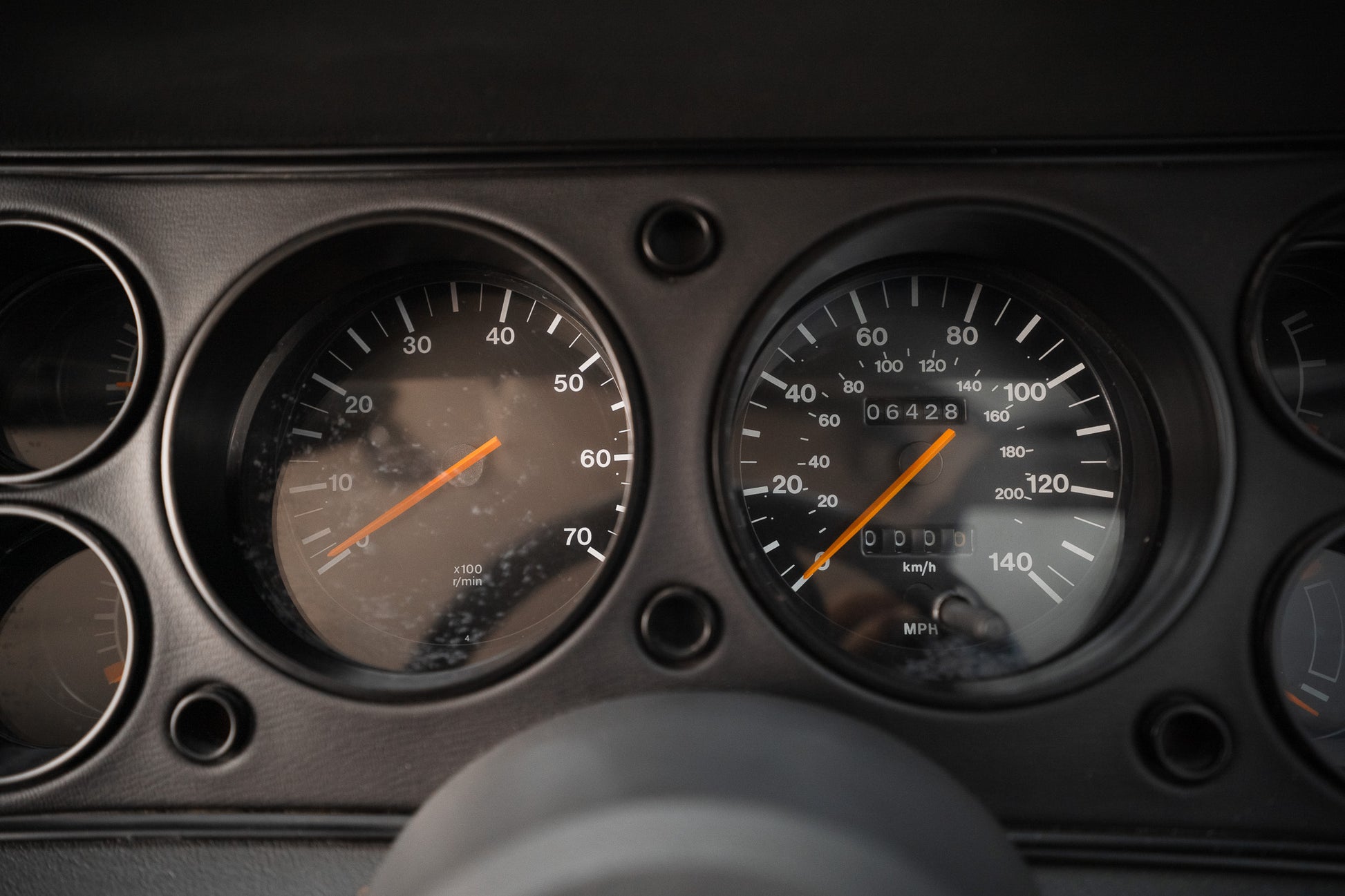 In front of the driver sits the original three-spoke grey leather steering wheel, showing virtually no wear exactly what you’d expect from a car with such incredibly low mileage.