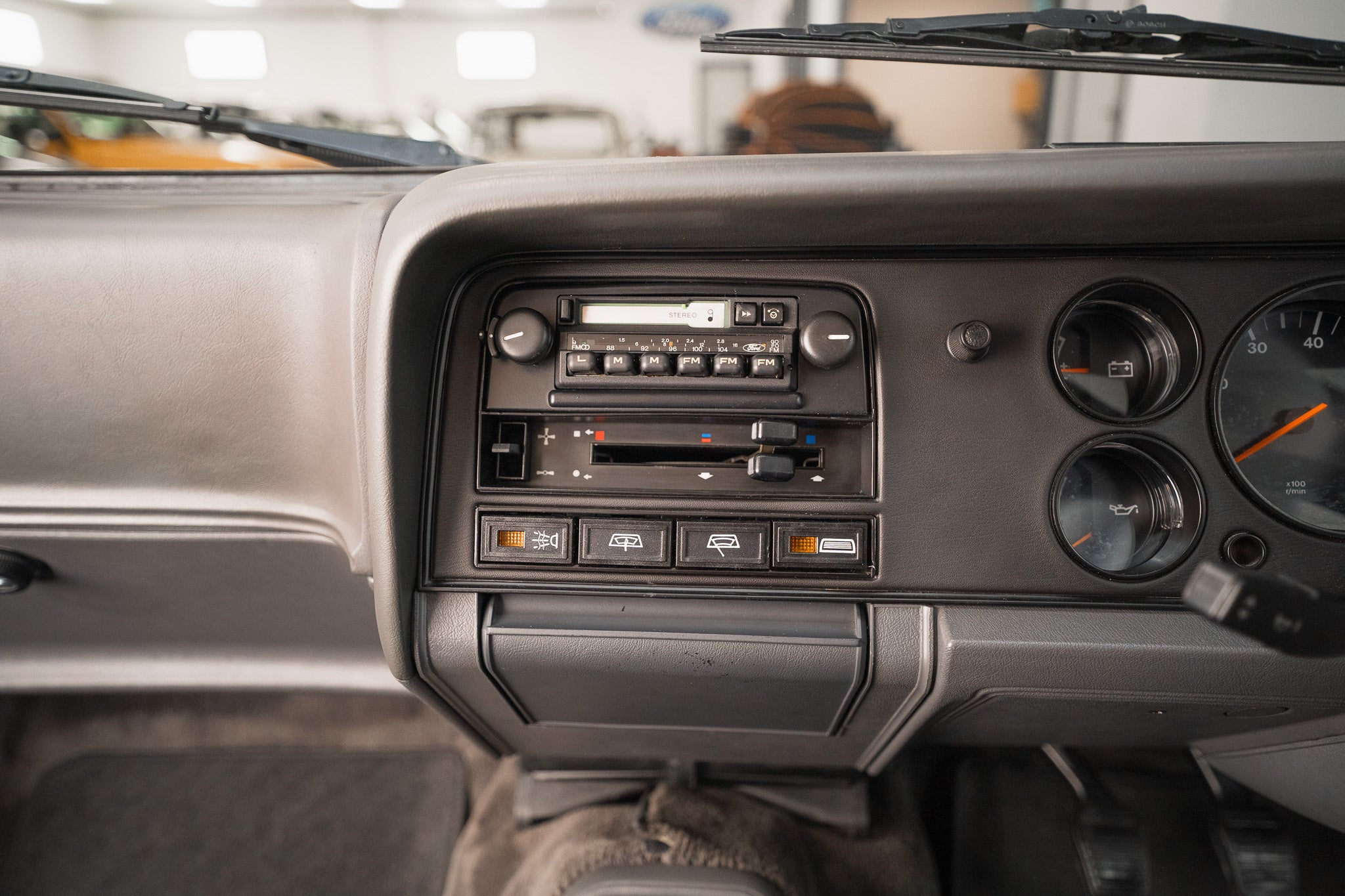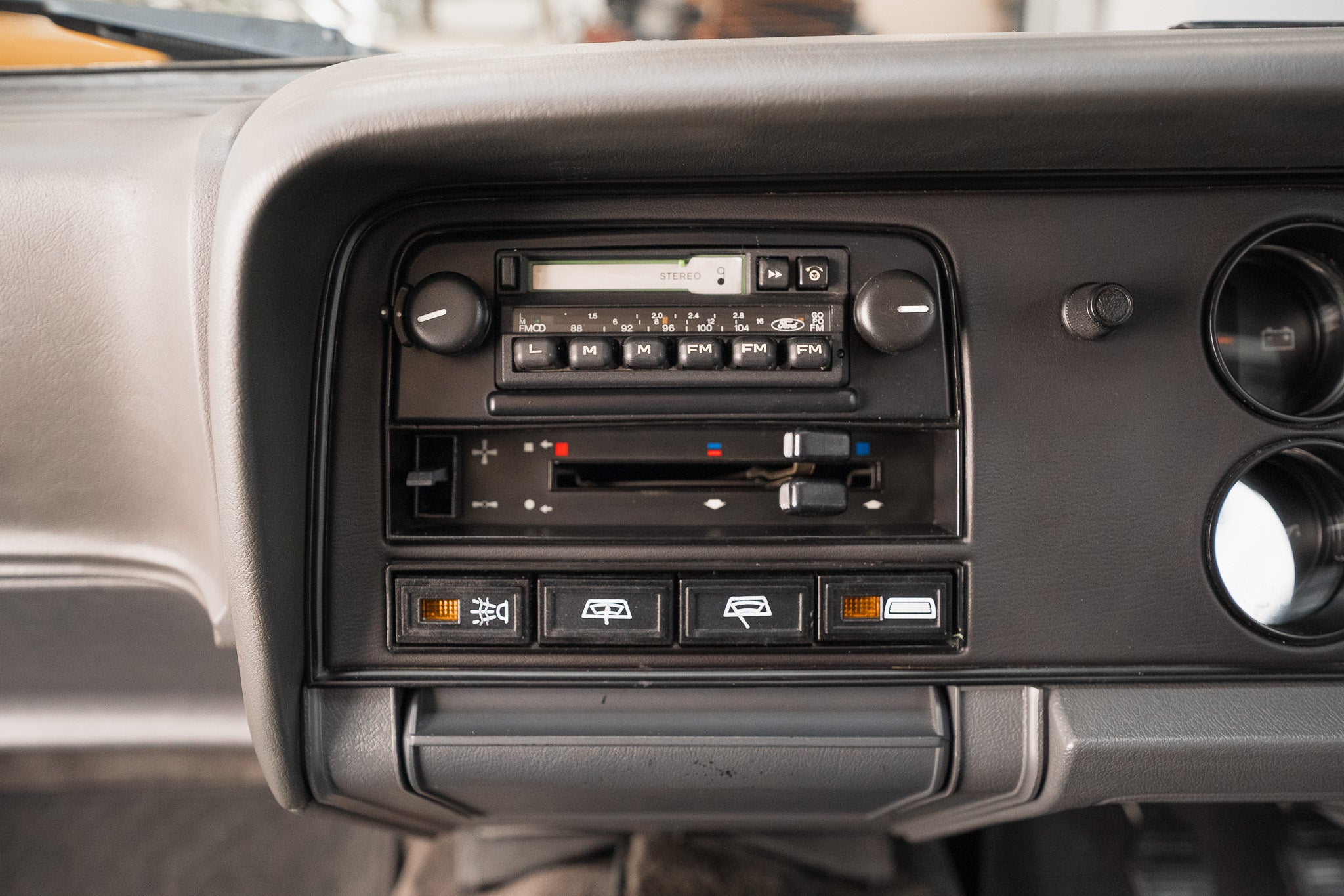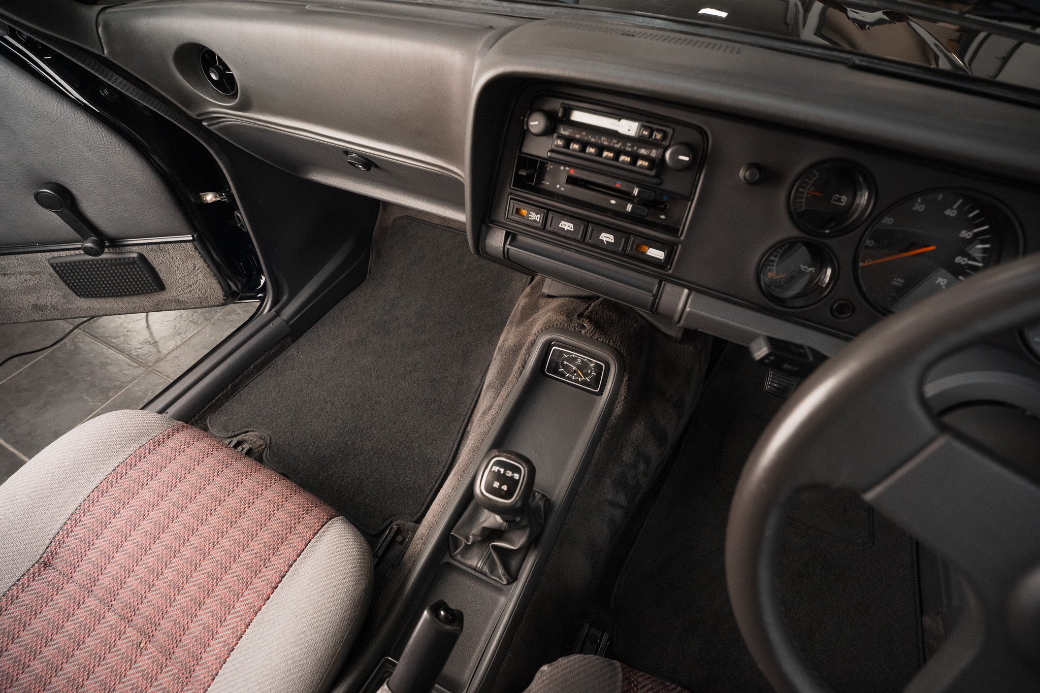 Taking pride of place in the centre of the dashboard is the factory-upgrade Ford push-button MW/LW stereo cassette (RST21P), A ‘Quartz’ analogue clock sits a little beneath, both perfectly operational. The Laser-specific 5-speed grey leather gear knob and colour-coded centre console complete the unmistakable eighties Ford aesthetic.