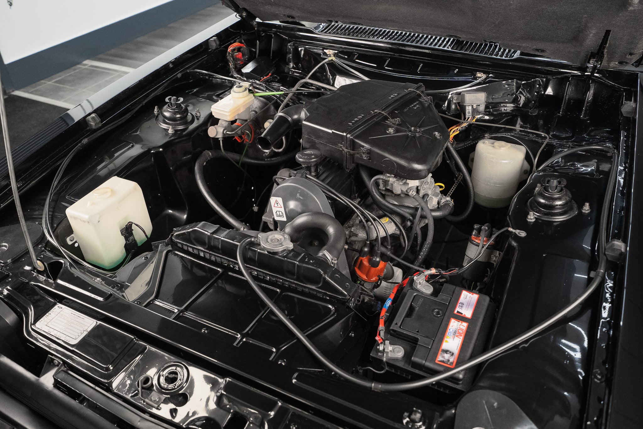 The engine bay presents in remarkably original condition throughout, reflecting careful preservation and minimal mileage. Factory informational and caution stickers remain in place, while original components and finishes are clearly visible, offering an authentic glimpse into Ford’s production quality of the era.