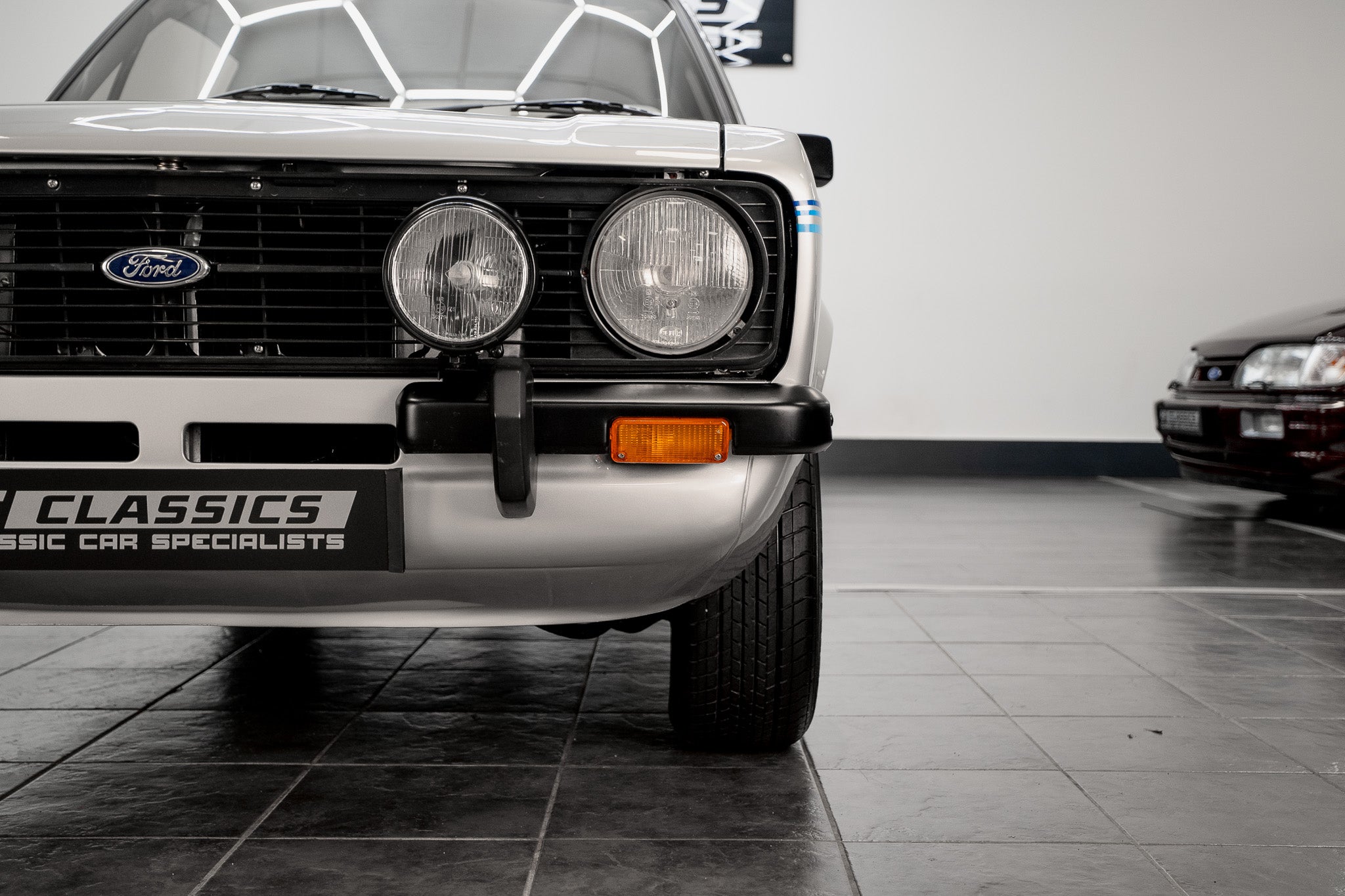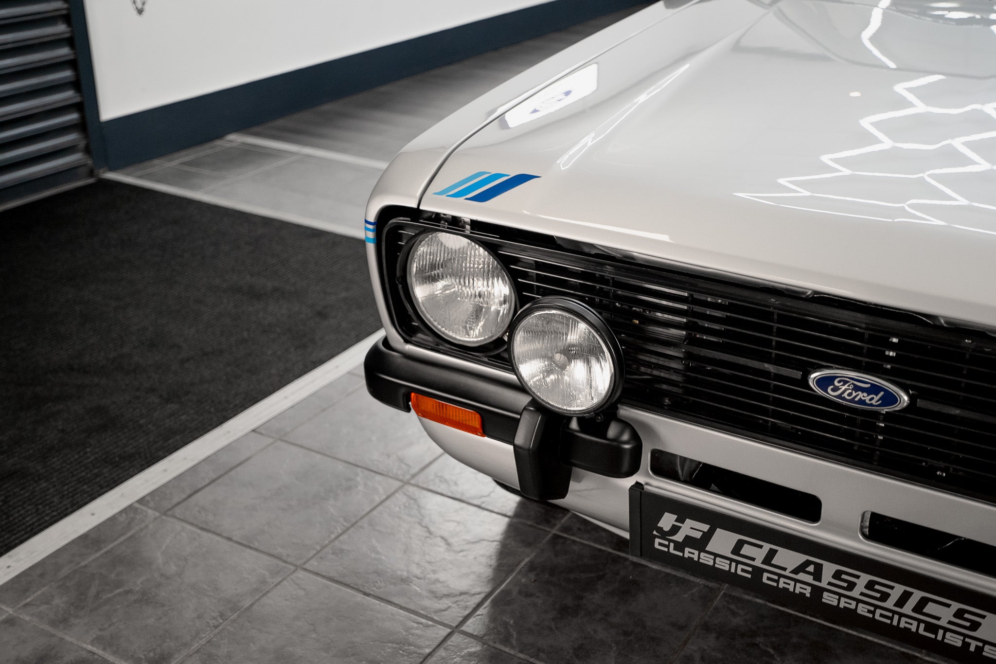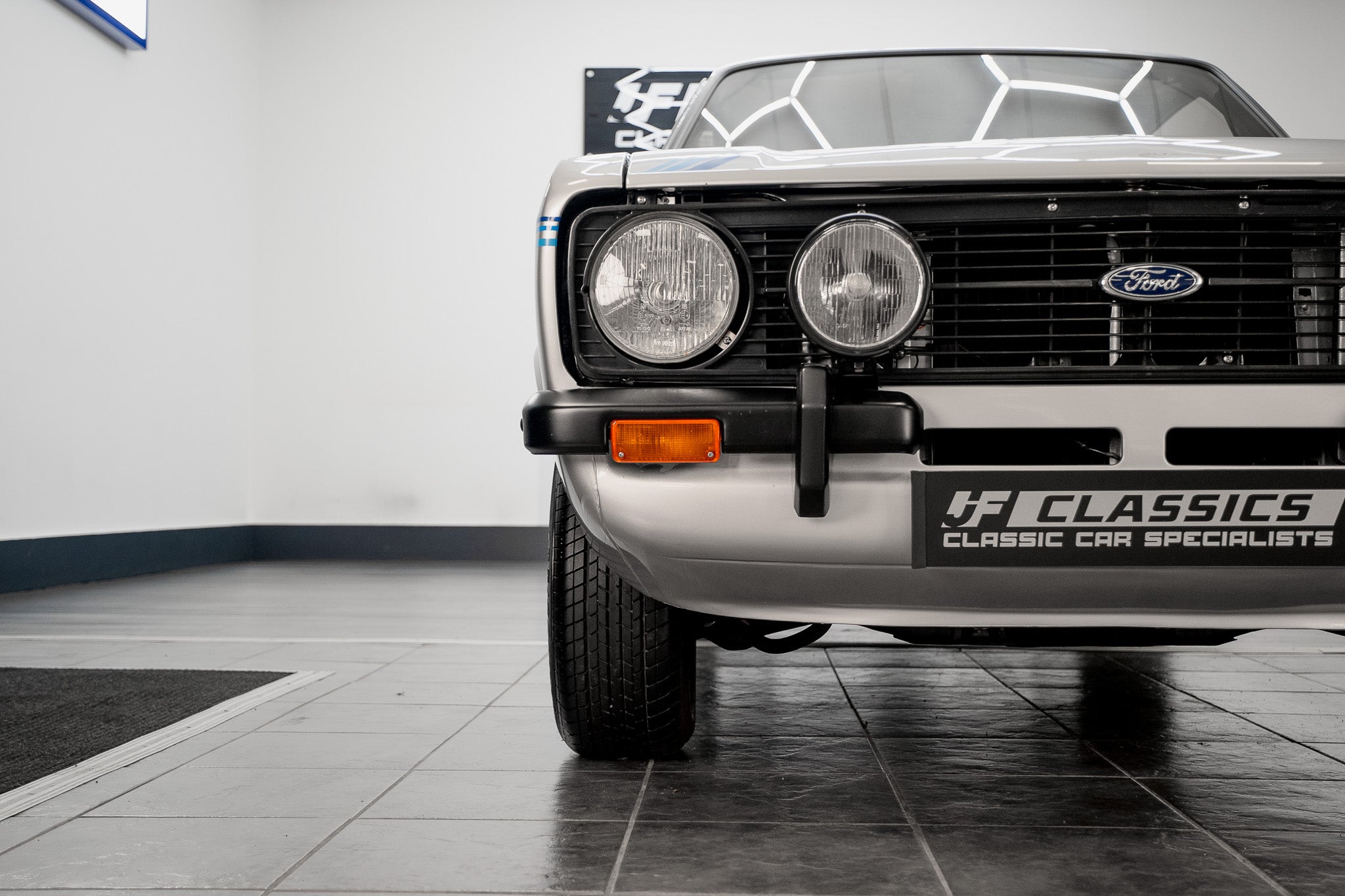 This Mk2 Harrier presents with an exceptionally well-preserved exterior that reads as both authentic and highly desirable. Finished in the optional dealer Strato Silver, the paint displays a uniform gloss shine from nose to tail and the panel gaps are pin-sharp throughout a clear sign of careful ownership and correct preservation. At the front a bold black-slatted grille sits proudly, perfectly centred with the blue-oval Ford badge, and the original Hella headlamps remain crystal clear and entirely free from chips or damage. The front corner bumpers sit true and unmarked, flowing into the body with factory precision.