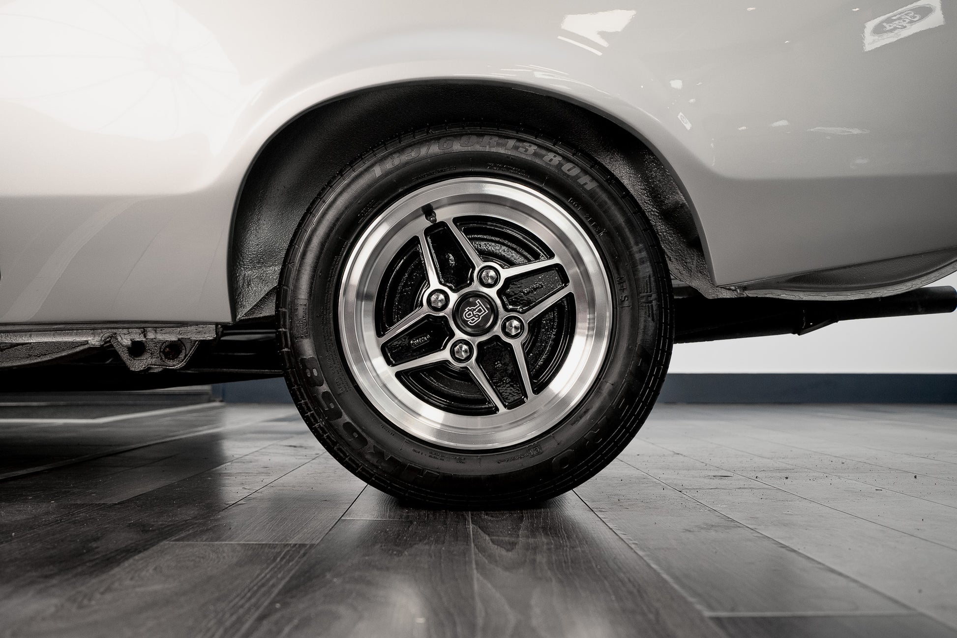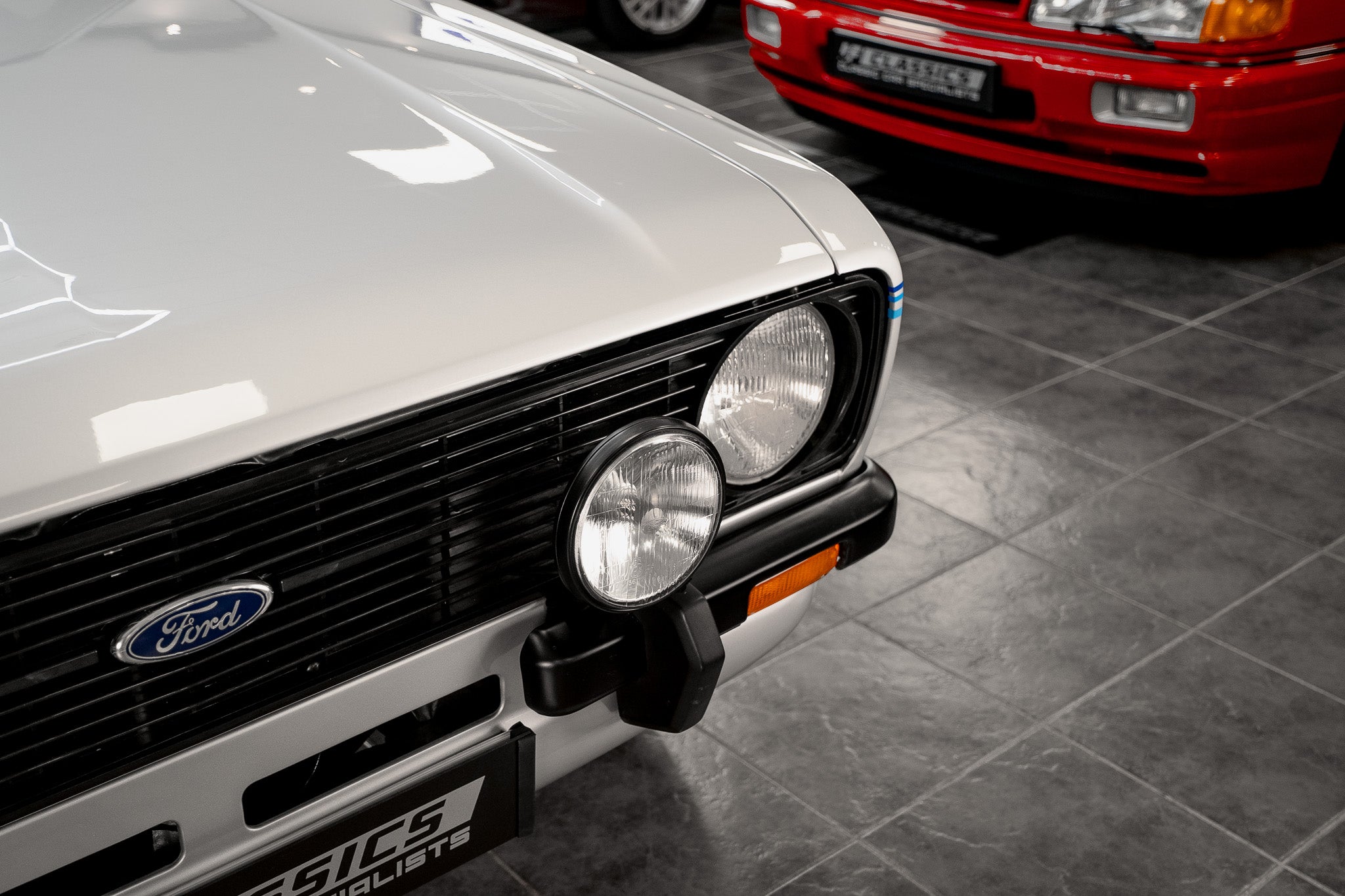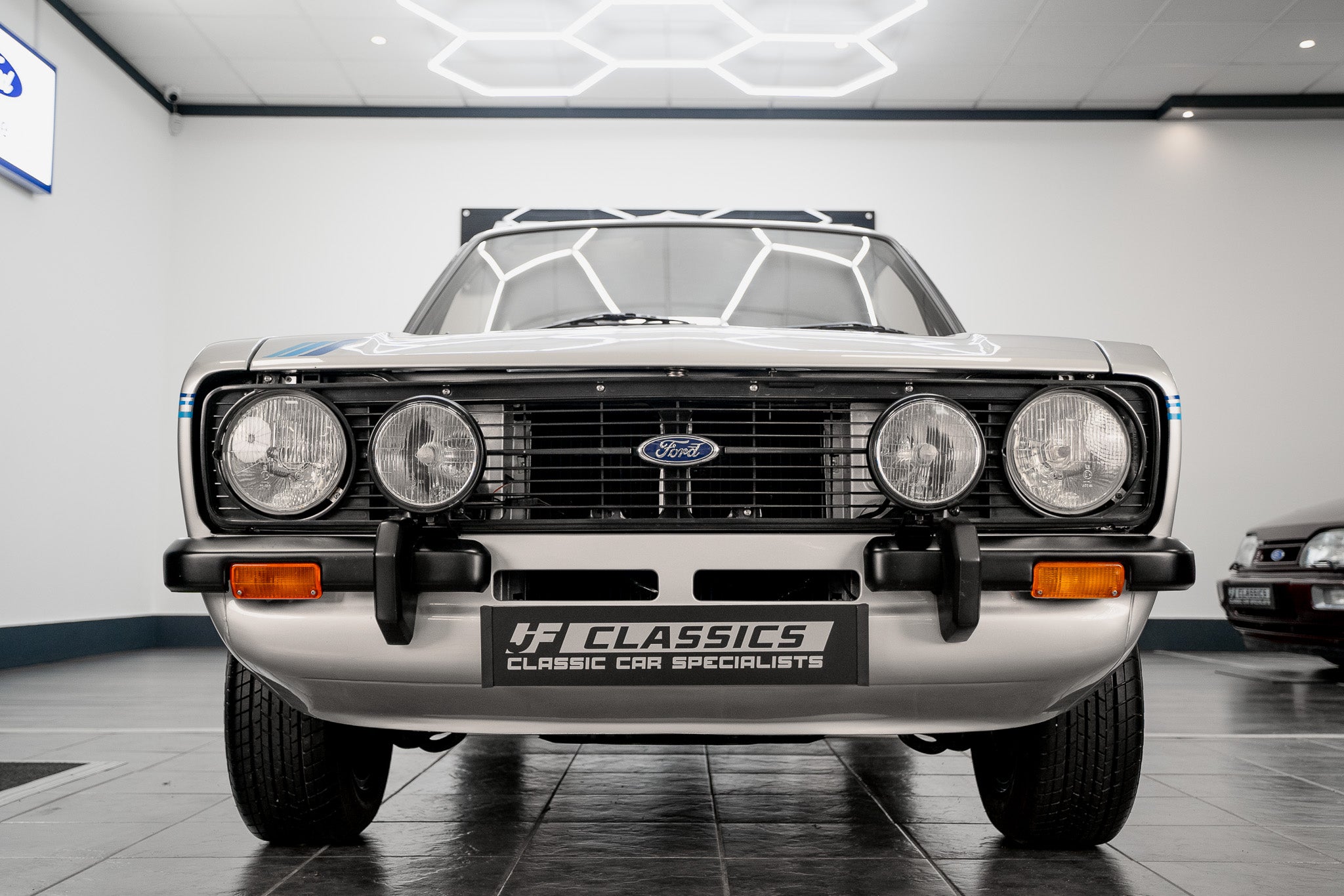 This Mk2 Harrier presents with an exceptionally well-preserved exterior that reads as both authentic and highly desirable. Finished in the optional dealer Strato Silver, the paint displays a uniform gloss shine from nose to tail and the panel gaps are pin-sharp throughout a clear sign of careful ownership and correct preservation. At the front a bold black-slatted grille sits proudly, perfectly centred with the blue-oval Ford badge, and the original Hella headlamps remain crystal clear and entirely free from chips or damage. The front corner bumpers sit true and unmarked, flowing into the body with factory precision.
