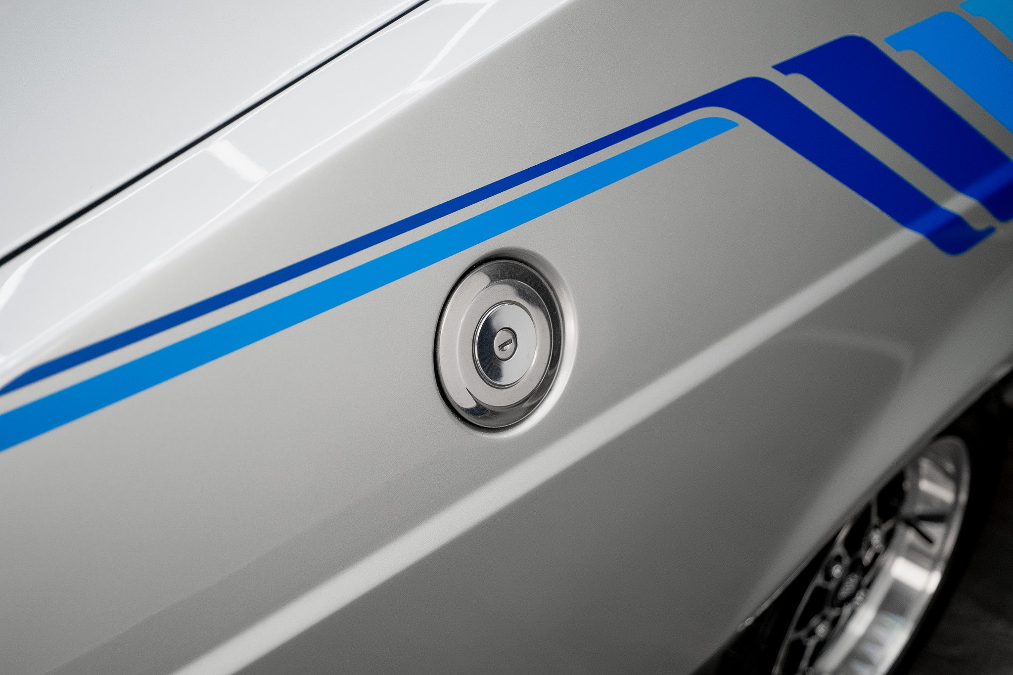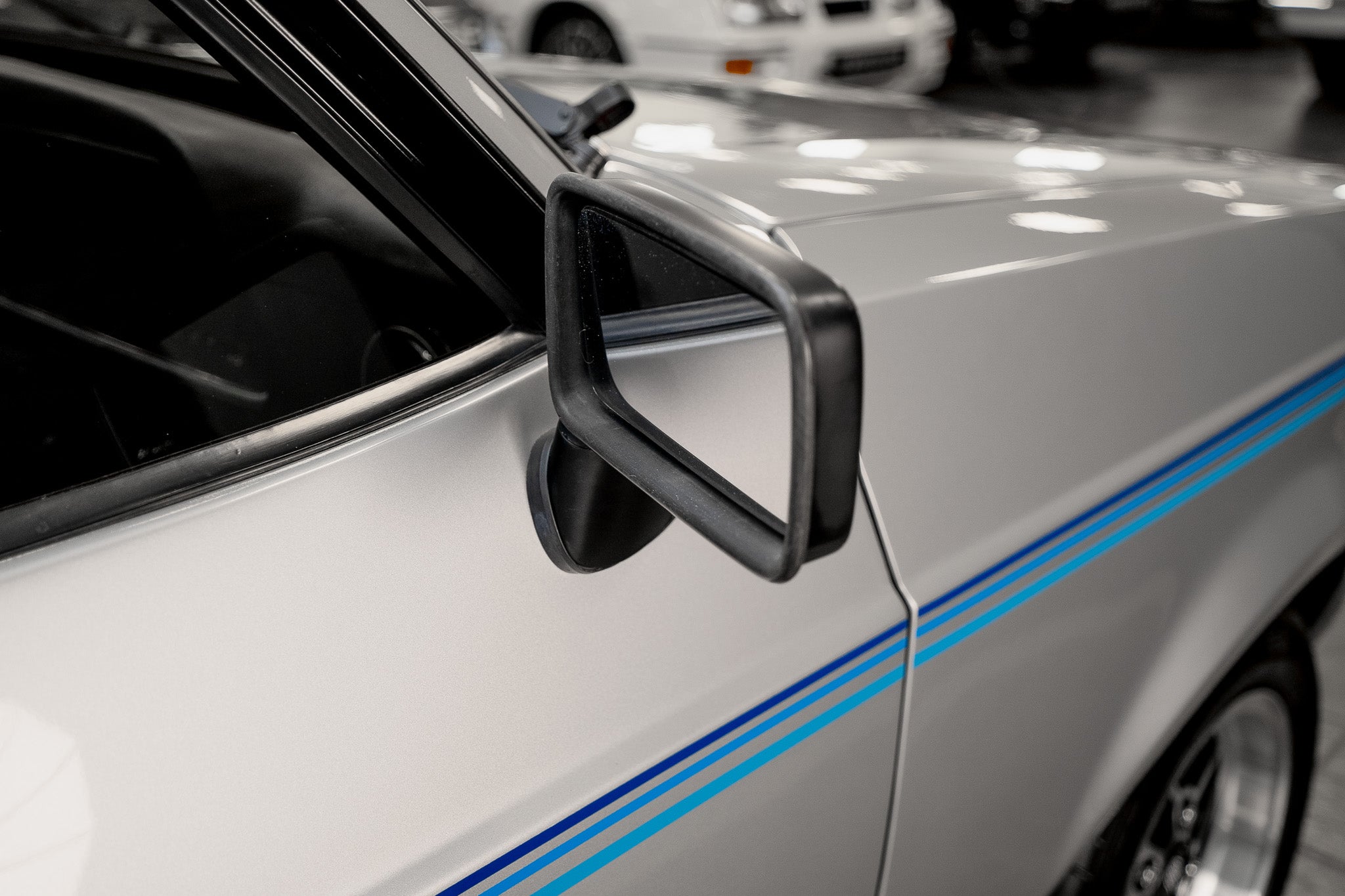 Running the length of each flank are the Harrier’s unique three-tone blue body stripes, applied crisply and free from lifting or discolouration, giving the car its distinctive and correct period appearance. All external trims and badging are clean, crisp and correctly positioned, the door-mounted rear view mirrors retaining their original fit and finish