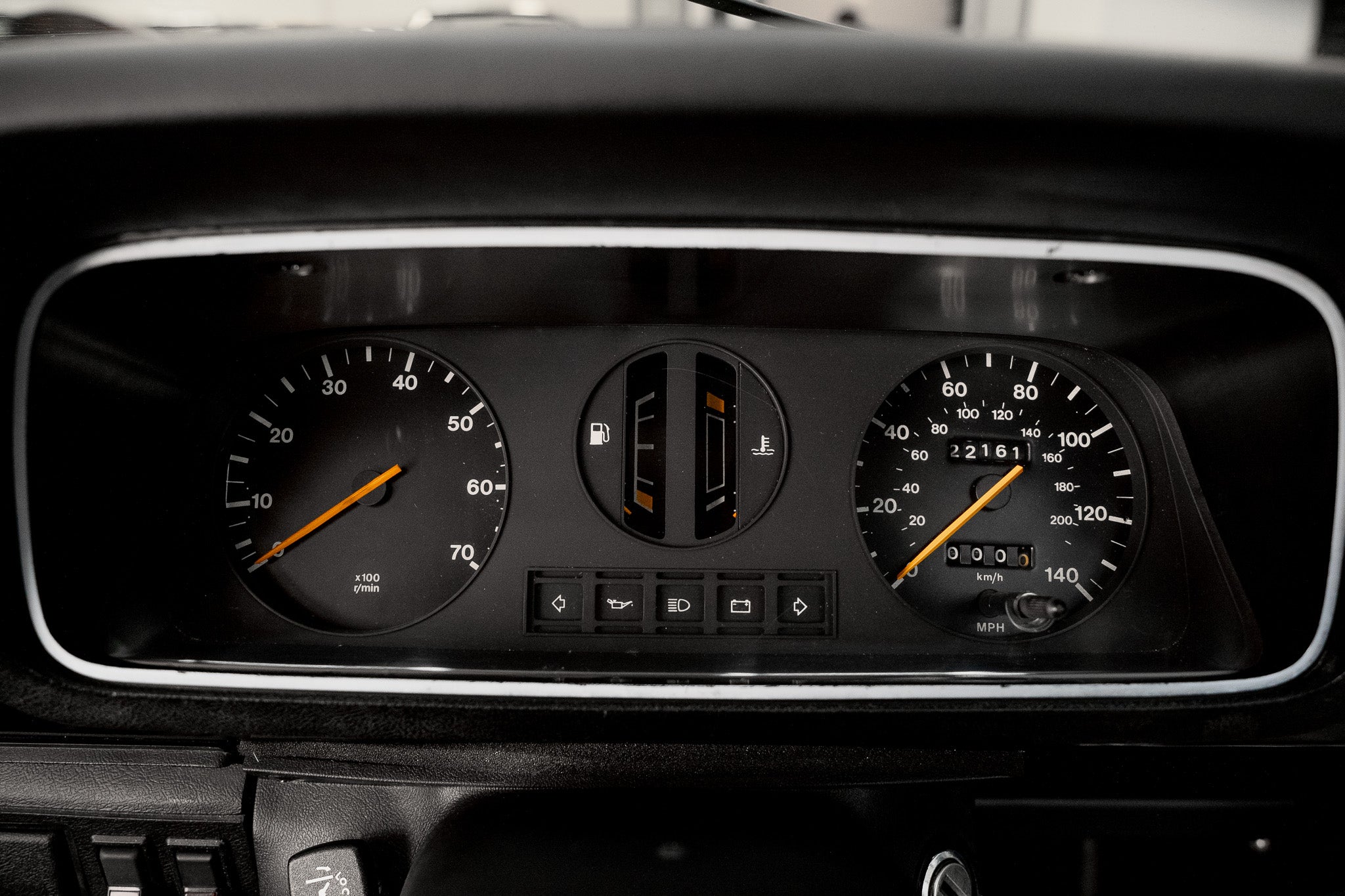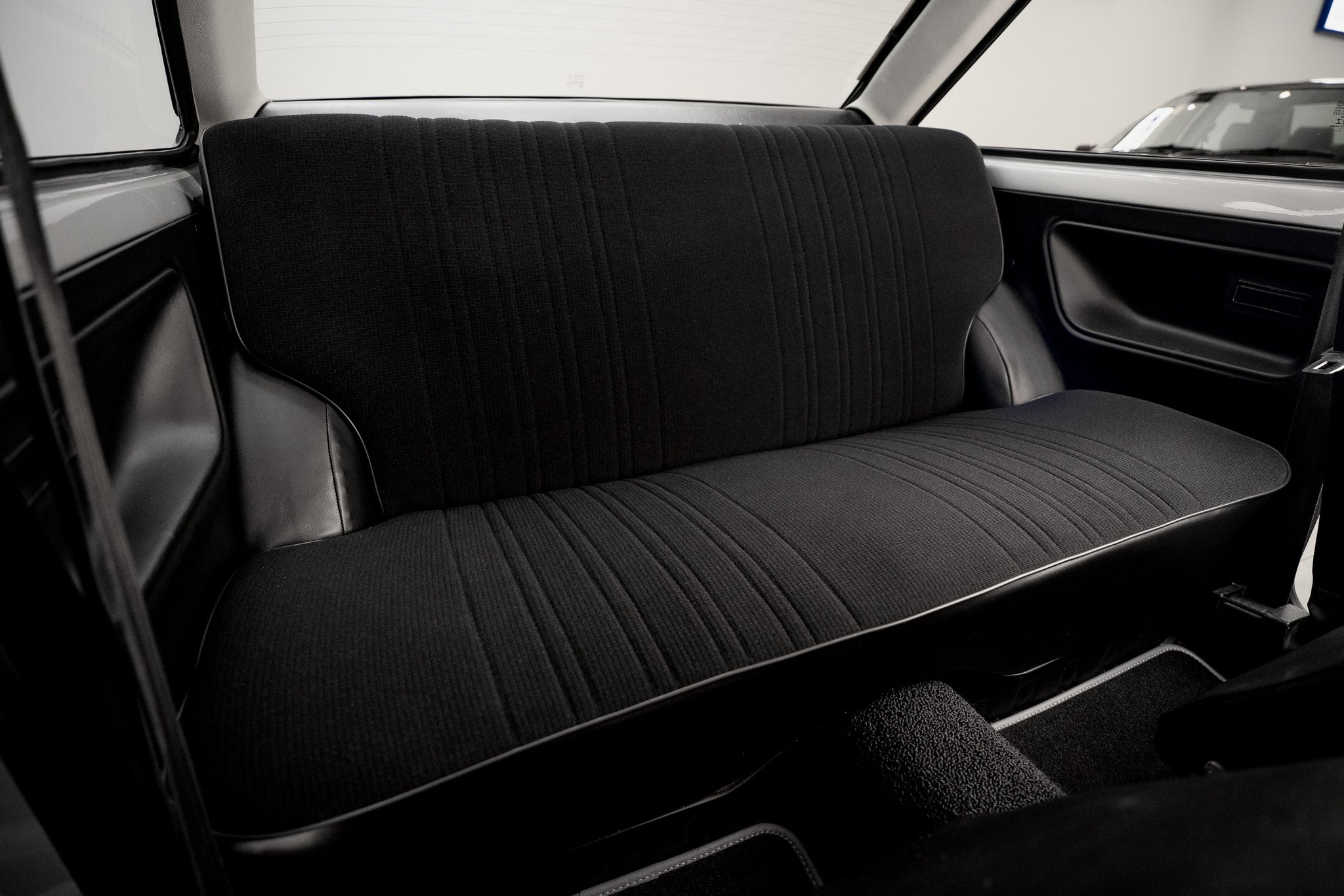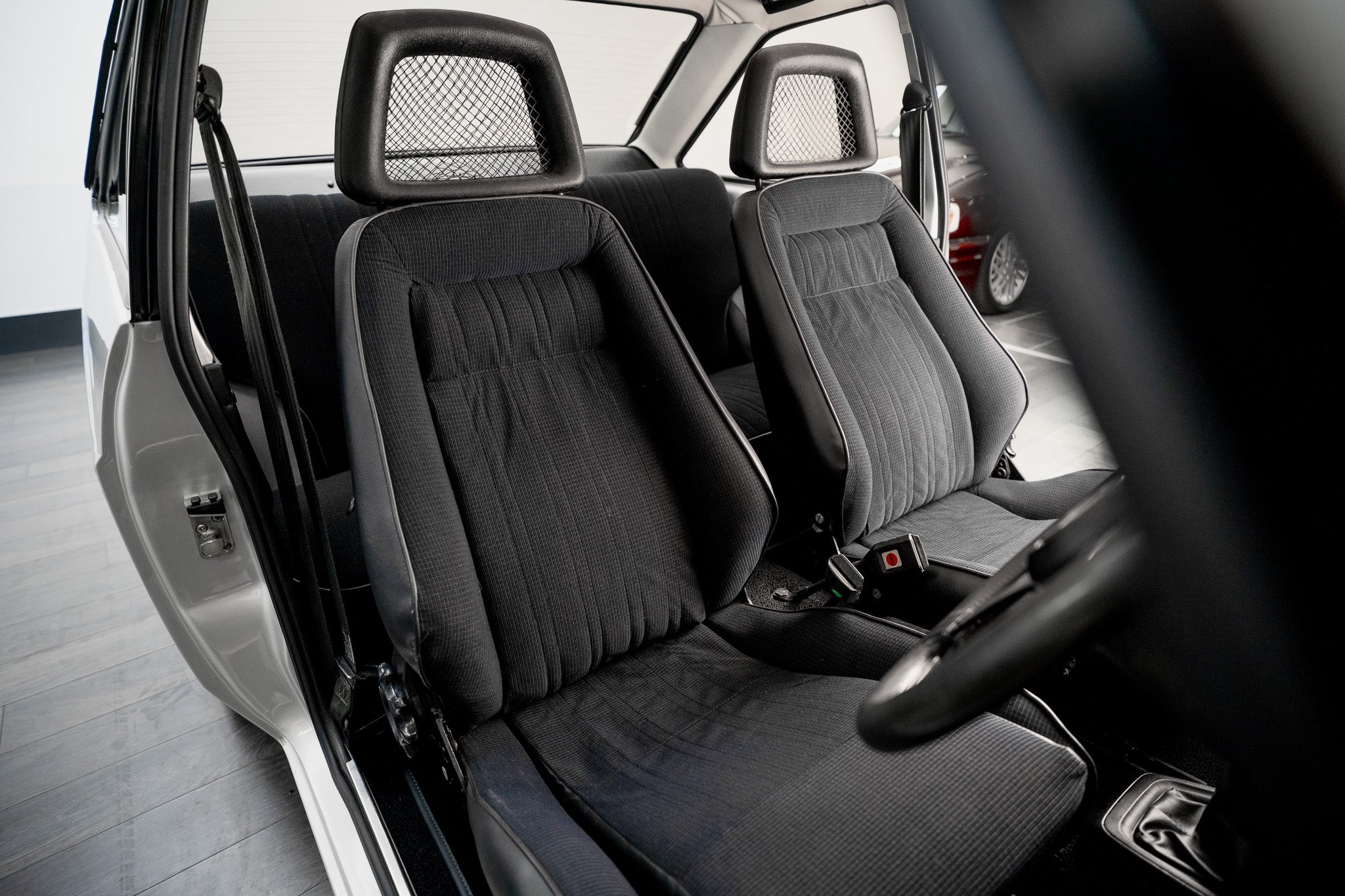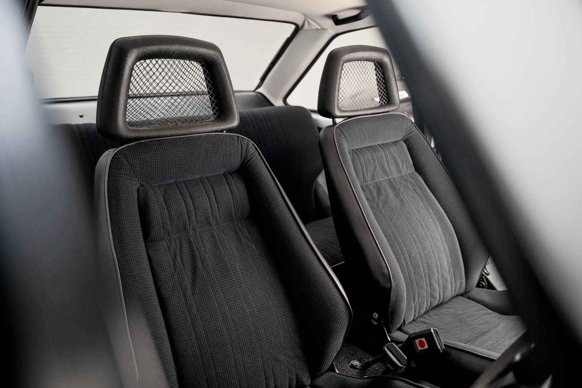 Iconic fishnet front headrests sit proudly atop the seats, and the rear bench is unmarked, looking as though it has seen minimal use over the past four decades. Both the front tilt mechanism and the rotary seat-adjustment wheel operate correctly, allowing smooth movement and confirming the car’s unmolested mechanical interior setup.