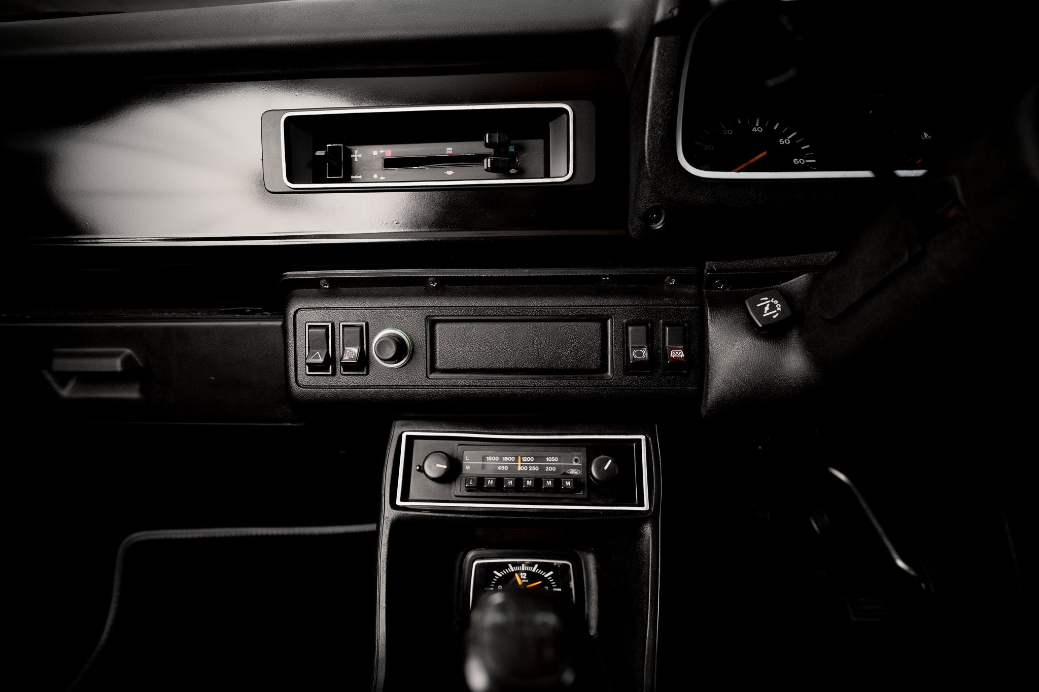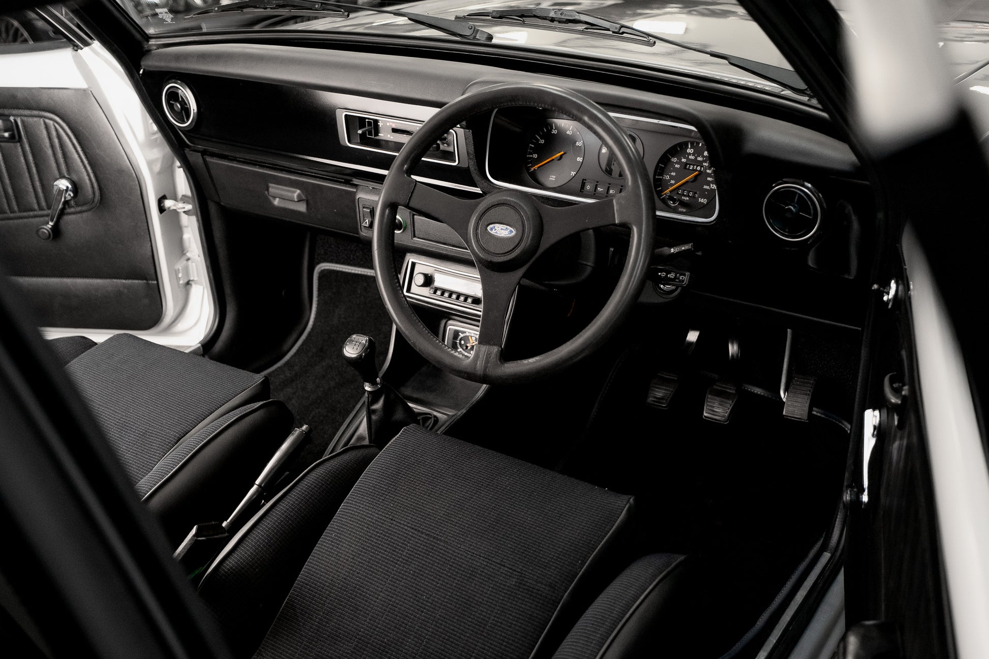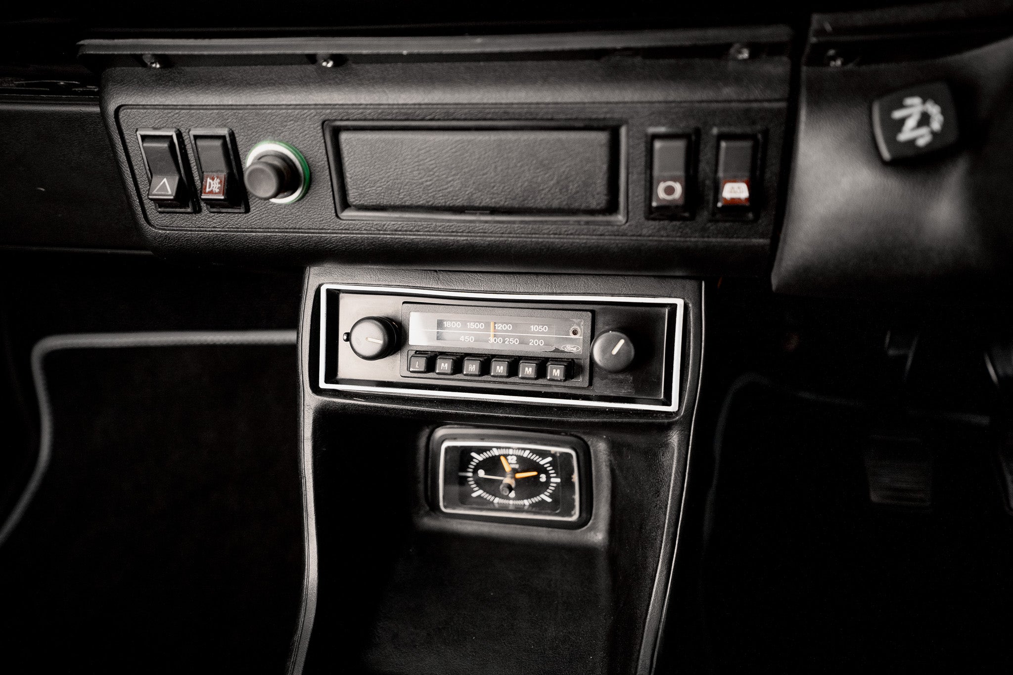 The dashboard remains as Ford intended minimalistic, functional, and full of seventies character. The glovebox sits low on the passenger side, with a round adjustable heater vent positioned just above. Slide-toggle ventilation controls sit centrally flanked by original push-button switchgear for hazards, rear screen heater, brake warning function and cigarette lighter all operating as expected. Ahead of the driver, the binnacle houses the essentials with clarity and simplicity tachometer to the left, fuel and temperature gauges centrally placed, and the speedometer to the right showing 22,161 miles. All obligatory warning lights illuminate and extinguish correctly on start-up. A final round heater vent to the right side completes a dashboard that is refreshingly honest, original and free from unnecessary modification.